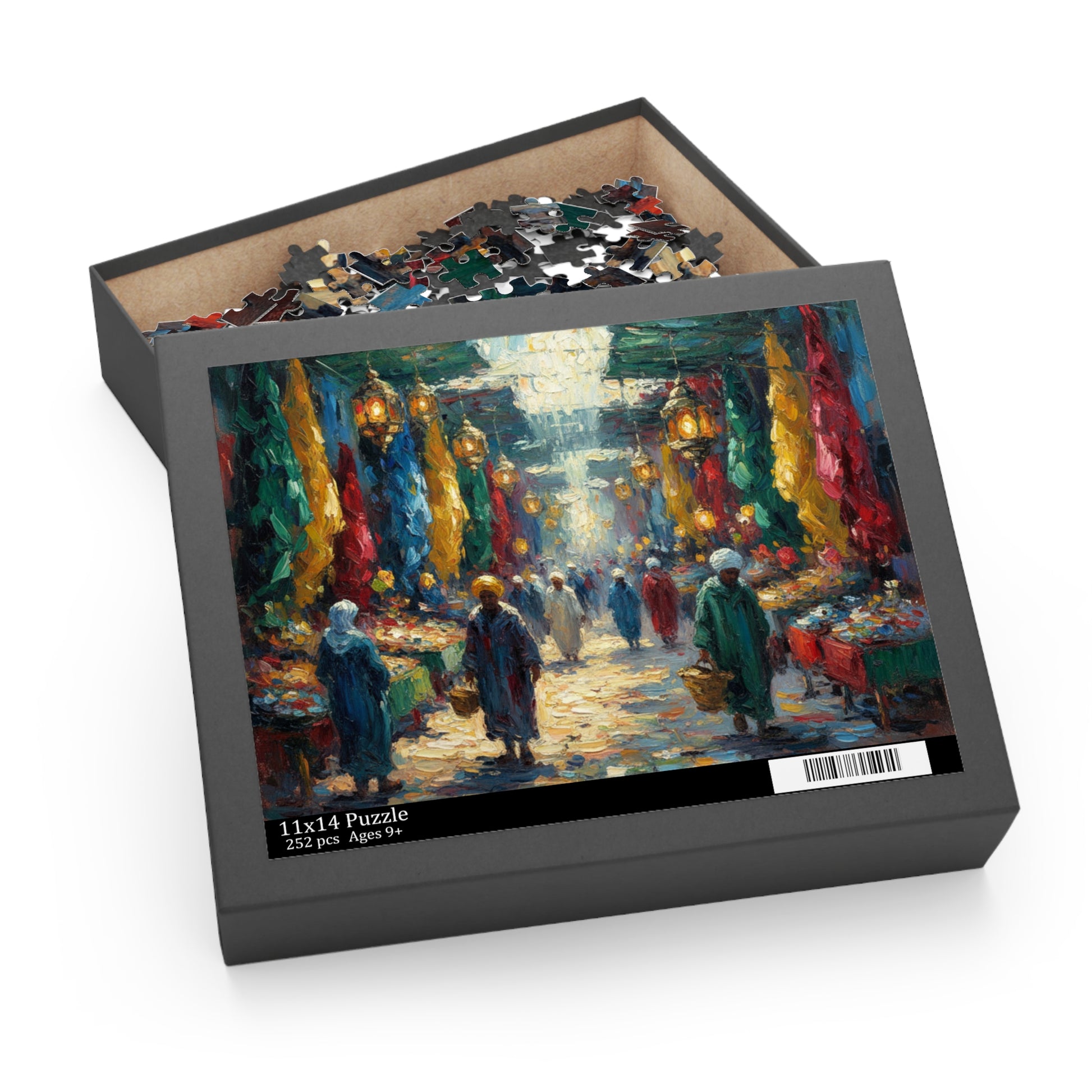 Walk into a sunlit market where color and movement collide. This puzzle transforms an impressionistic street scene into a tactile, slow-down experience: lanterns glow overhead, fabric stalls sway in jewel tones, and figures drift through a warm, leaf-strewn pathway. Each piece reveals brushstrokes and glossy highlights that make the finished image feel like a painting you can hold. Lay it out on the table for a quiet afternoon, return to it between conversations, or finish it together while tea steams nearby. It’s the kind of scene that invites curiosity and calm — a small escape to a bustling, beautiful moment.