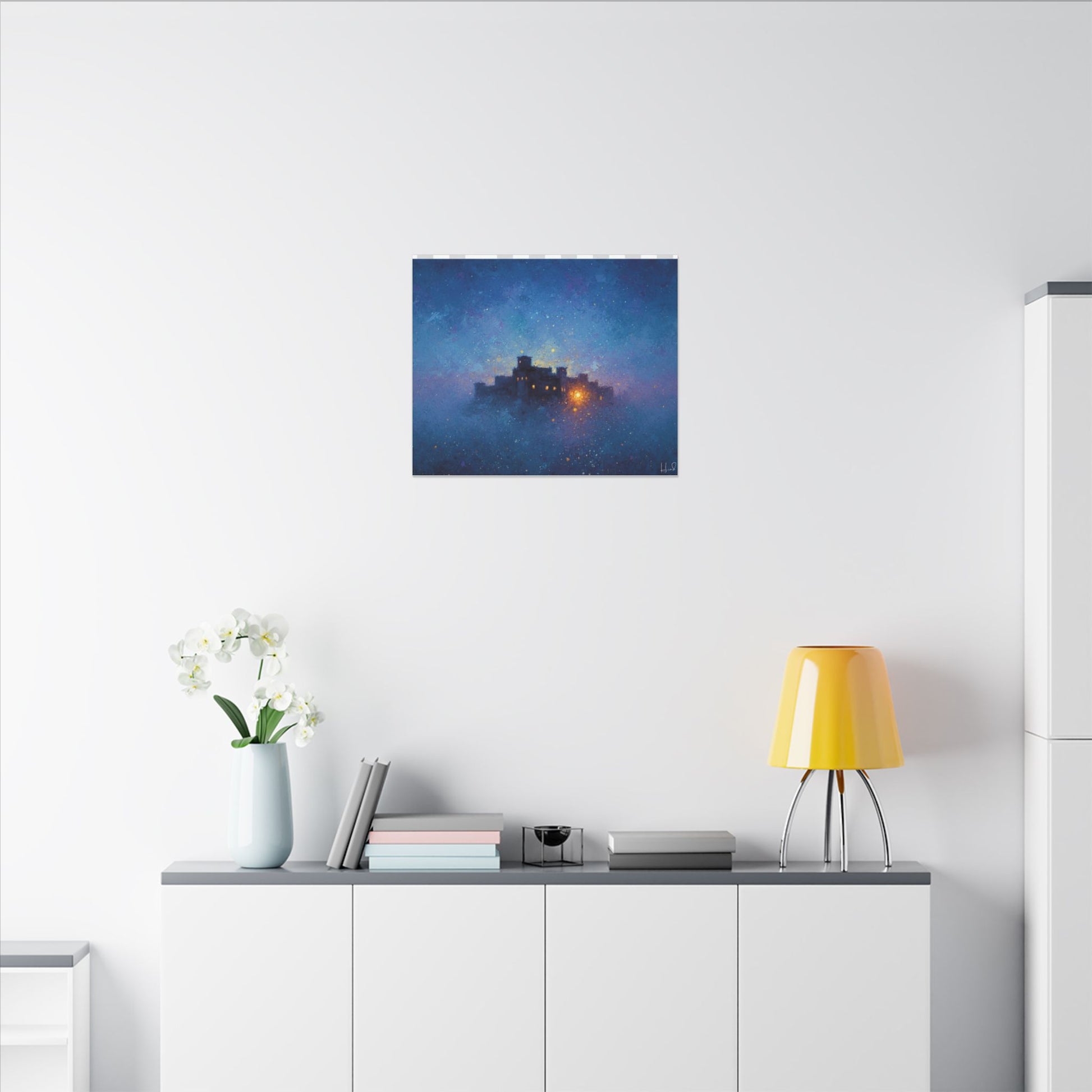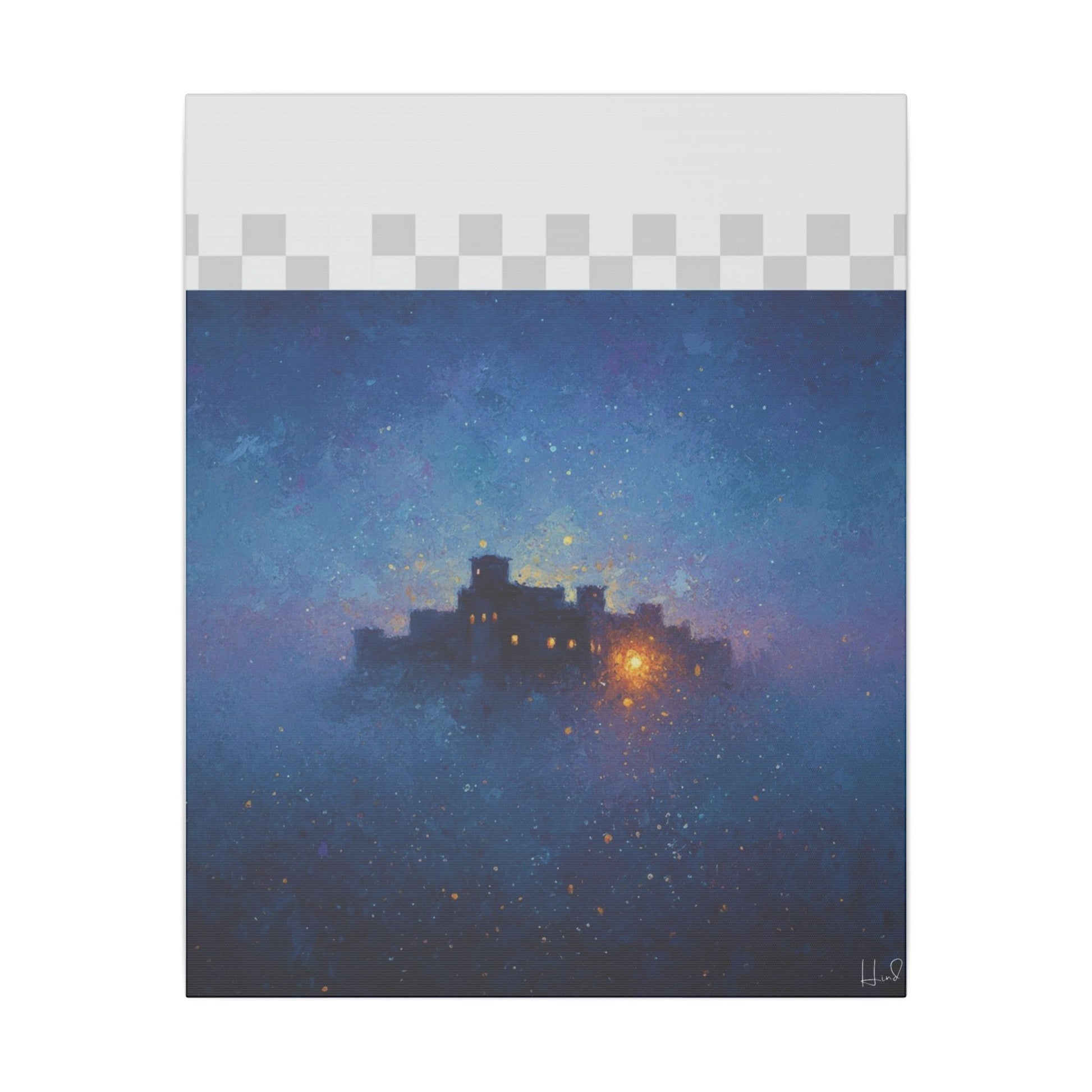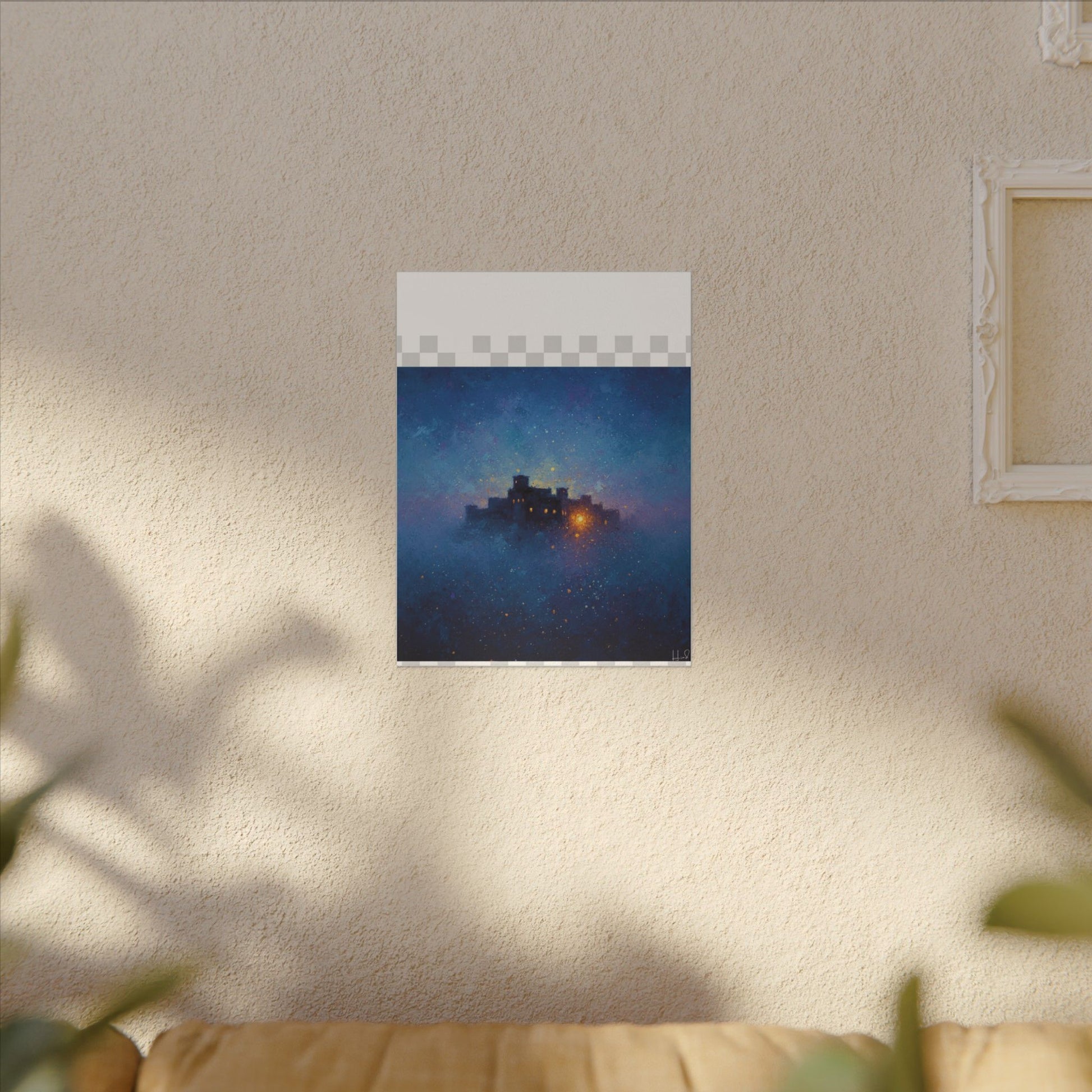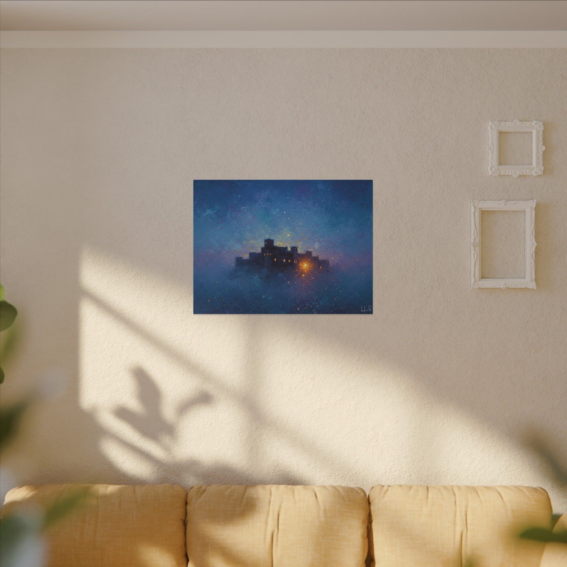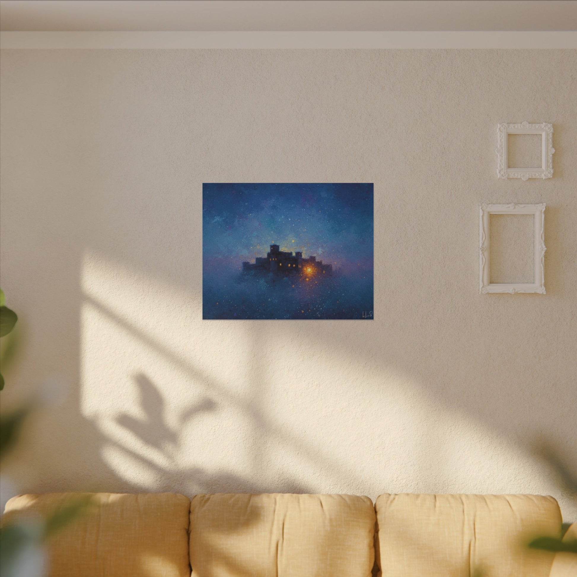 Une toile mate tendue qui transporte un ciel étoilé et paisible sur vos murs. Des bleus profonds et des violets doux parcourent sa surface, encadrant une citadelle lointaine et lumineuse dont la douce lueur évoque histoires, réconfort et abri. La finition mate texturée atténue les reflets et laisse s'exprimer les détails picturaux et les subtiles concrétions étoilées. Légère et robuste, elle est livrée prête à être accrochée et crée une ambiance contemplative et cinématographique dans les chambres, les coins lecture et les salons.