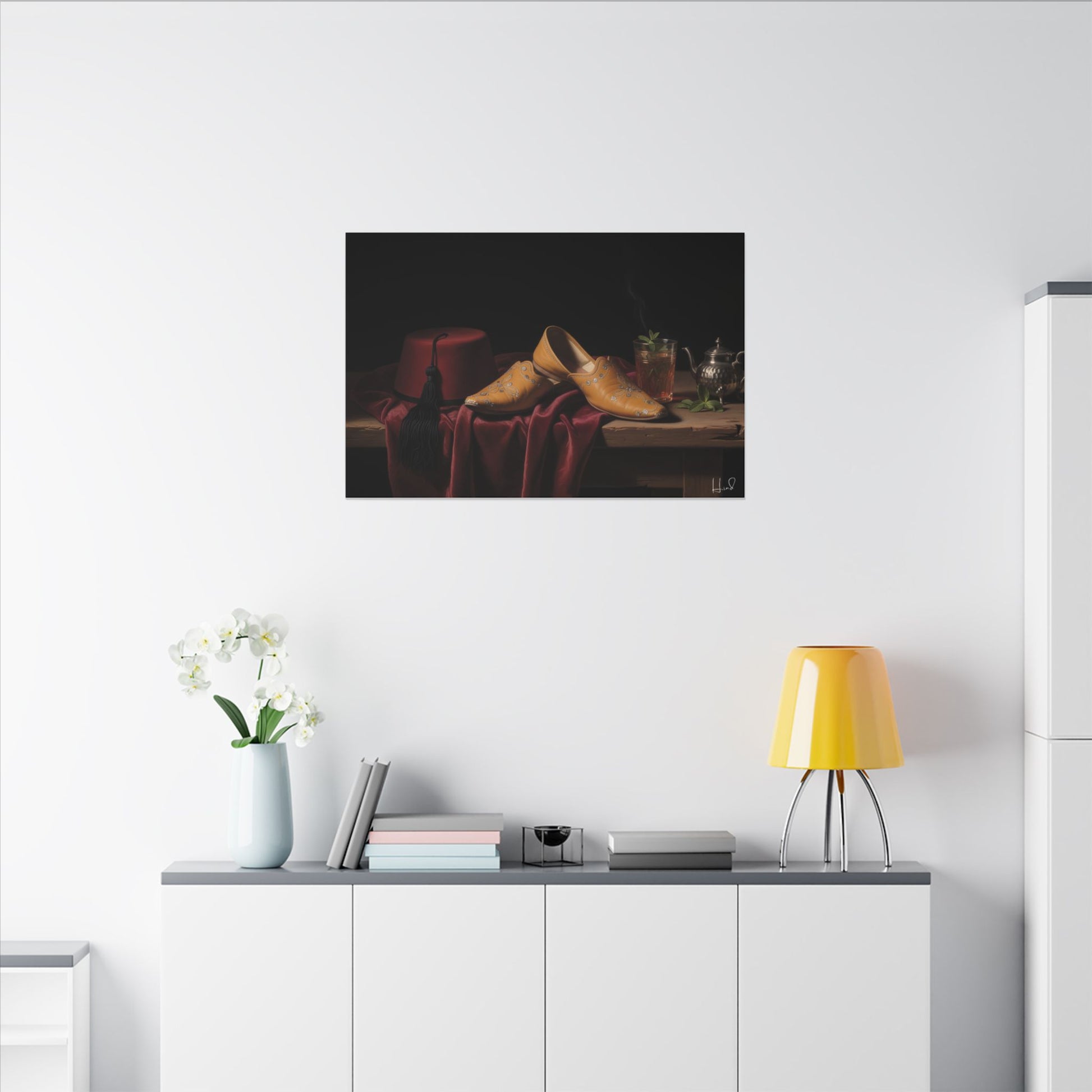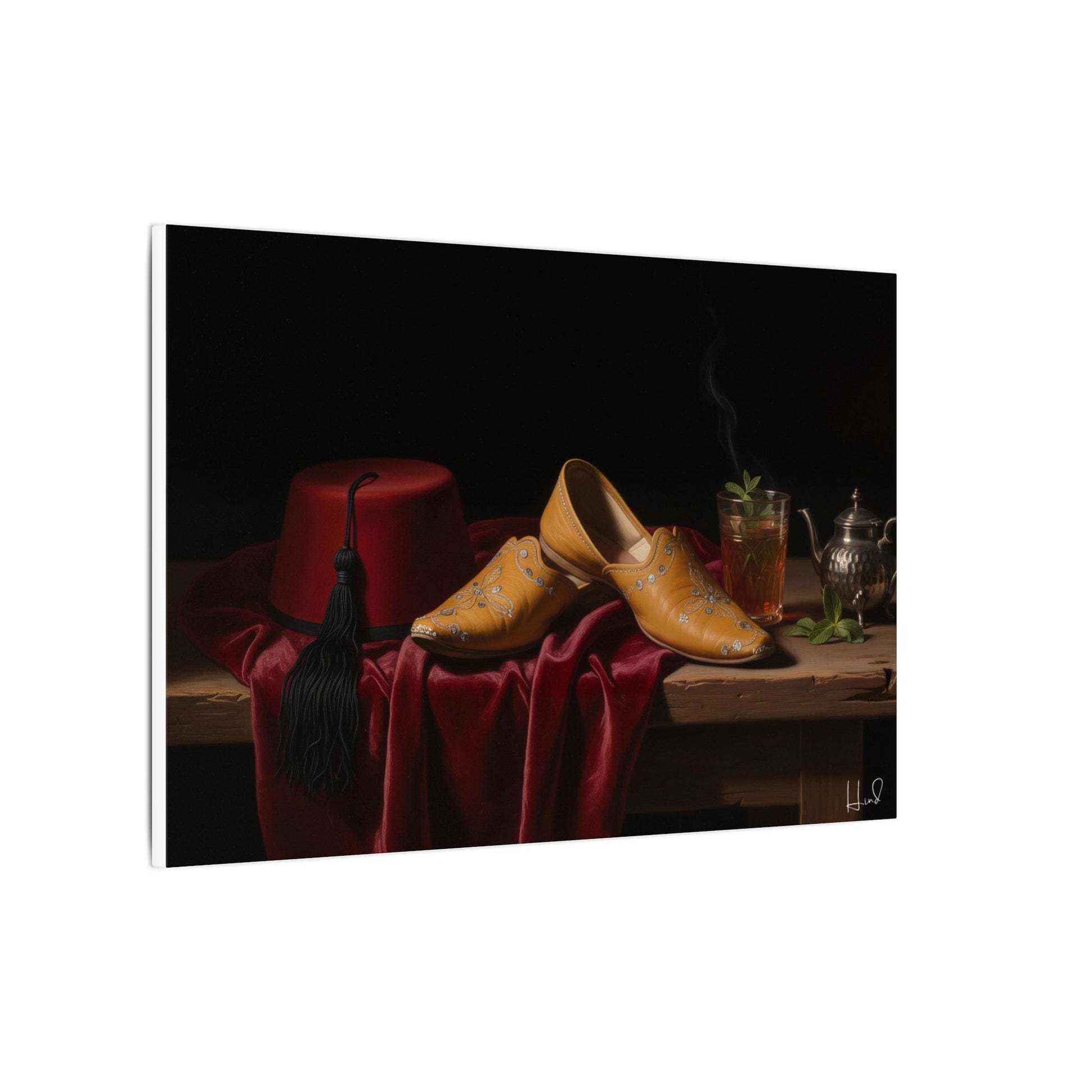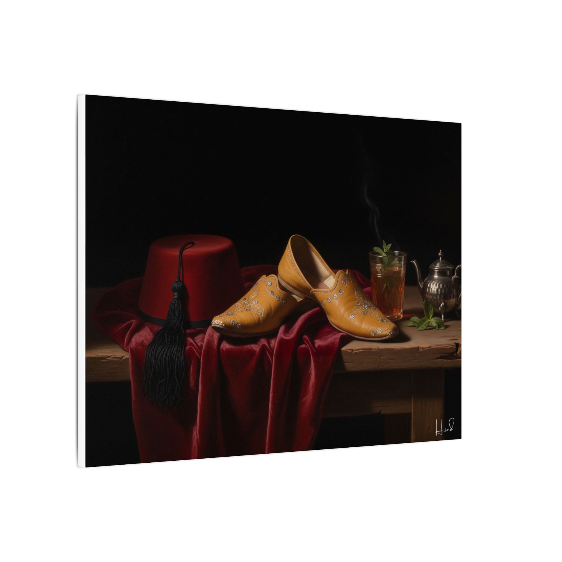 Une nature morte empreinte de sérénité, immortalisée sur une toile mate de haute qualité : des chaussures en cuir chaud, un fez à pompons et un verre fumant reposent sur une table en bois patiné, recouverte d'un tissu rouge profond. L'image attire le regard vers une lumière douce et picturale, et une texture riche, conférant aux murs une atmosphère intemporelle et intime. Imprimée avec des encres latex écologiques sur une toile résistante en coton-polyester et tendue à la main sur un fin châssis en pin de 1,9 cm d'épaisseur, cette œuvre se lit comme un fragment de récit : des soirées de conversations feutrées, la vapeur du thé se mêlant à la lumière d'une lampe, et le poids réconfortant d'objets chargés d'histoire. Son profil fin et sa finition mate douce lui permettent de s'intégrer harmonieusement dans un coin lecture, un salon, un mur de galerie ou au-dessus d'une cheminée, invitant à la contemplation et à une douce chaleur tactile.
