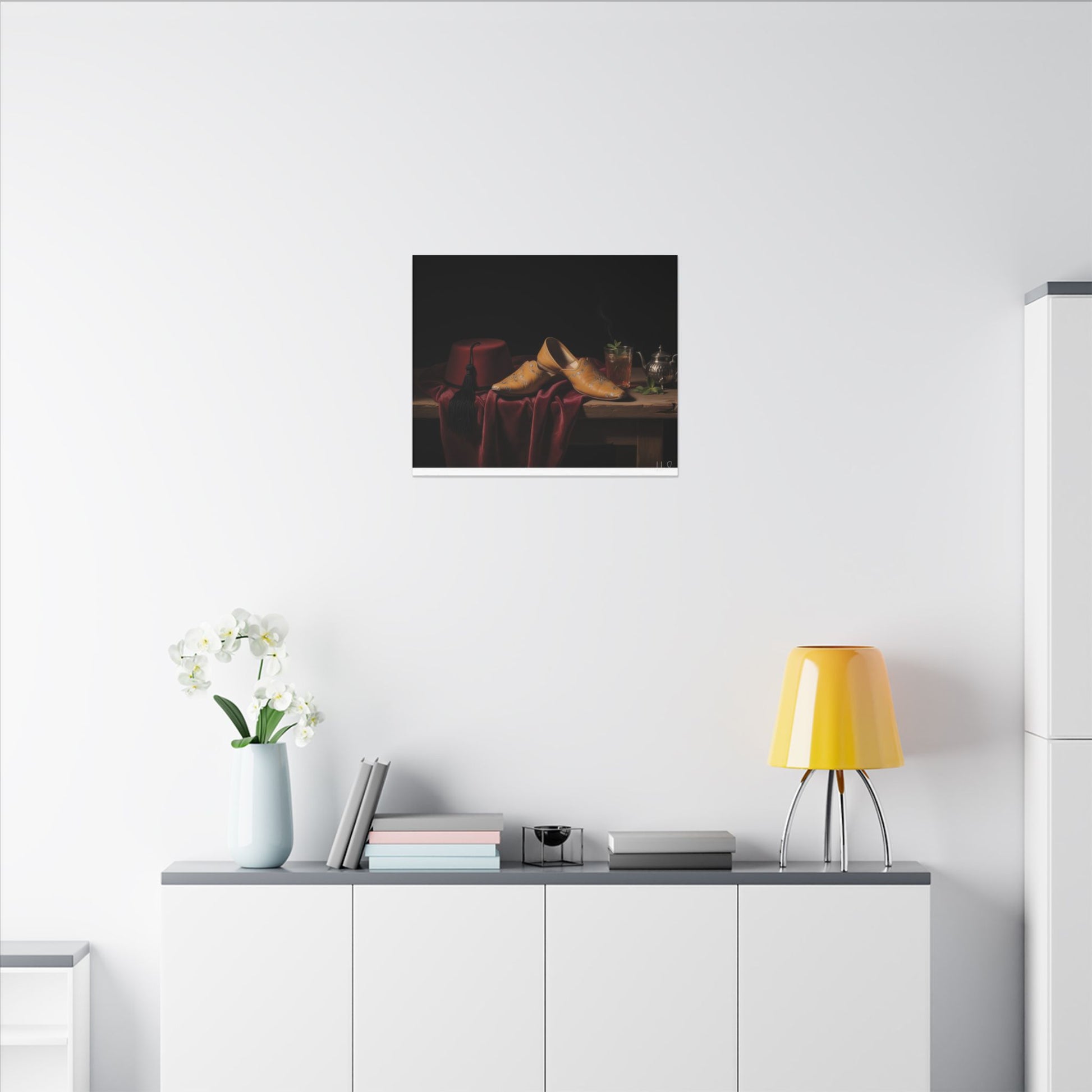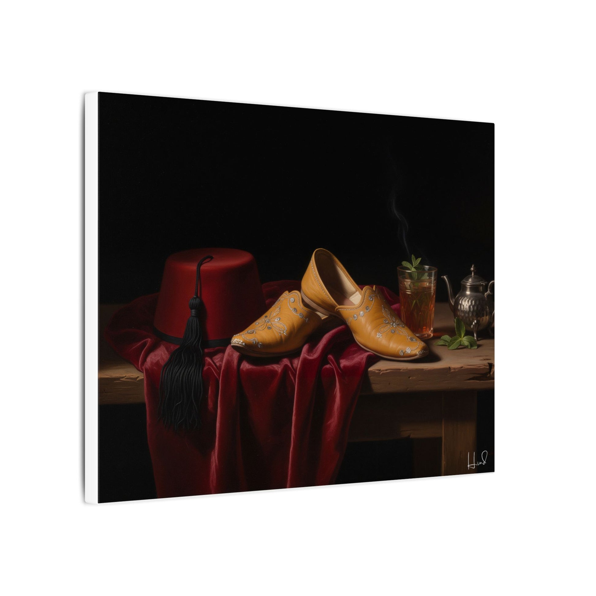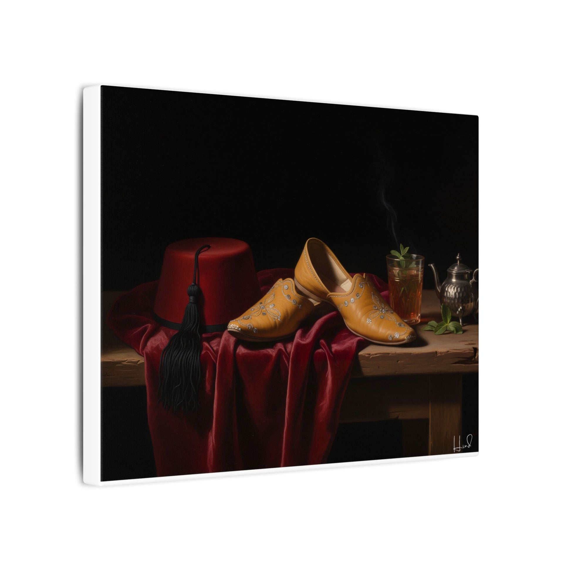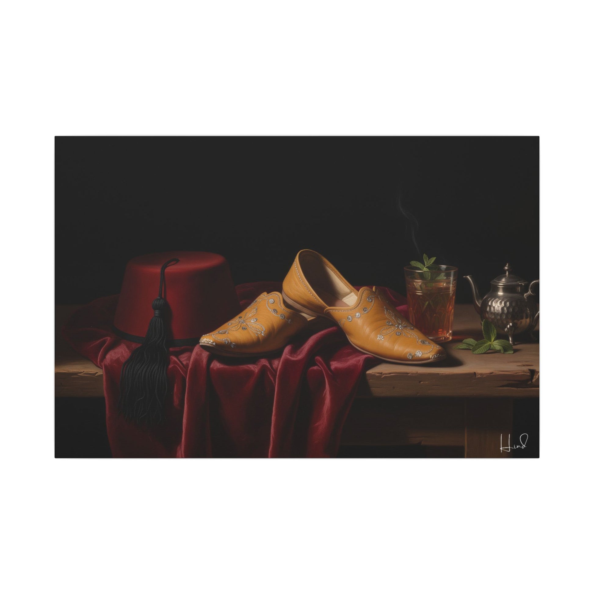 Une nature morte empreinte de sérénité, immortalisée sur une toile mate de haute qualité : des chaussures en cuir chaud, un fez à pompons et un verre fumant reposent sur une table en bois patiné, recouverte d'un tissu rouge profond. L'image attire le regard vers une lumière douce et picturale, et une texture riche, conférant aux murs une atmosphère intemporelle et intime. Imprimée avec des encres latex écologiques sur une toile résistante en coton-polyester et tendue à la main sur un fin châssis en pin de 1,9 cm d'épaisseur, cette œuvre se lit comme un fragment de récit : des soirées de conversations feutrées, la vapeur du thé se mêlant à la lumière d'une lampe, et le poids réconfortant d'objets chargés d'histoire. Son profil fin et sa finition mate douce lui permettent de s'intégrer harmonieusement dans un coin lecture, un salon, un mur de galerie ou au-dessus d'une cheminée, invitant à la contemplation et à une douce chaleur tactile.