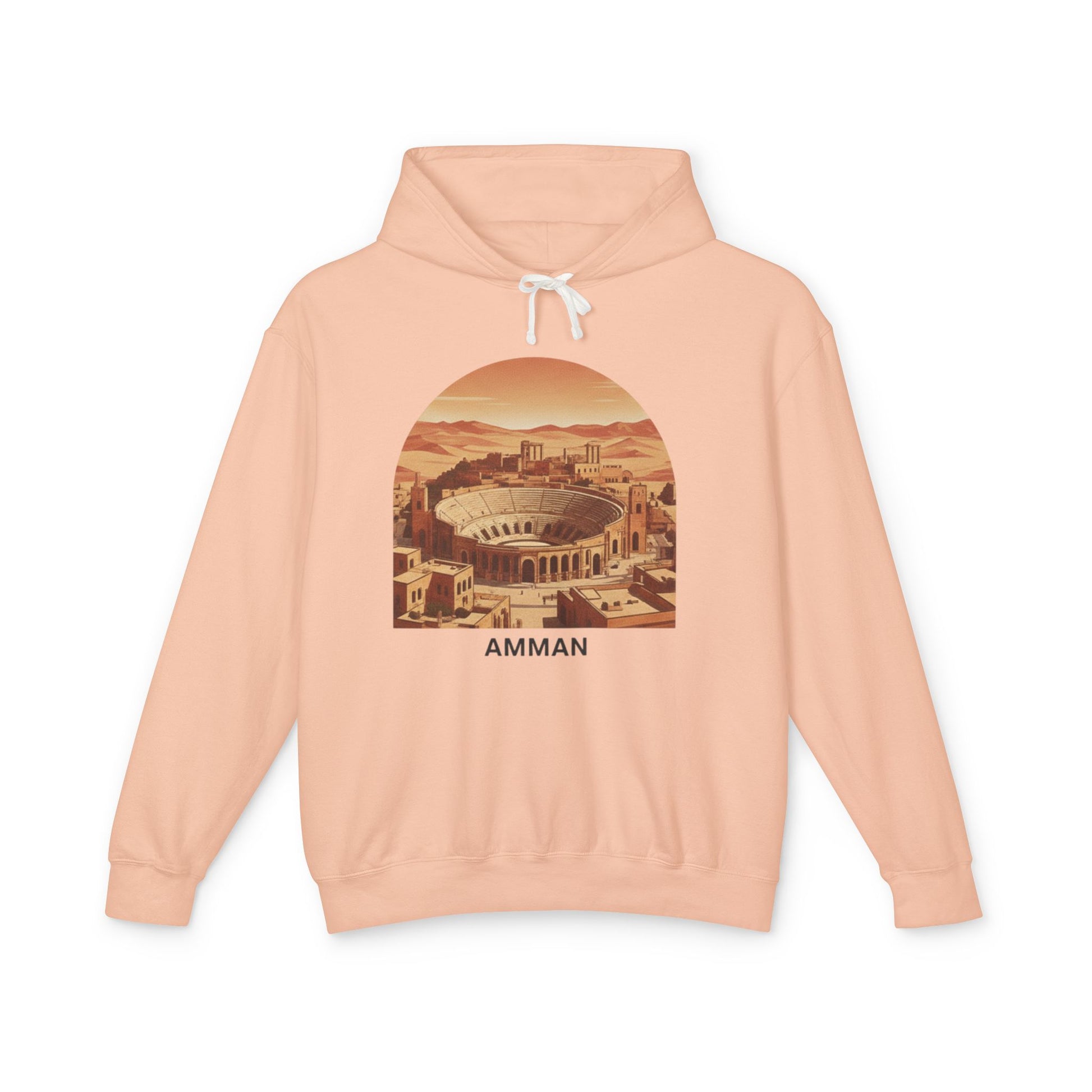 This lightweight hooded sweatshirt carries a soft, sun-warmed portrait of Amman across the chest — muted terracotta tones, ancient stone arches, and a skyline that feels like a quiet afternoon in the city. The relaxed silhouette and jersey-lined hood make it feel lived-in from the first wear, while the light, breathable cotton keeps it easy to layer on cooler mornings or breezy nights. Slip it on for wandering open-air markets, late-night coffee runs, or when you want a wearable reminder of a city that blends history and calm modern rhythm.
