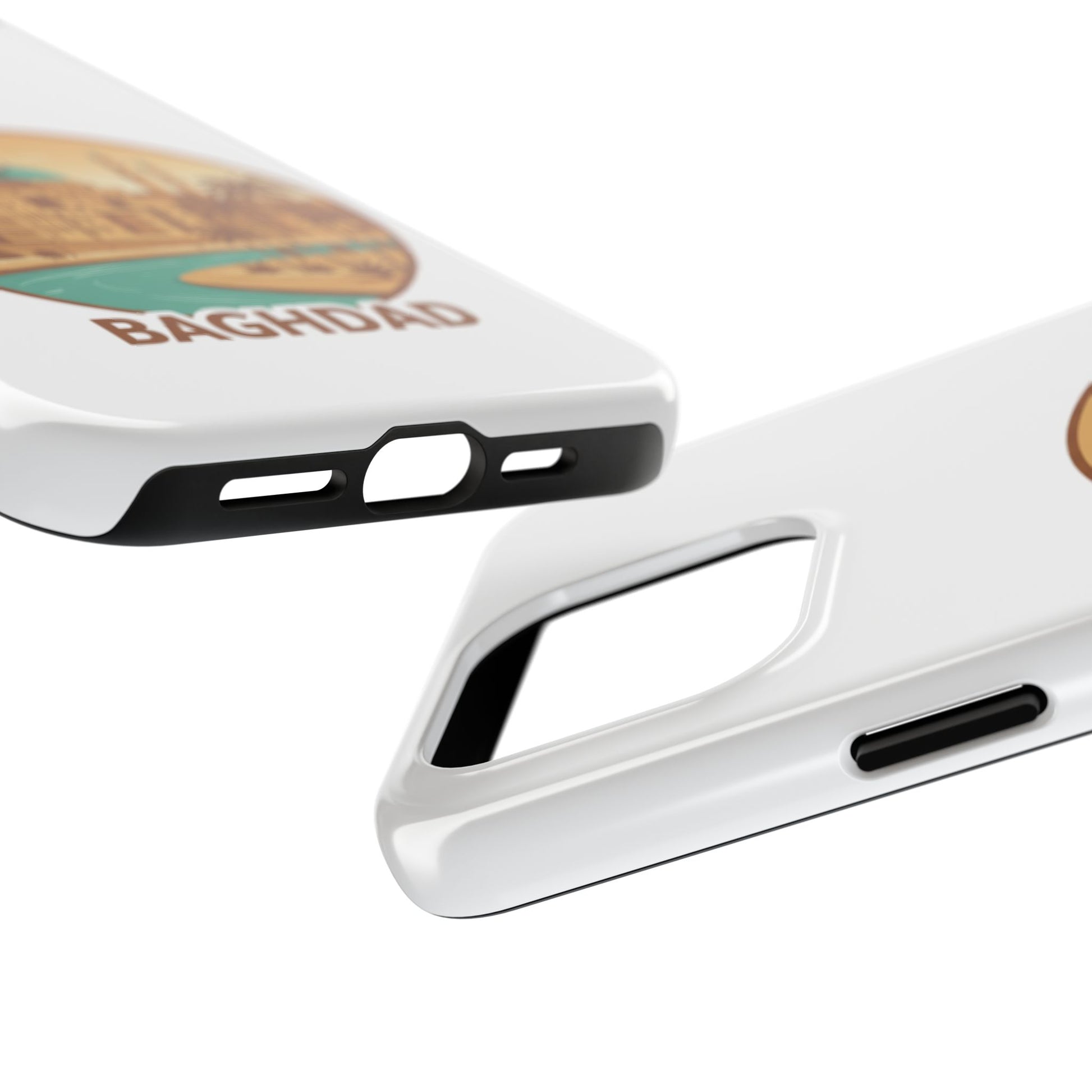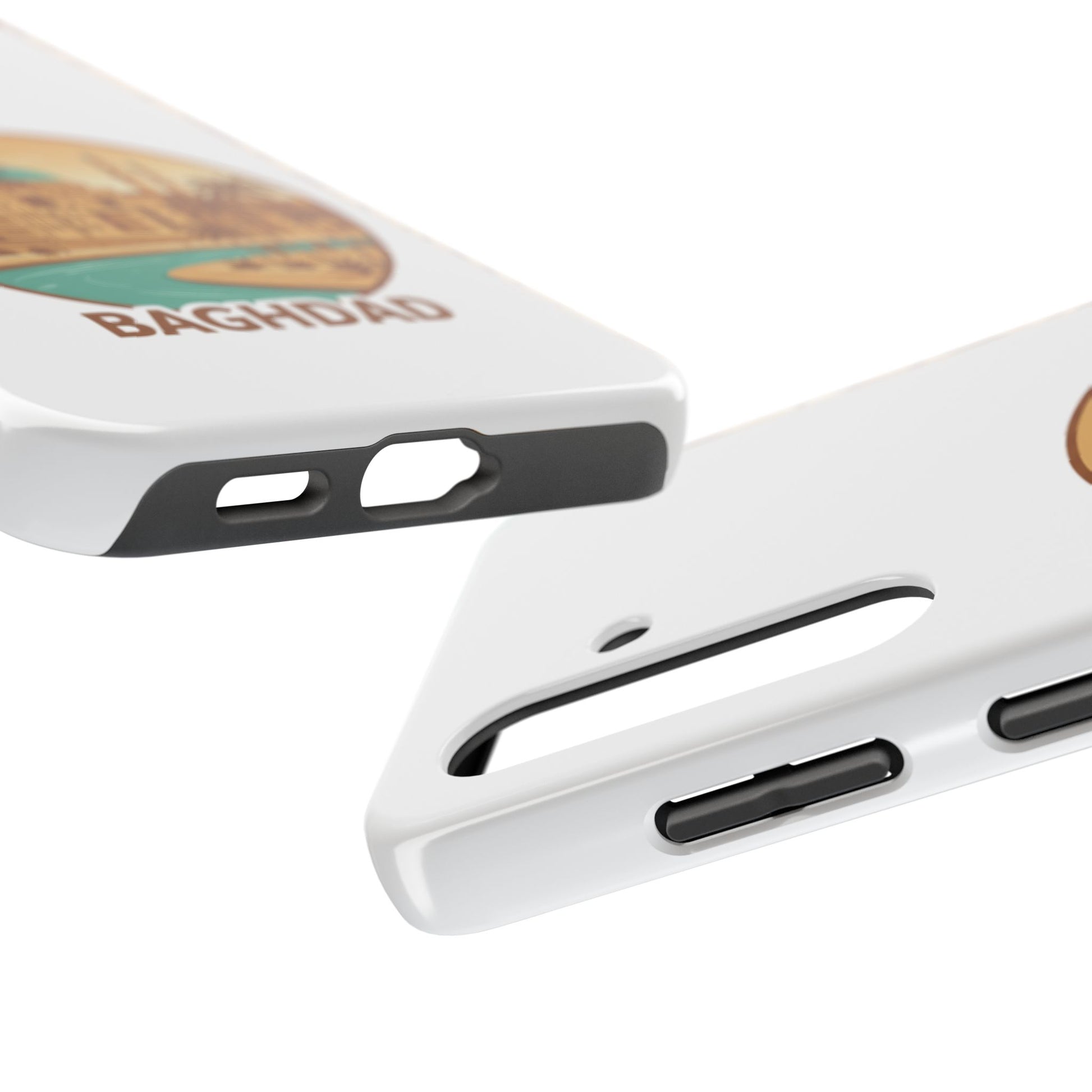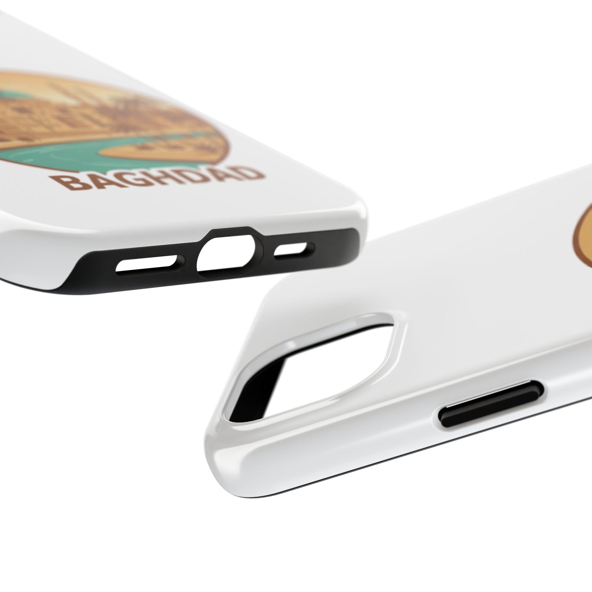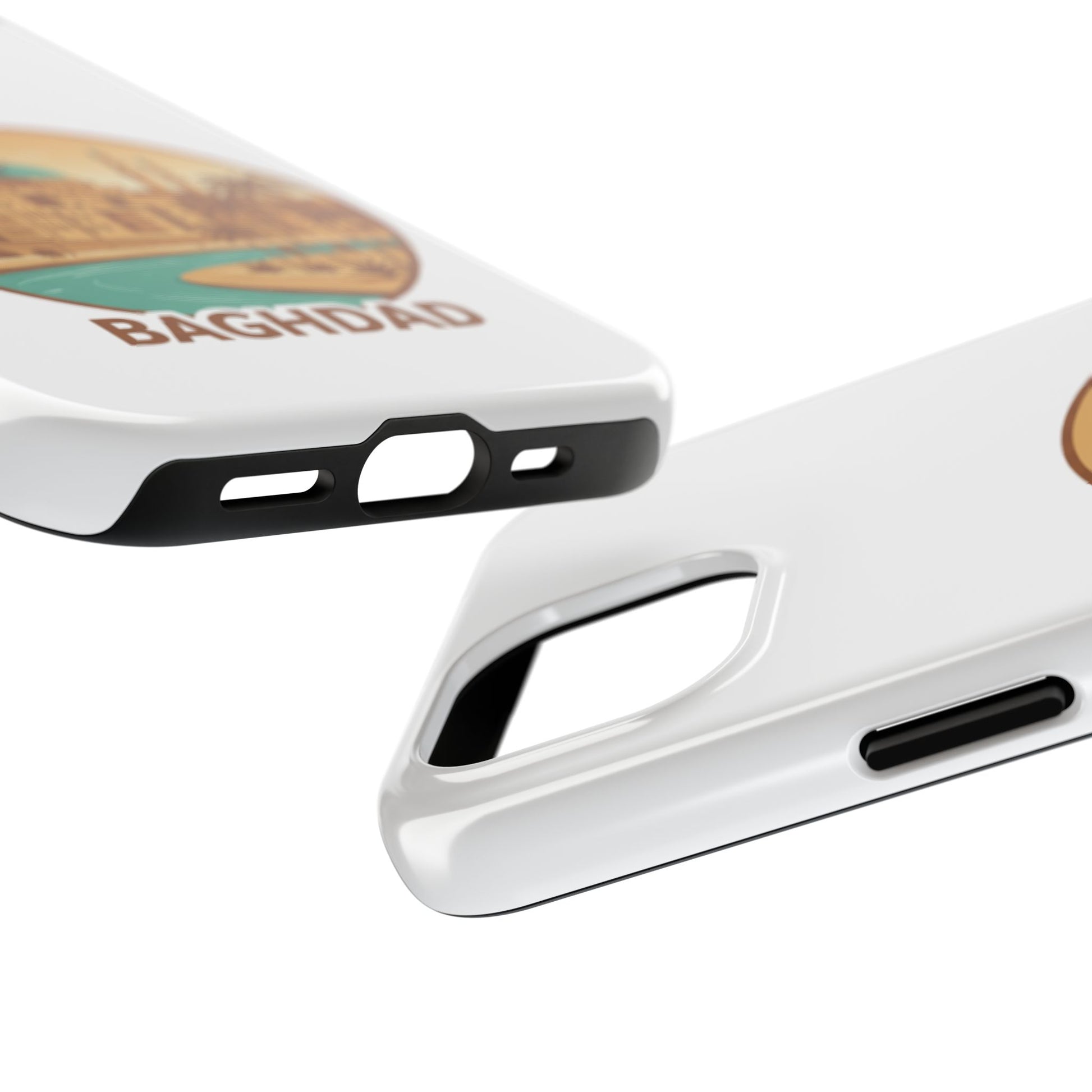 Carry a slice of Baghdad with you every day. This sturdy phone case blends vintage travel-poster charm with modern protection: a warm, sepia-toned illustration of domes, minarets, palm trees and a winding river sits inside a circular frame, labeled ‘BAGHDAD’ in retro lettering. It feels nostalgic and calm — the kind of piece a traveler or someone with ties to the city would reach for when they want comfort and connection. The glossy finish makes the colors pop, while the slim profile keeps your phone easy to slip into a pocket. Wear your story, remember a place, or give someone a quiet nod to home.