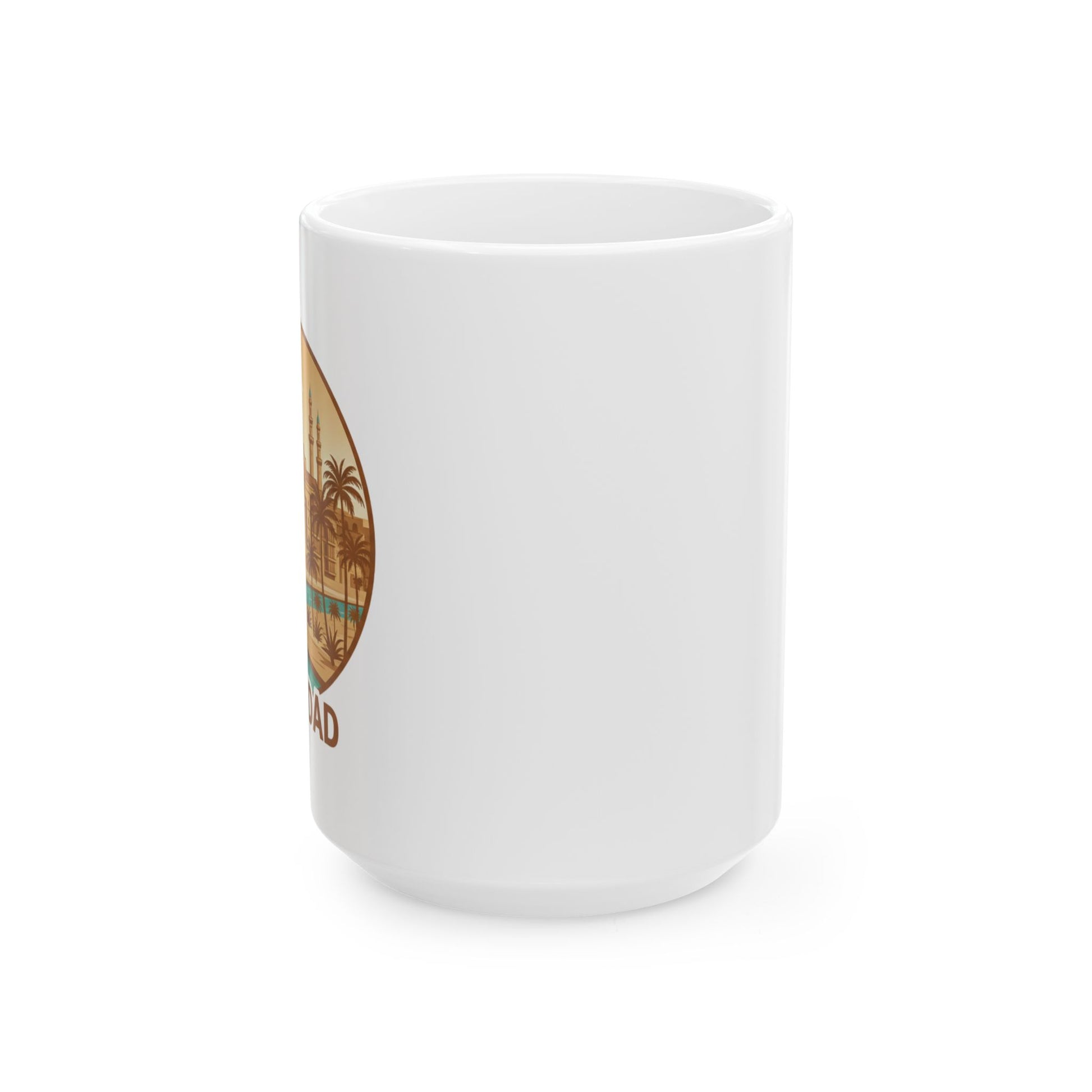 Warm, sunlit mornings by the river—this glossy ceramic mug carries a vintage-inspired Baghdad illustration that slips you into quiet streets lined with palm trees and domes. The soft sepia tones and pops of teal give the scene a travel-poster feel, making each sip feel like a brief escape to a place full of history and calm. It sits comfortably in hand with a C-handle and holds either a modest 11oz or a generous 15oz pour, so your tea or coffee lasts as long as the moment. Safe for everyday use — microwaveable, dishwasher-safe, and made from lead- and BPA-free ceramic — it’s built to brighten routines and hold up to daily life while showcasing vivid, lasting color.