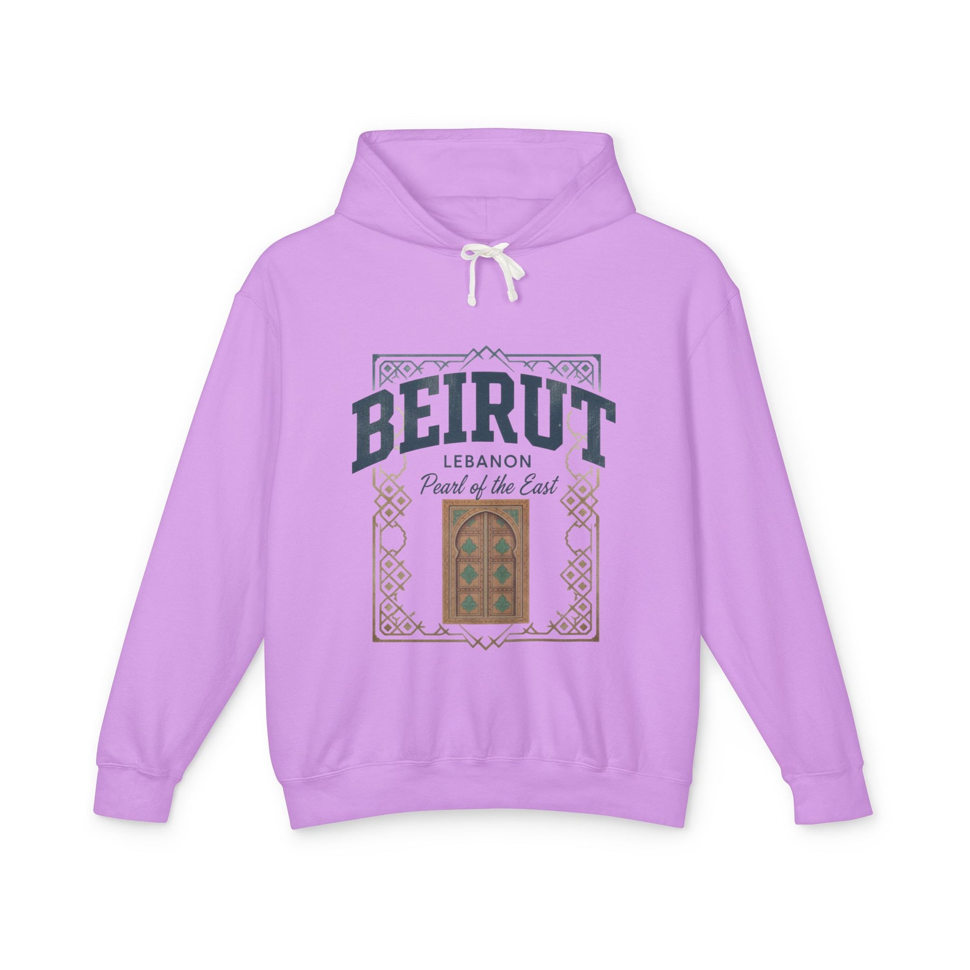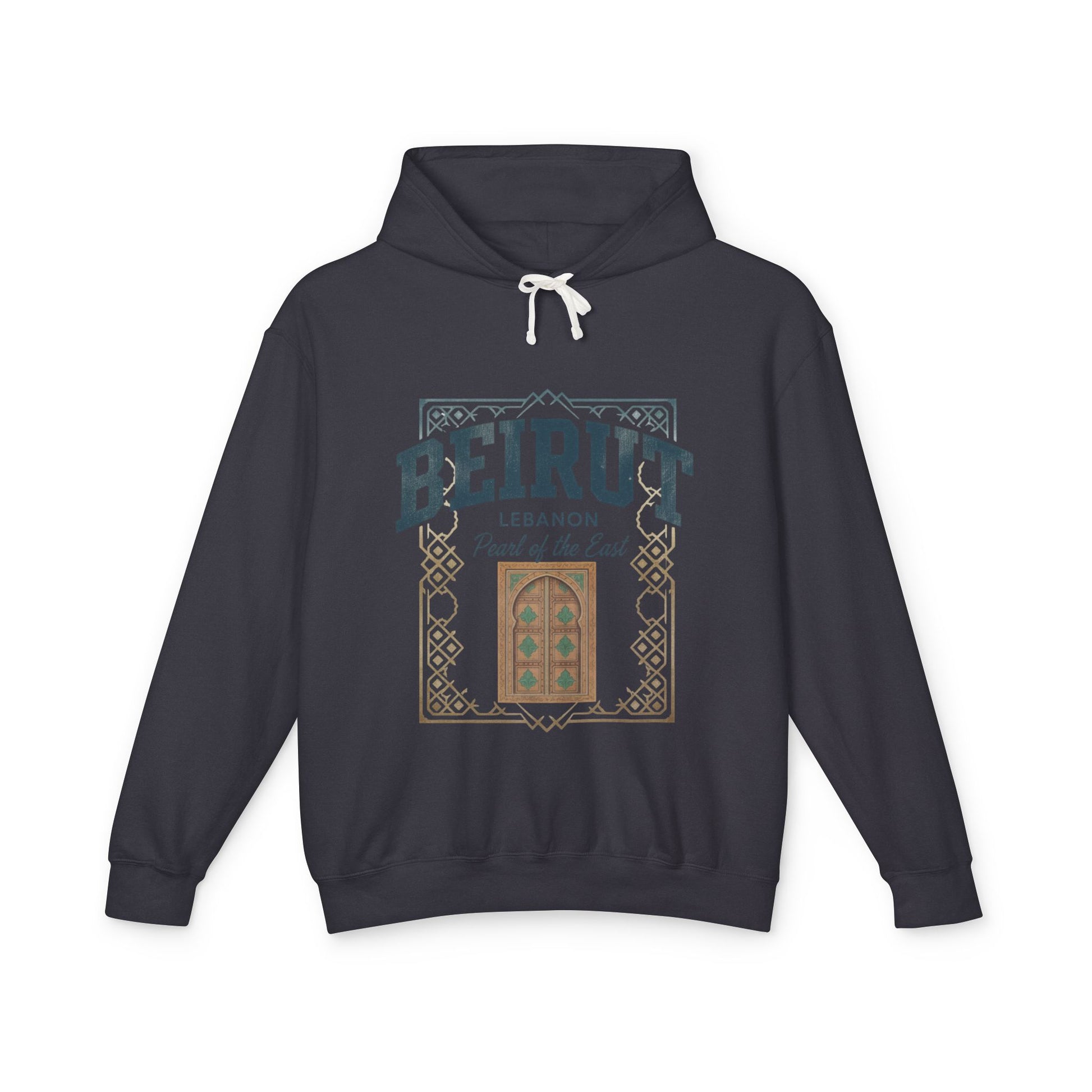 Soft, lightweight hoodie crafted from 100% ring-spun US cotton, printed with a warm, vintage-inspired Beirut window design. The natural cream fabric and muted earth-tone print create a calm, nostalgic mood — like stepping into a quiet courtyard at dusk. The jersey-lined hood and subtle flatcord add a considered, wearable detail while the relaxed fit and rolled-forward shoulders keep movement easy. Wear it on cool mornings while wandering city streets, at neighborhood cafés, or when you want a quiet reminder of home and memory.