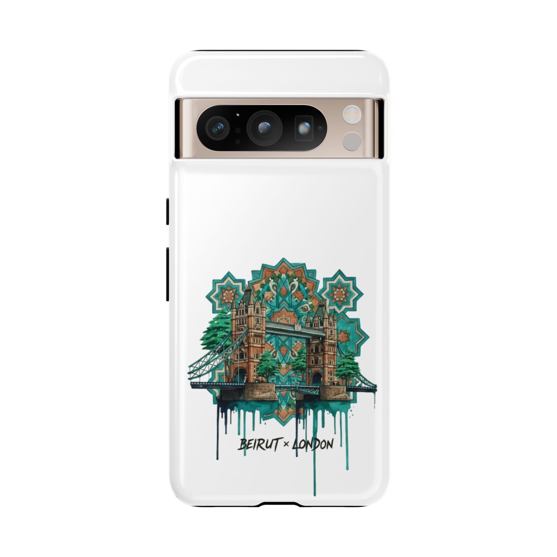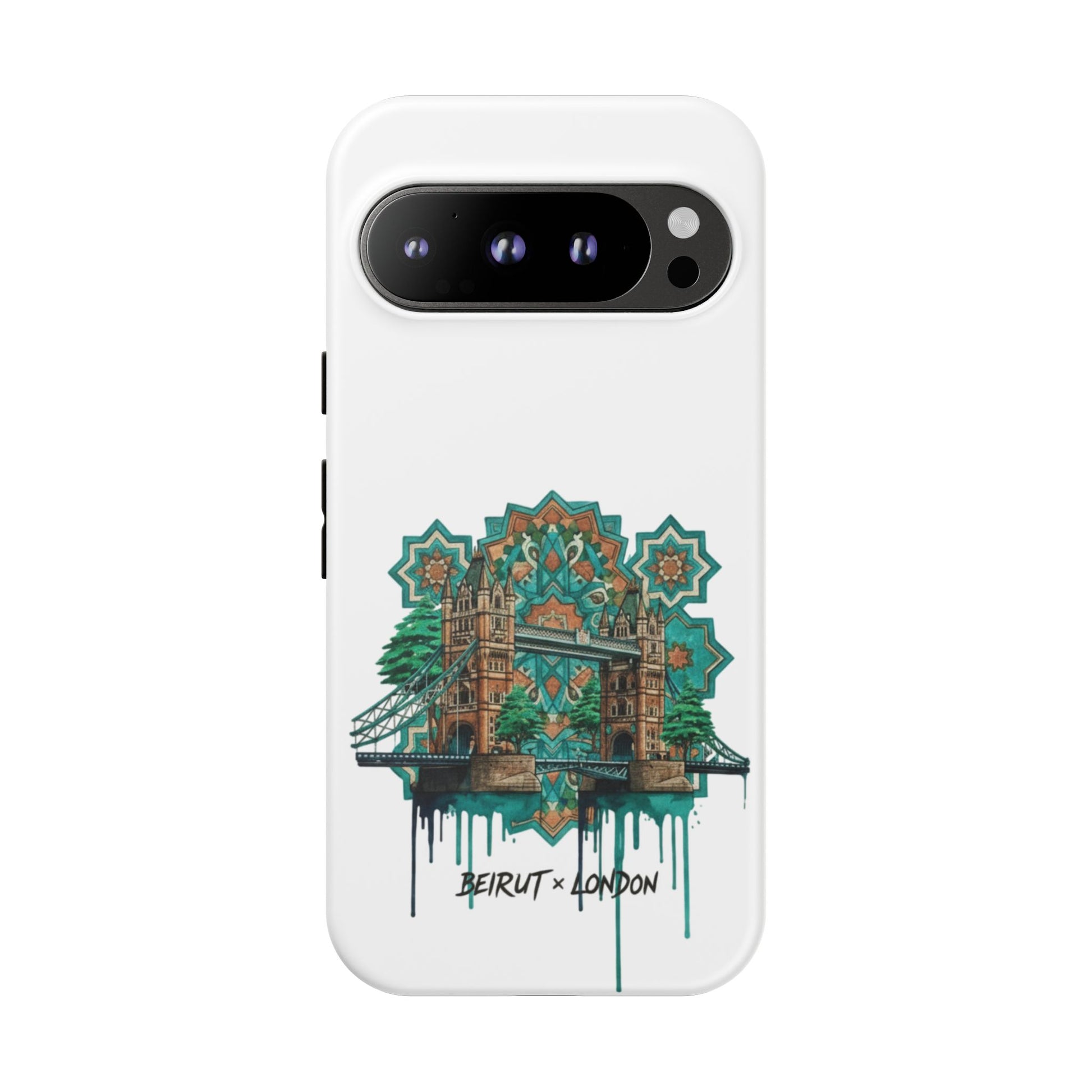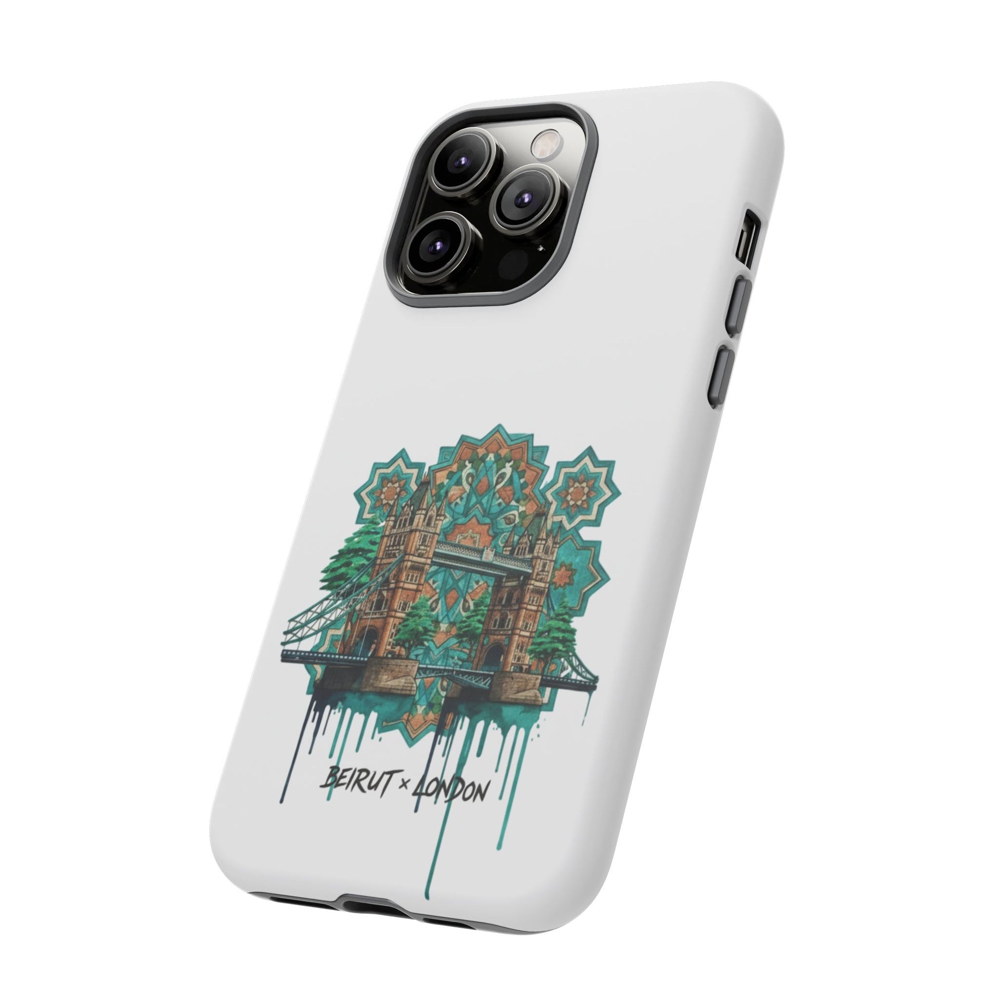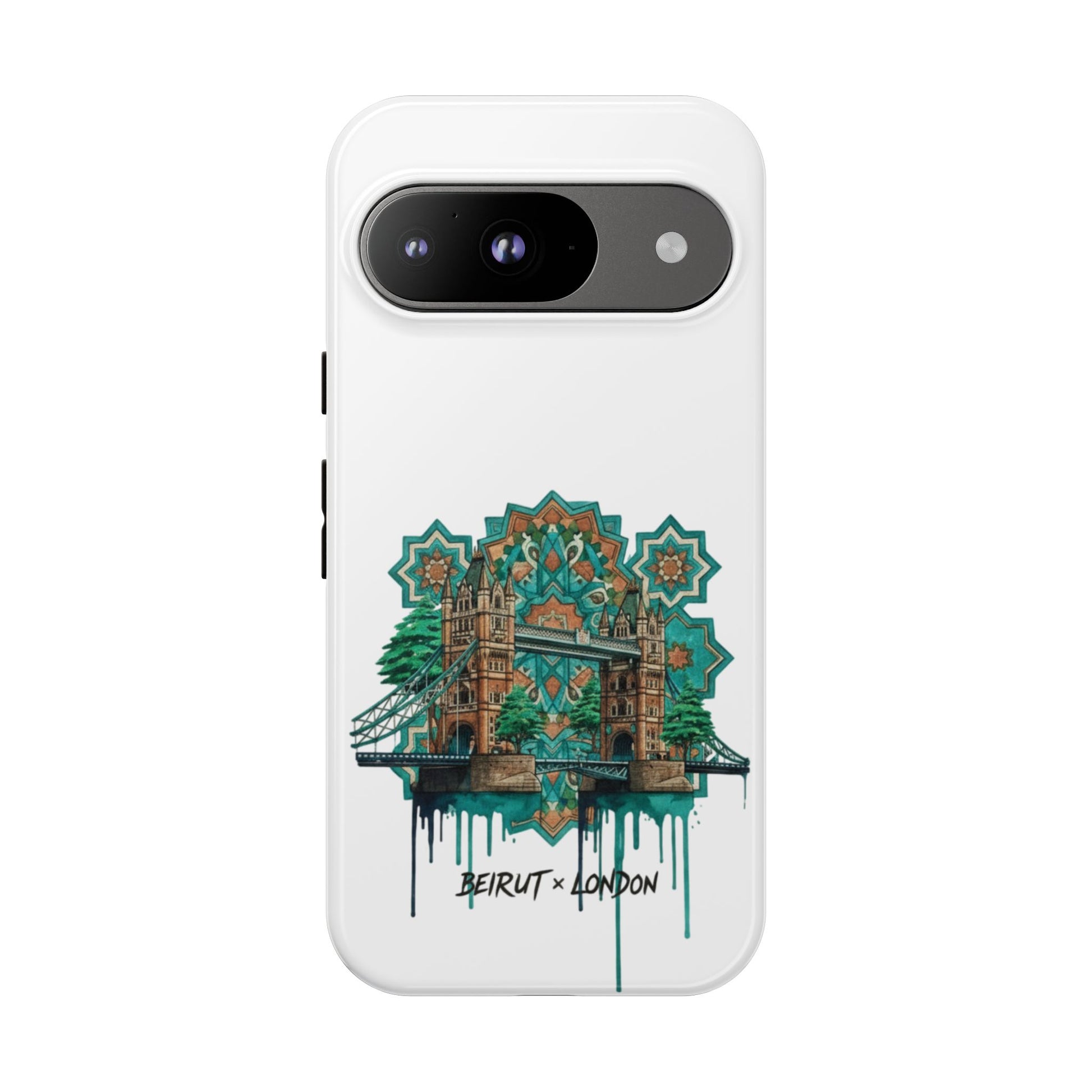 A slim, protective phone case that carries a handcrafted, urban-architectural design inspired by Beirut and London. The artwork blends ornate tile motifs, weathered stonework, and dripping paint accents in a teal-and-amber palette — giving the case an artful, lived-in feel. Dual-layer construction and a silicone TPU liner cushion your device from drops while a full-wrap print keeps the image vibrant. Lightweight and low-profile, it slips easily into a pocket or bag while the clear port openings keep charging and audio simple. Build a little storytelling into your everyday carry with a piece that looks like it’s traveled between city streets and studio walls.