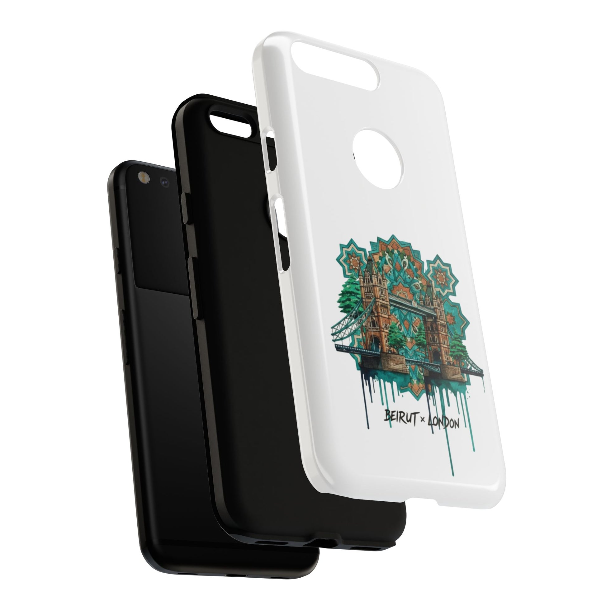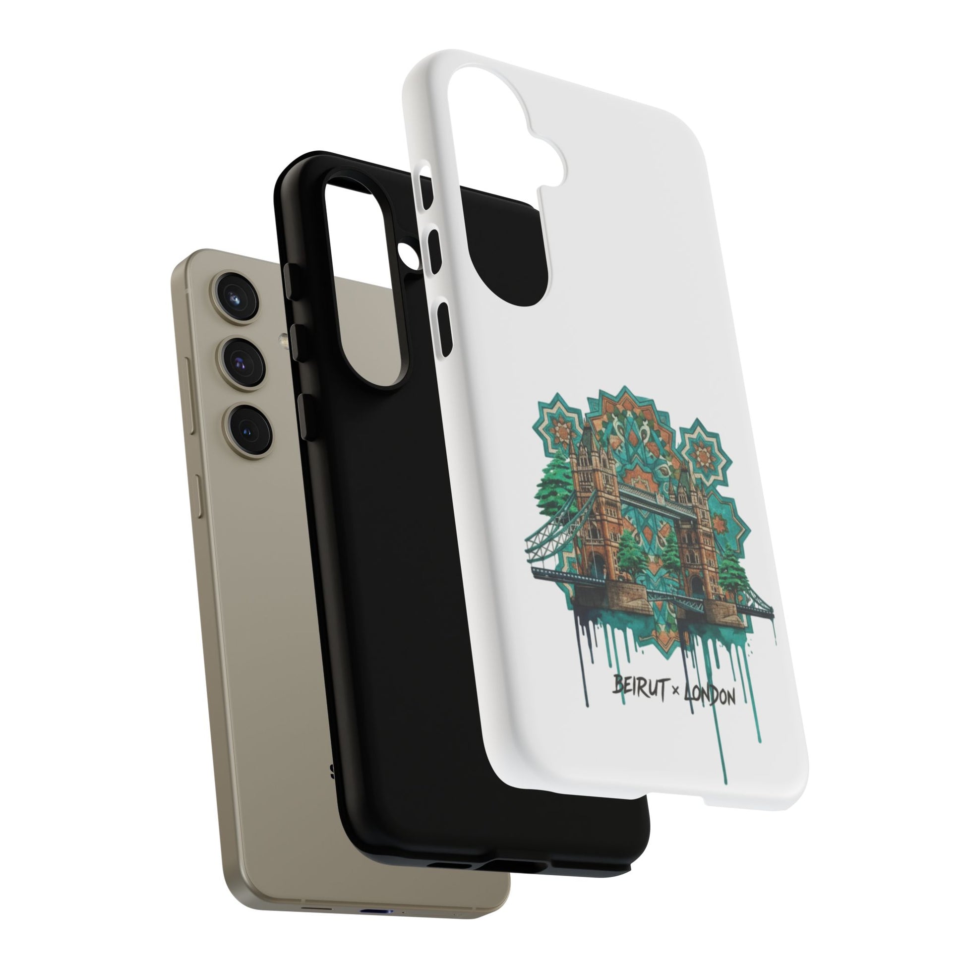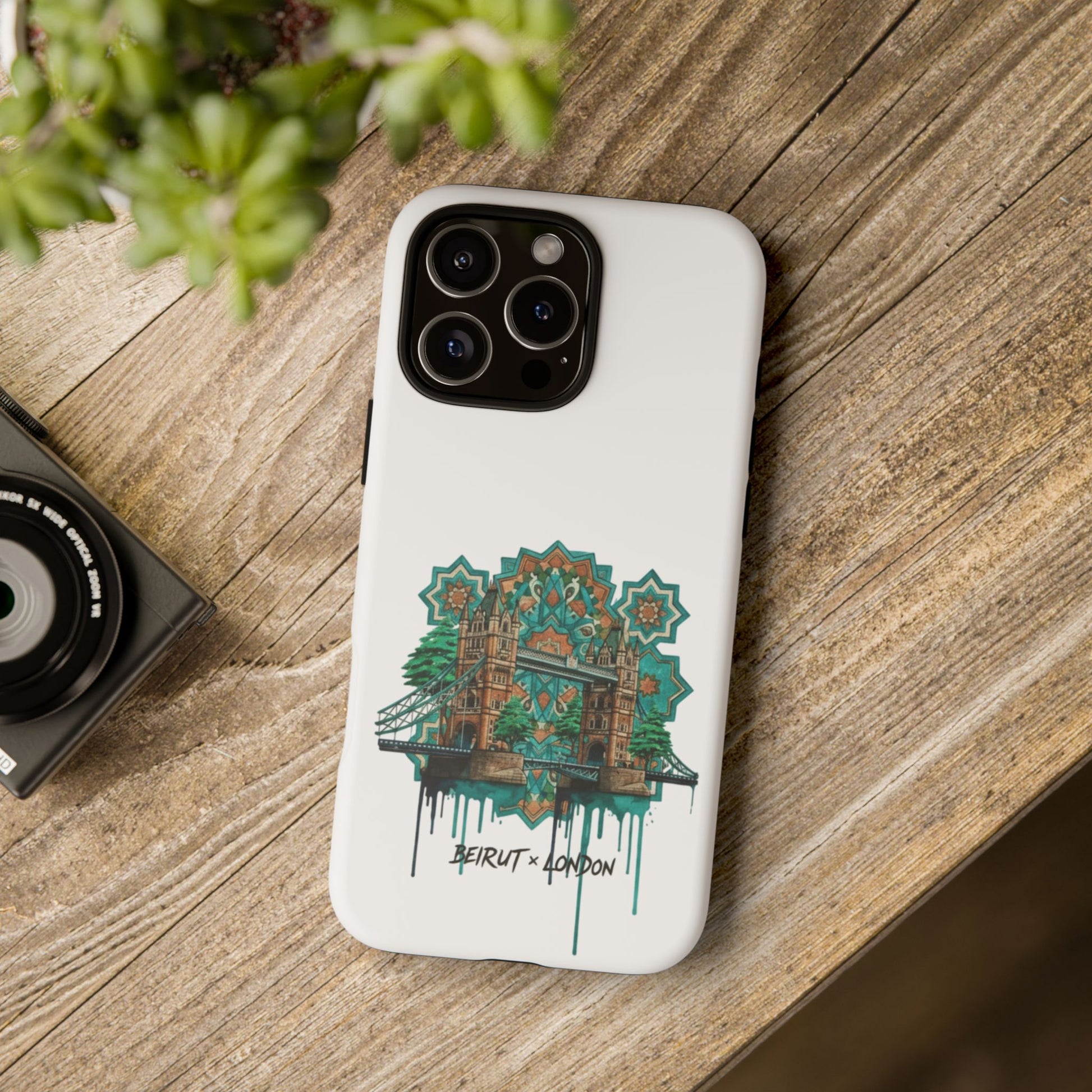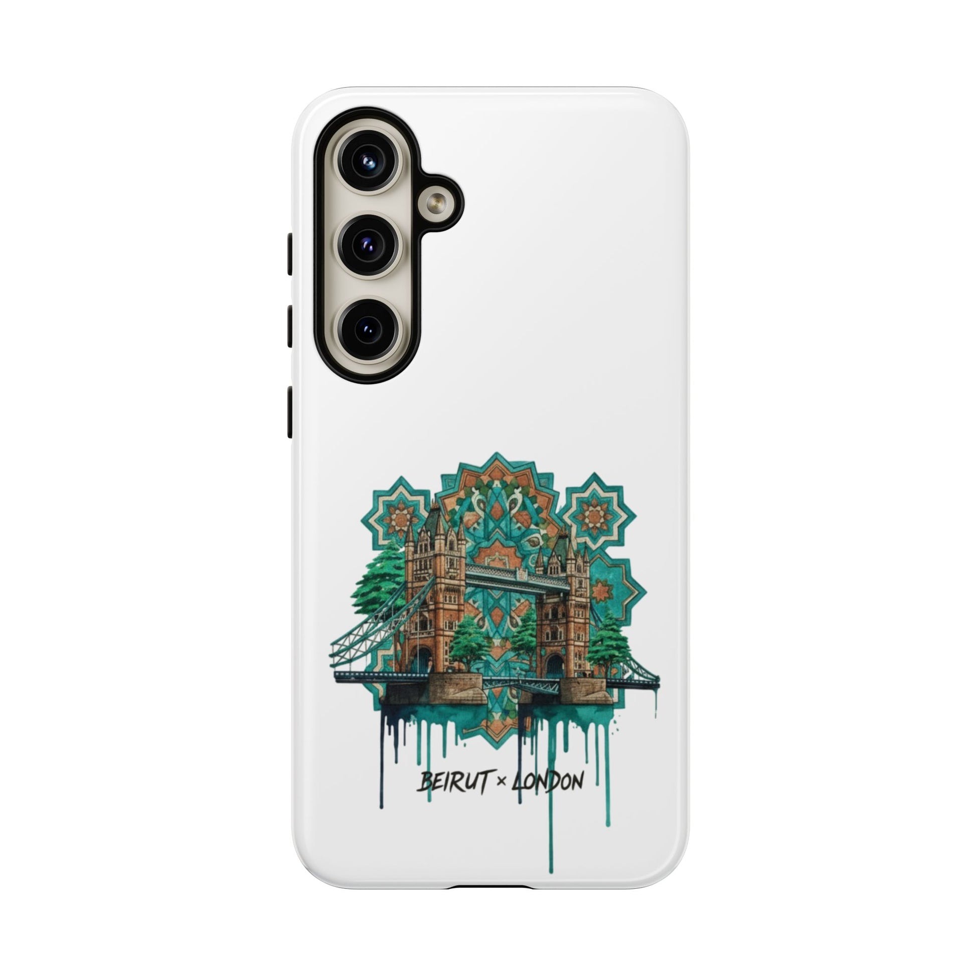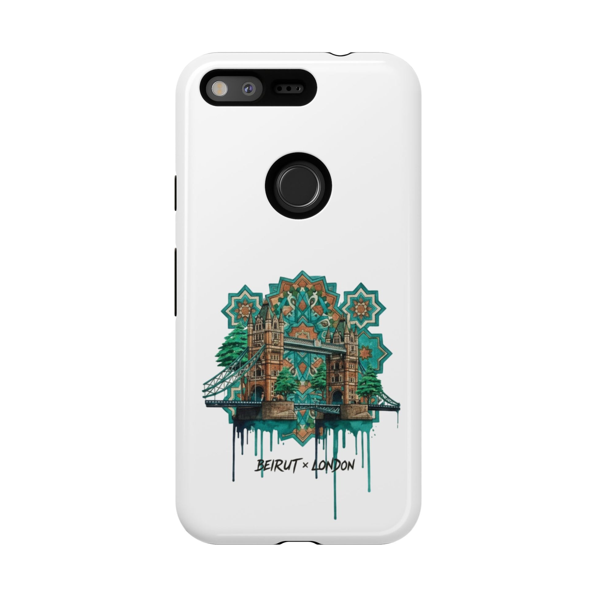 A slim, protective phone case that carries a handcrafted, urban-architectural design inspired by Beirut and London. The artwork blends ornate tile motifs, weathered stonework, and dripping paint accents in a teal-and-amber palette — giving the case an artful, lived-in feel. Dual-layer construction and a silicone TPU liner cushion your device from drops while a full-wrap print keeps the image vibrant. Lightweight and low-profile, it slips easily into a pocket or bag while the clear port openings keep charging and audio simple. Build a little storytelling into your everyday carry with a piece that looks like it’s traveled between city streets and studio walls.