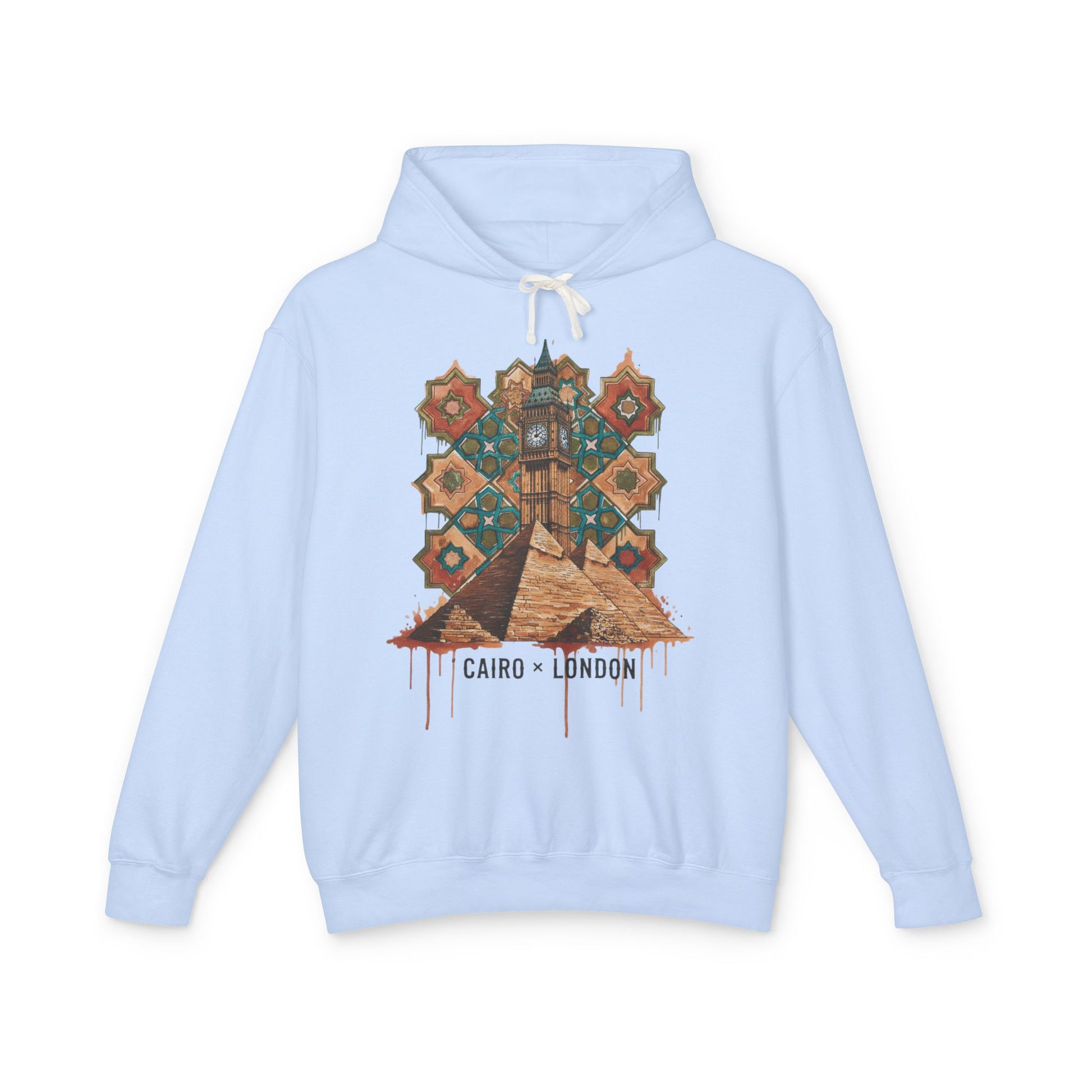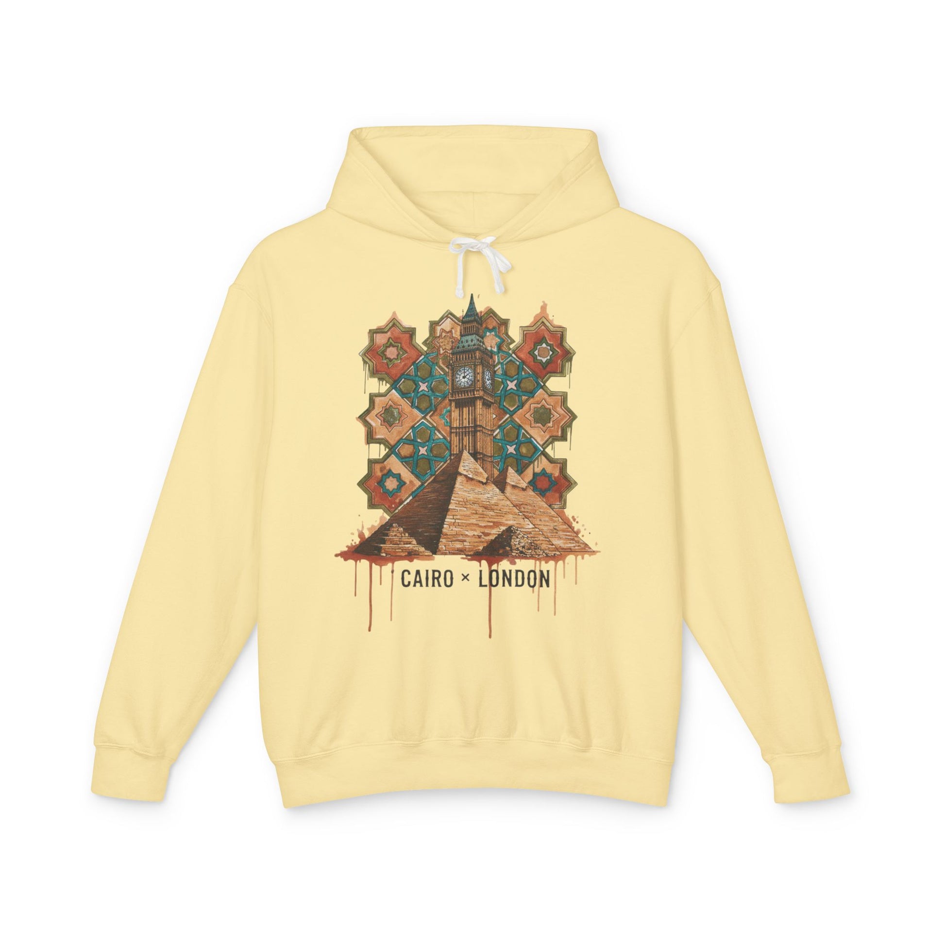 Soft, light, and quietly stylish — this hoodie carries a traveler's evening. Warm cream cotton drapes gently while a faded, hand-illustrated design anchors the front: pyramids, a lantern, and tiled motifs that nod to Cairo and London. It feels lived-in from the first wear — the hood's jersey lining and natural drawcord add subtle texture, and the relaxed cut moves with you on long walks, late trains, or museum days. For someone who collects places instead of things, this sweatshirt layers easily over tees and under coats, bringing a calm, worldly note to everyday outfits and cool-weather outings.