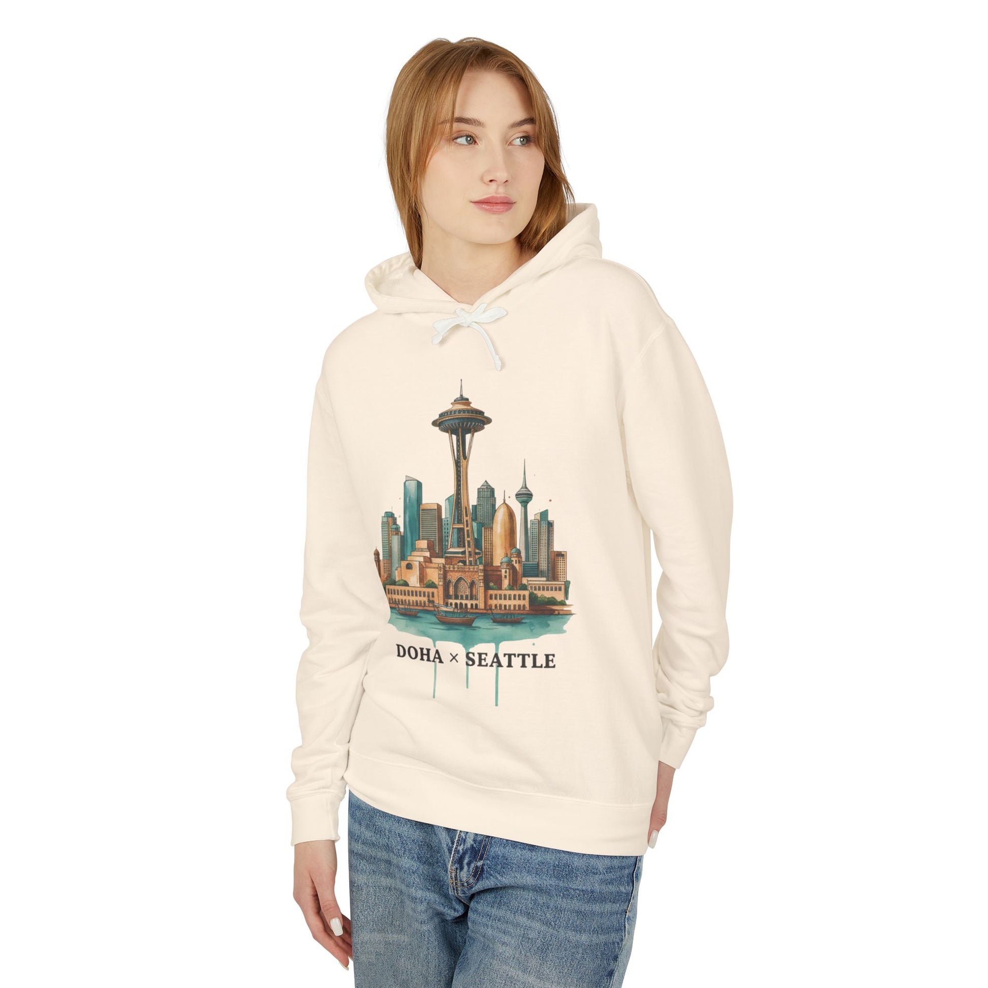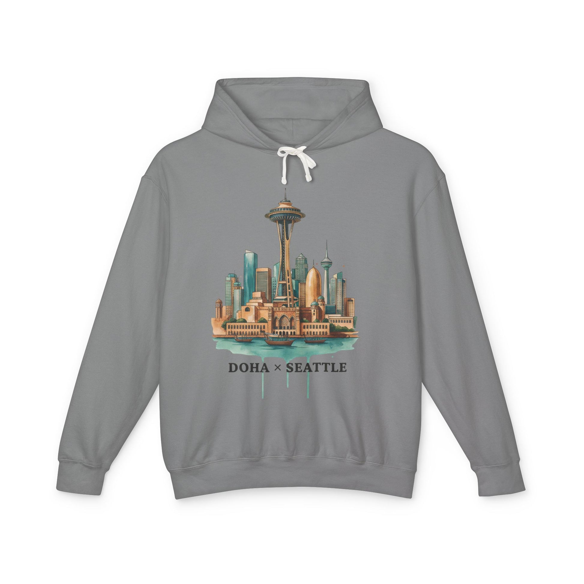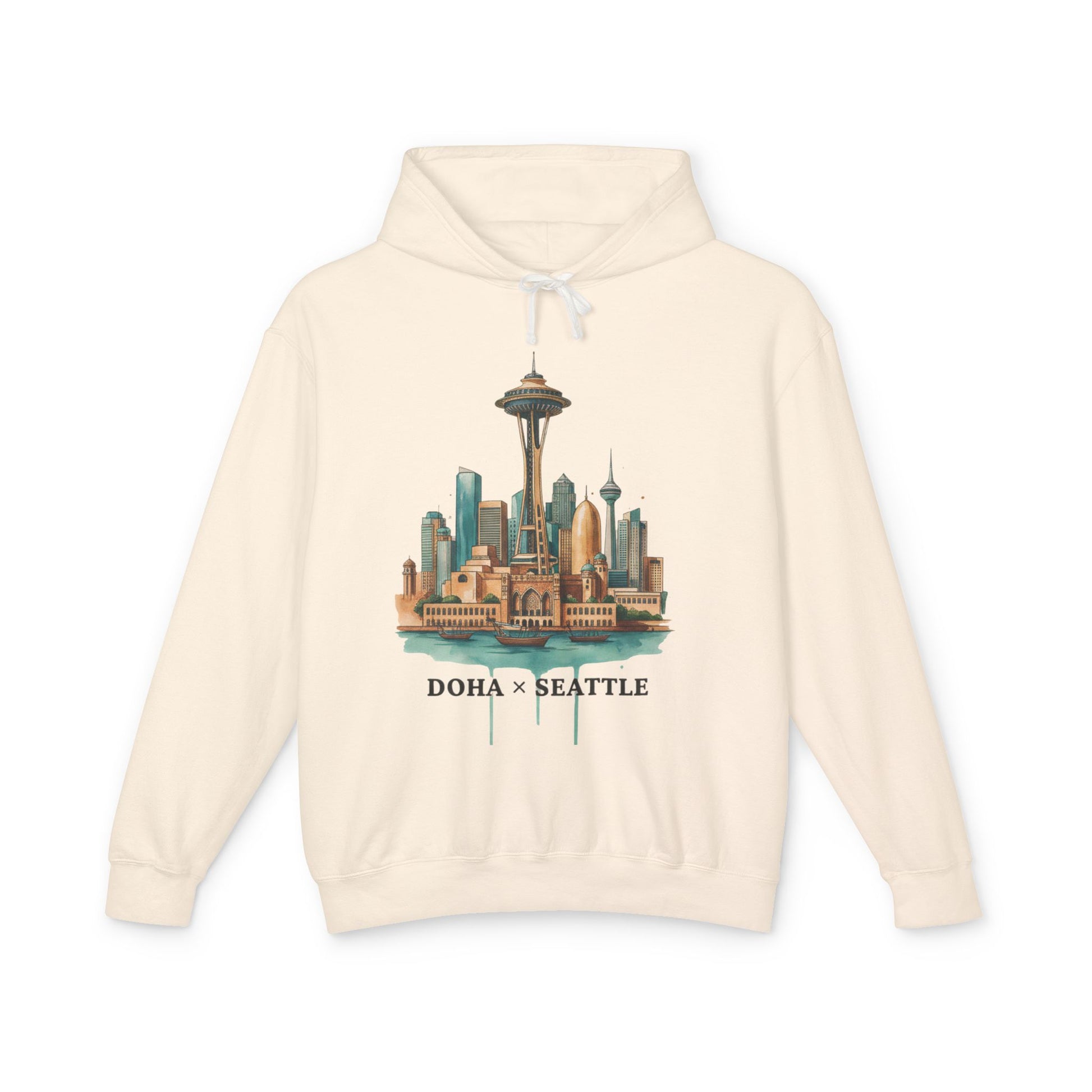 Doha x Seattle Skyline Hoodie — Retro Cityscape Pullover