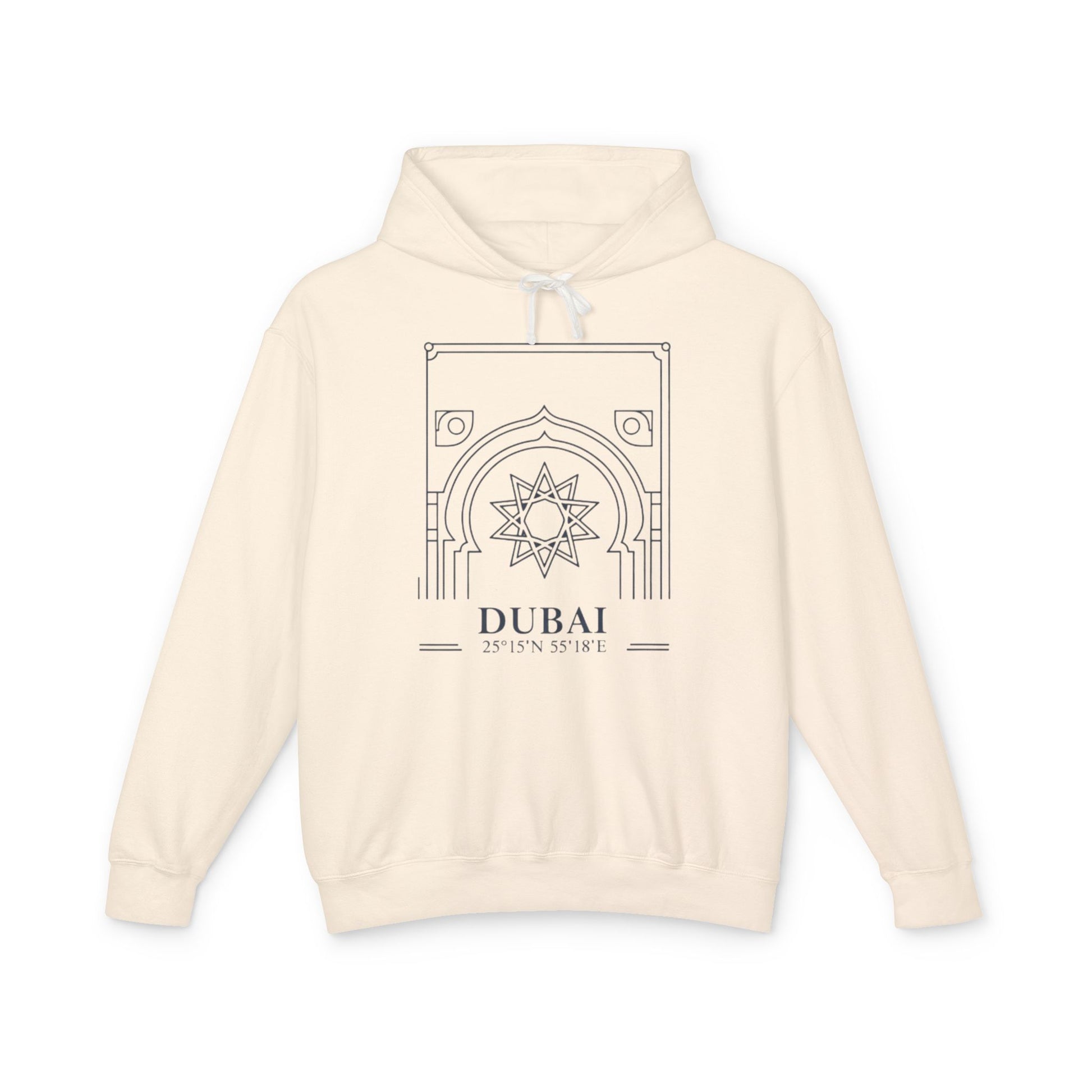 Soft, lightweight hoodie with a clean, architectural line-drawing of a Dubai arch and ornamental star at the chest. The natural cream fabric and minimalist print give a calm, refined look that feels both travel-worn and intentionally curated. Slip it on for cool evenings after a market stroll or when you want a quiet reminder of sunlit courtyards and late-afternoon light. The relaxed cut and jersey-lined hood make it easy to layer over tees or button-ups. It settles against the body without bulk and carries an effortless, studied simplicity — a piece that complements a slow-travel wardrobe and quietly honors place and memory.