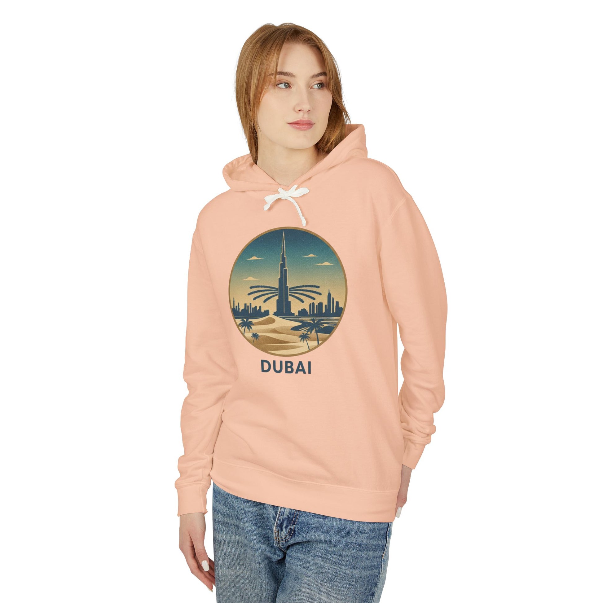 This lightweight hoodie brings a calm, sun-drenched snapshot of Dubai into everyday wear. The soft, jersey-lined hood and relaxed fit make it feel easy and familiar—like stepping out for an evening walk along a warm promenade. The circular vintage-style graphic places the Burj Khalifa at the center, framed by a skyline and rolling sand dunes in muted teal and gold tones. It’s for people who collect places in their wardrobe: travelers, city-lovers, and anyone who remembers a desert sunset or dreams of one. Wear it on cool coastal nights, while wandering markets, or when you want a quiet reminder of a trip that changed you.