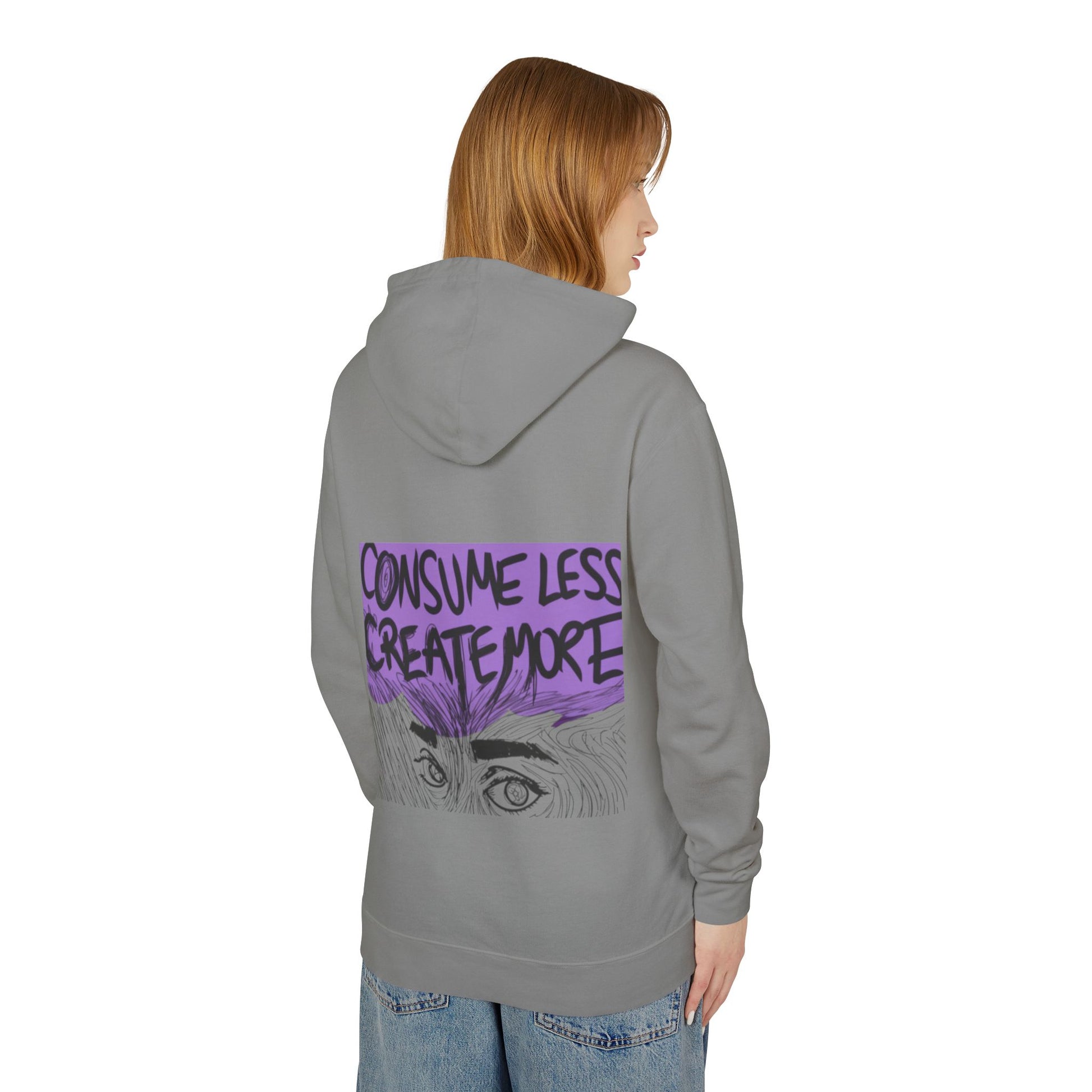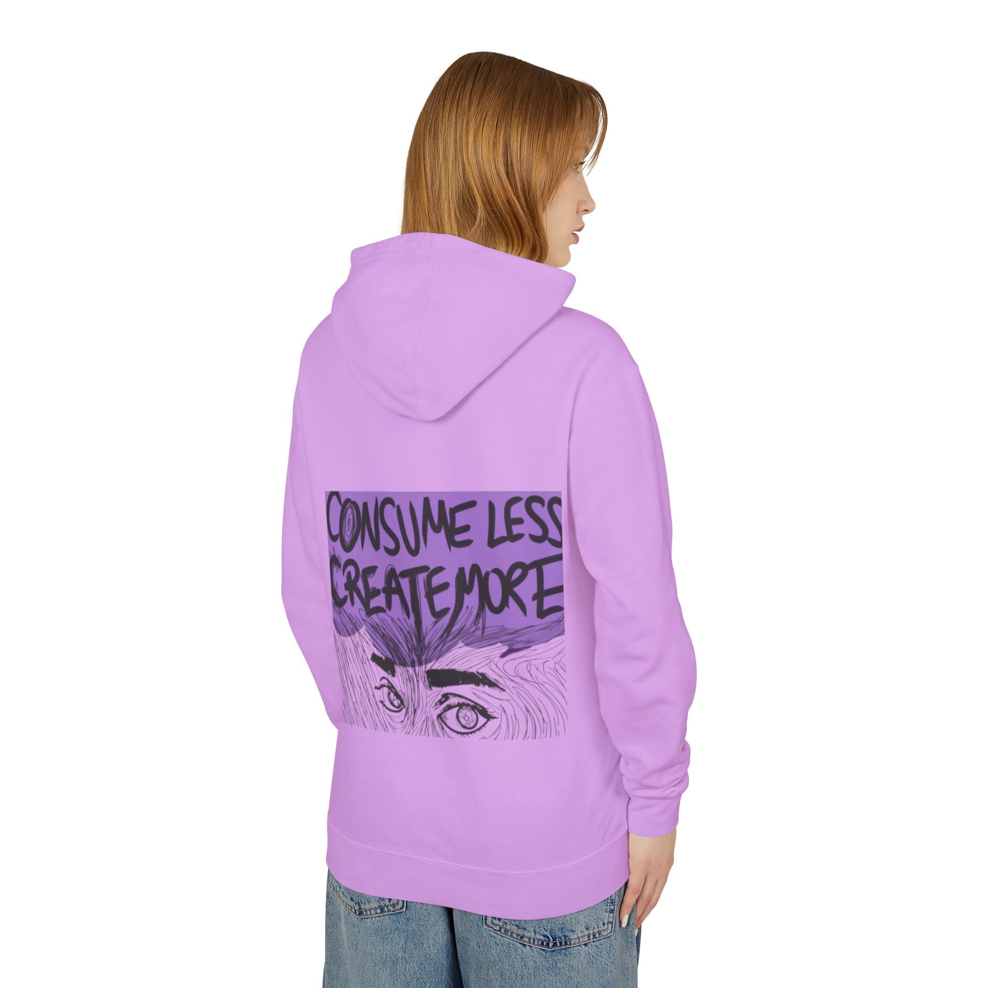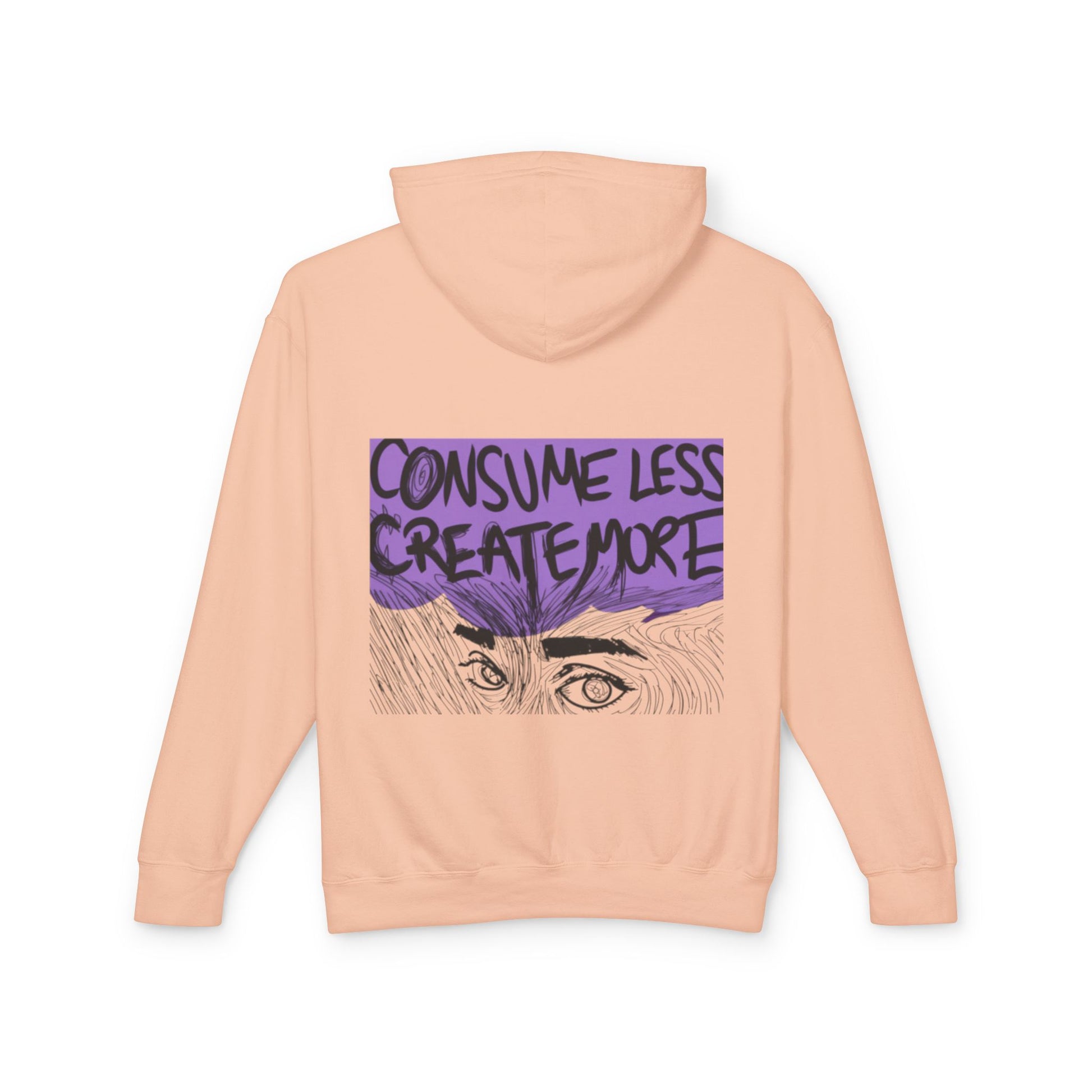 This lightweight hooded sweatshirt carries a quiet, purposeful vibe — soft, breathable cotton with a relaxed cut and a bold back graphic that nudges you toward creativity over consumption. Wear it on slow mornings in the studio or for late-night sketching sessions; the jersey-lined hood and natural flatcord add a subtle, handmade touch while the light fabric keeps movement easy. The artwork — a hand-drawn pair of eyes beneath the message “Consume Less Create More” — reads like a personal manifesto across your back, a reminder to make space for craft, ideas, and intentional living.