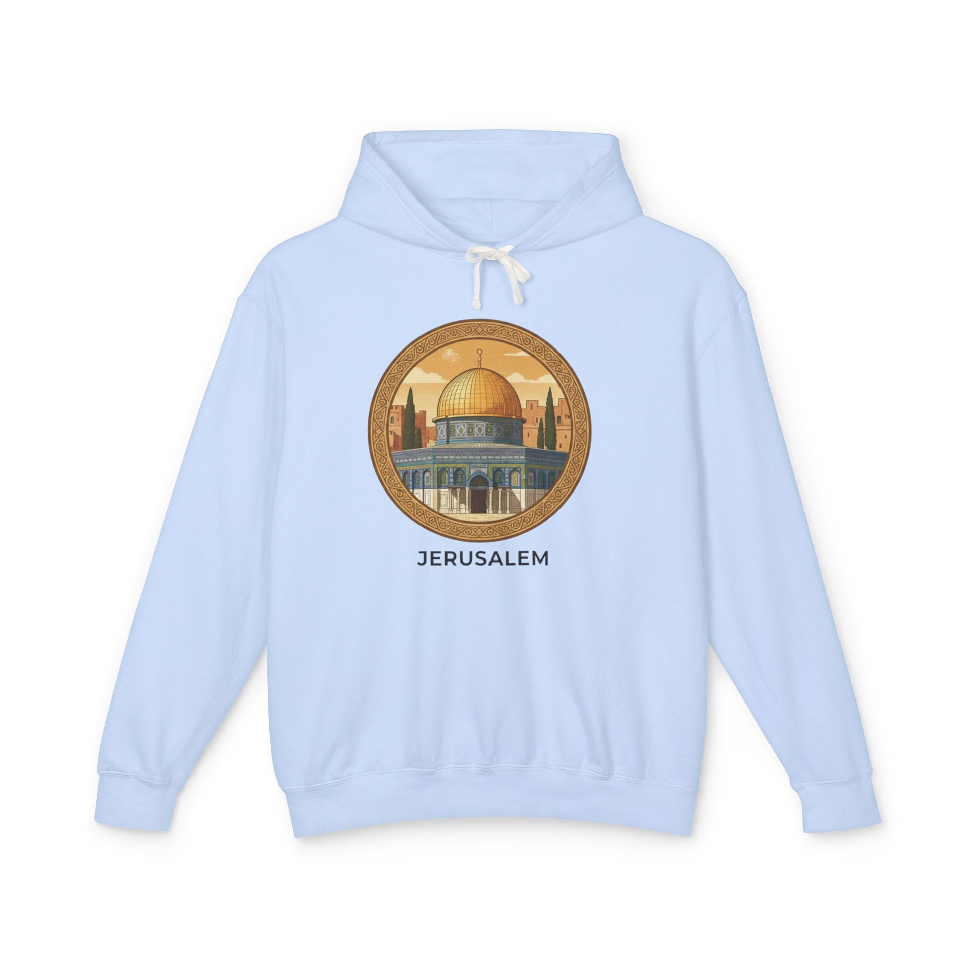 Soft, light, and quietly expressive — this hooded sweatshirt carries a small, artful tribute to Jerusalem across the chest. The warm, muted illustration of the Dome sits inside a circular frame, lending the piece a vintage-travel-patch feel that reads calm and thoughtful. Wear it on slow mornings, during museum walks, or layered for evening services. The relaxed drape and jersey-lined hood make it feel lived-in from the first wear, while the natural tones blend easily with denim, linen, or tailored trousers. This sweatshirt is for people who collect places in memory and wardrobe: it holds a sense of history without shouting, and invites quiet conversation when you cross paths with fellow travelers or friends.