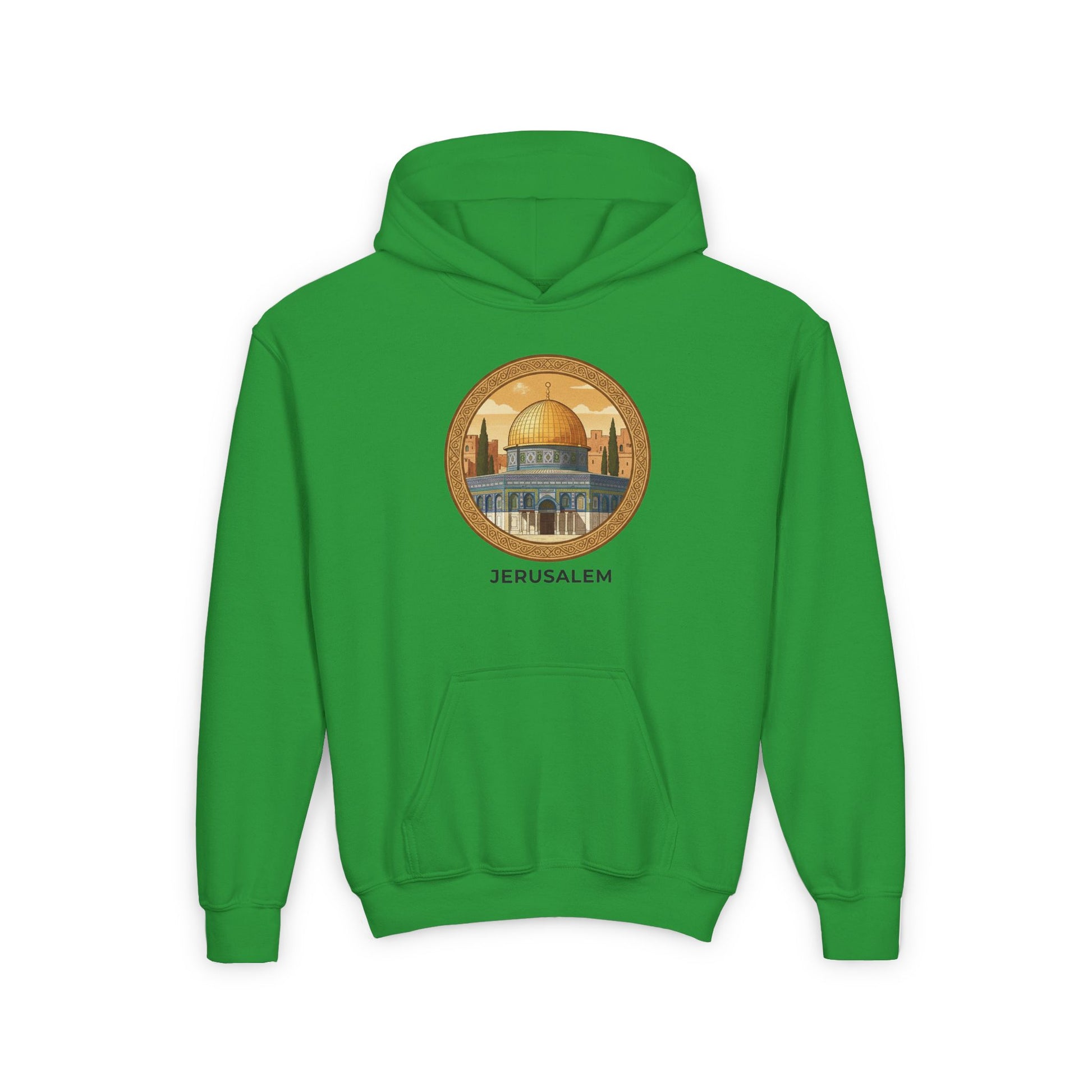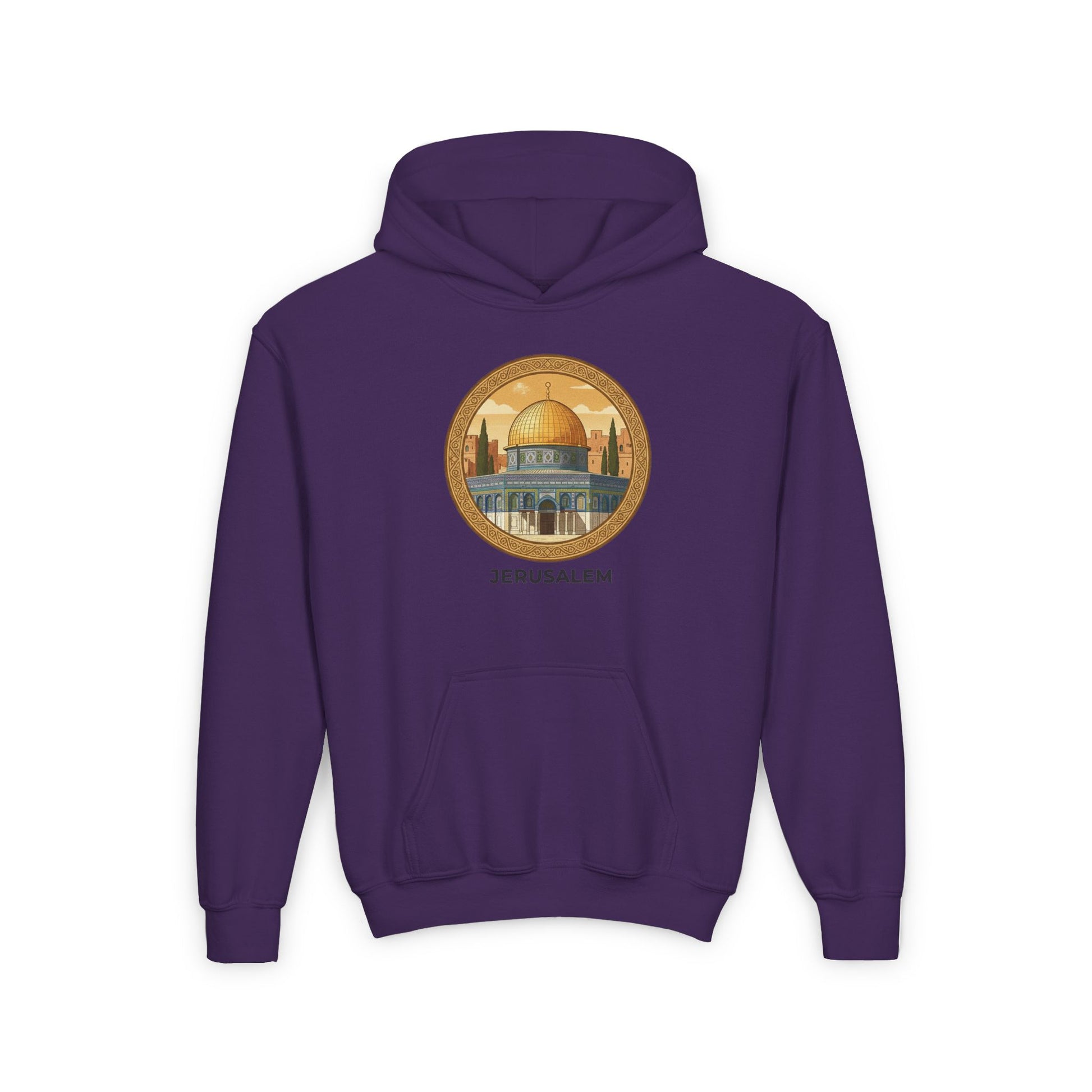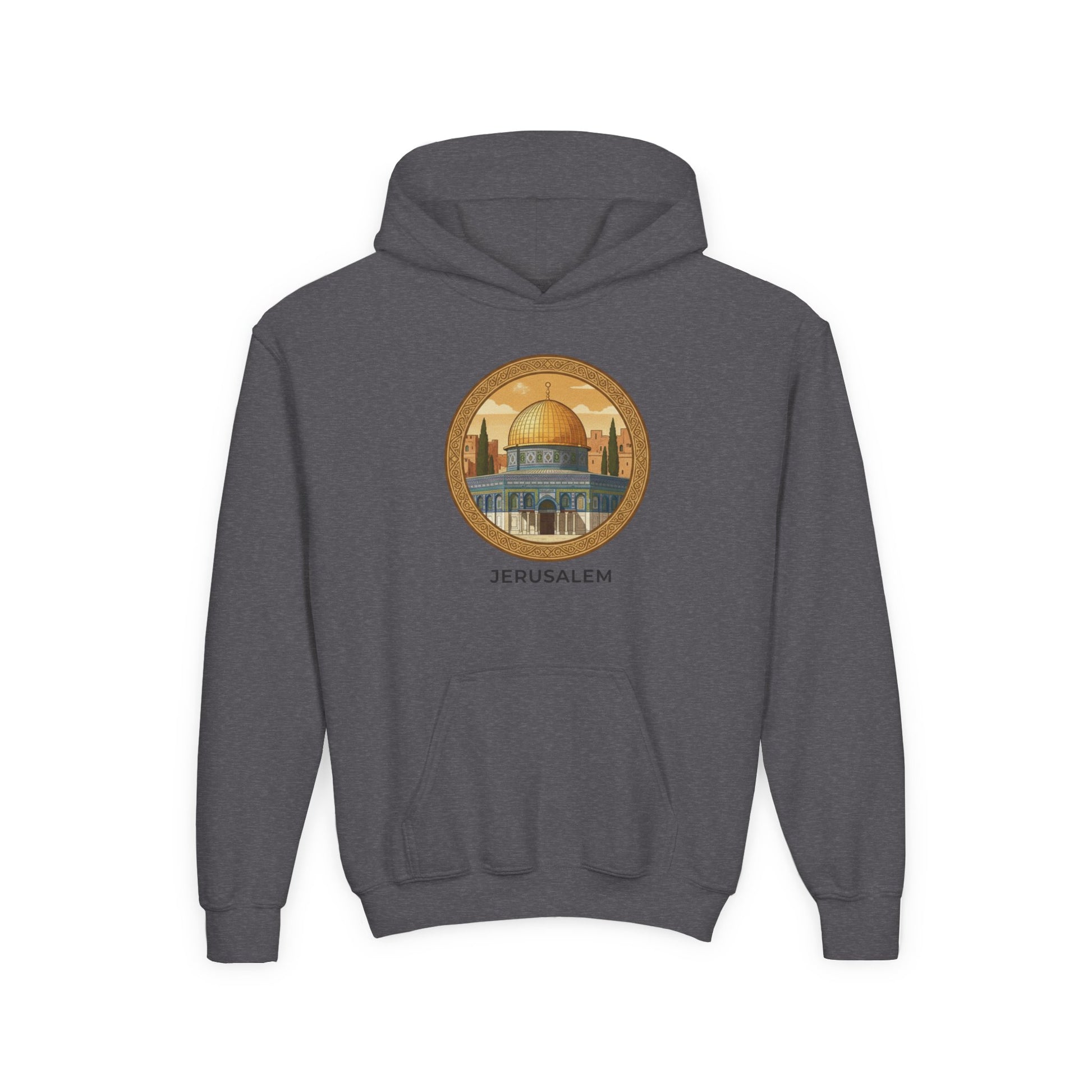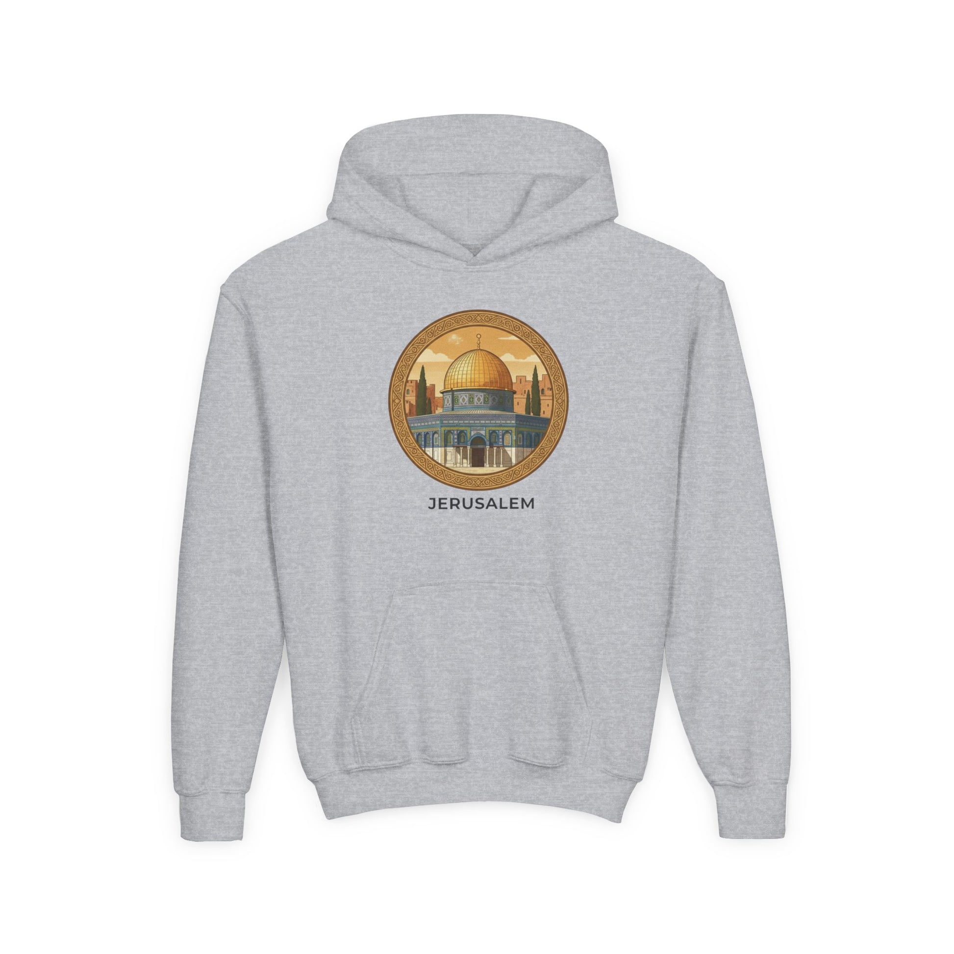This youth hoodie carries a quiet, reverent energy—soft, warm, and made to be worn close to the heart. The design centers on a warm-toned illustration of Jerusalem’s golden dome, framed in a circular motif that feels like a small window onto a sacred place. Lightweight but durable midweight fabric keeps kids comfortable during outdoor walks, school days, or family gatherings. The kangaroo pouch and roomy hood invite little hands and heads to nestle in, while tidy ribbing and twill necktape keep the shape steady through wear. Subtle wrist and chest printing options mean the artwork reads clearly without fuss. It’s a wearable reminder of place and memory that layers easily under a coat or stands alone on cool evenings.