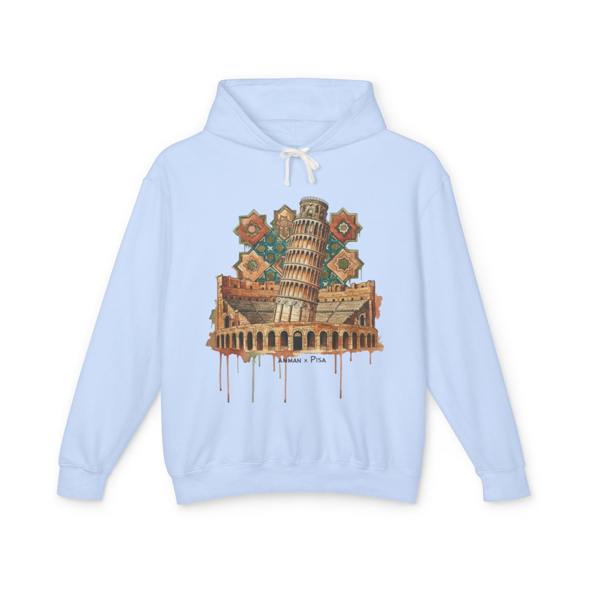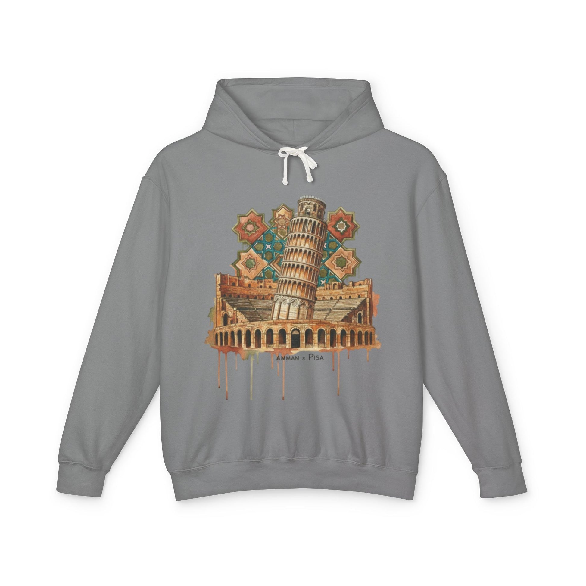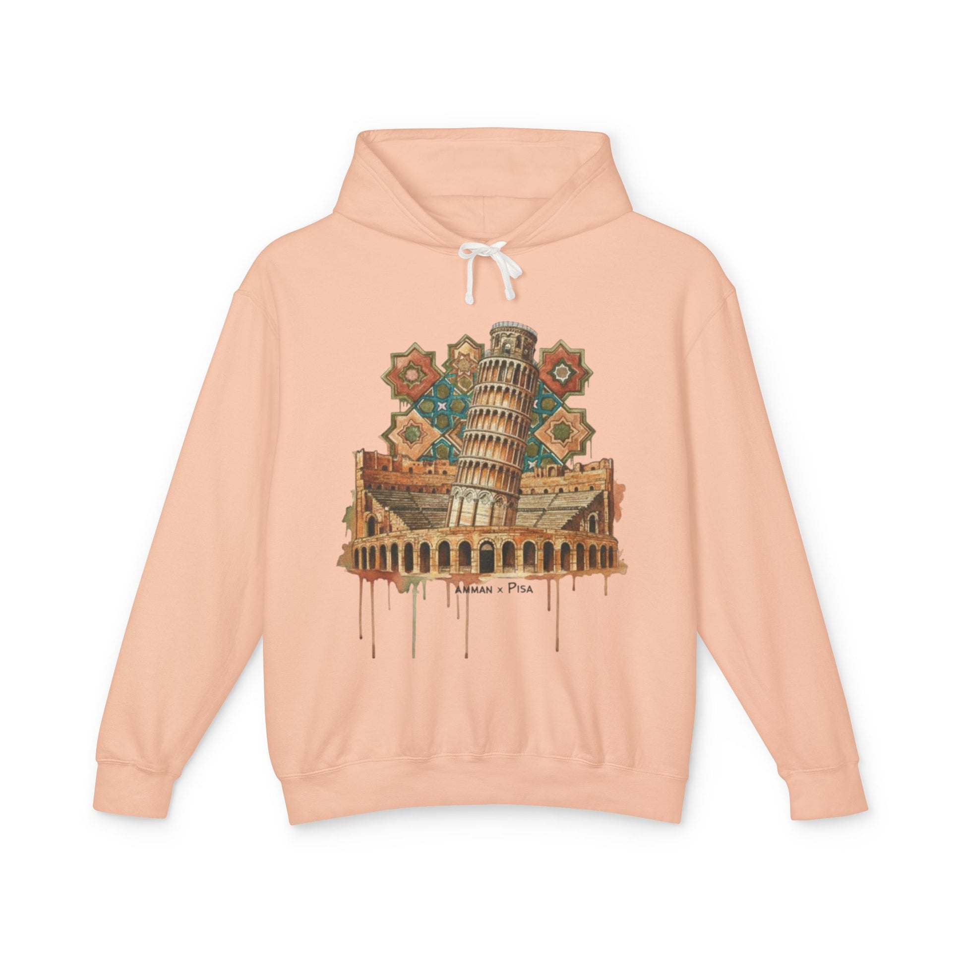 A lightweight cotton hoodie that feels like a travel memory you can wear. The front print layers a watercolor Leaning Tower of Pisa with warm terracotta tiles and faded fresco motifs, letting the architecture look sun-kissed and slightly weathered. Soft, breathable cotton sits close to the skin while the relaxed cut and jersey-lined hood make it easy to throw on for train rides, city walks, or long café afternoons. It settles into everyday life — worn with rolled sleeves, a scarf, or under a coat — and keeps the focus on the quiet joy of discovery and the small souvenirs you carry home.