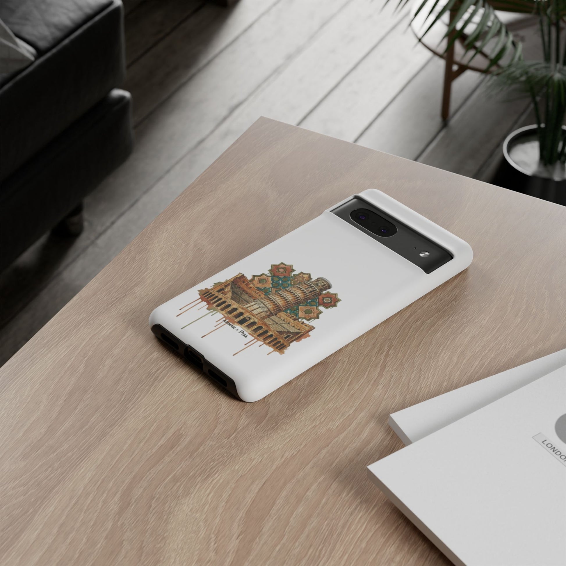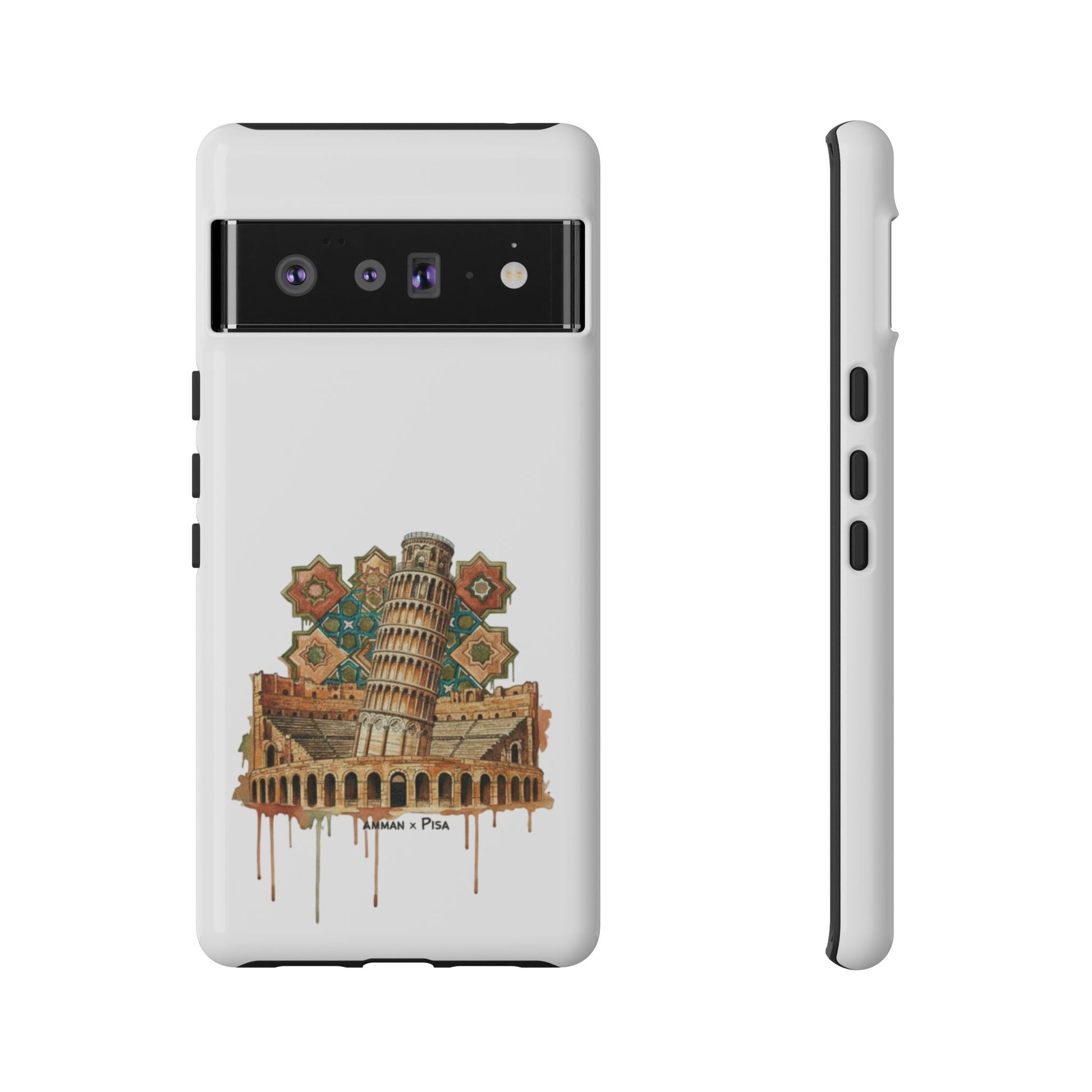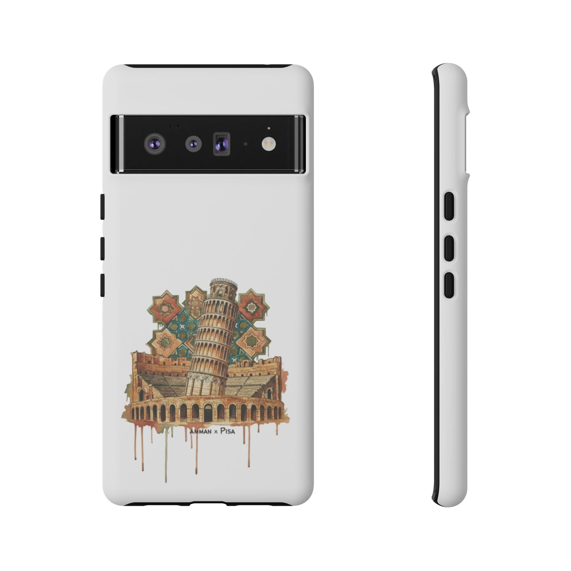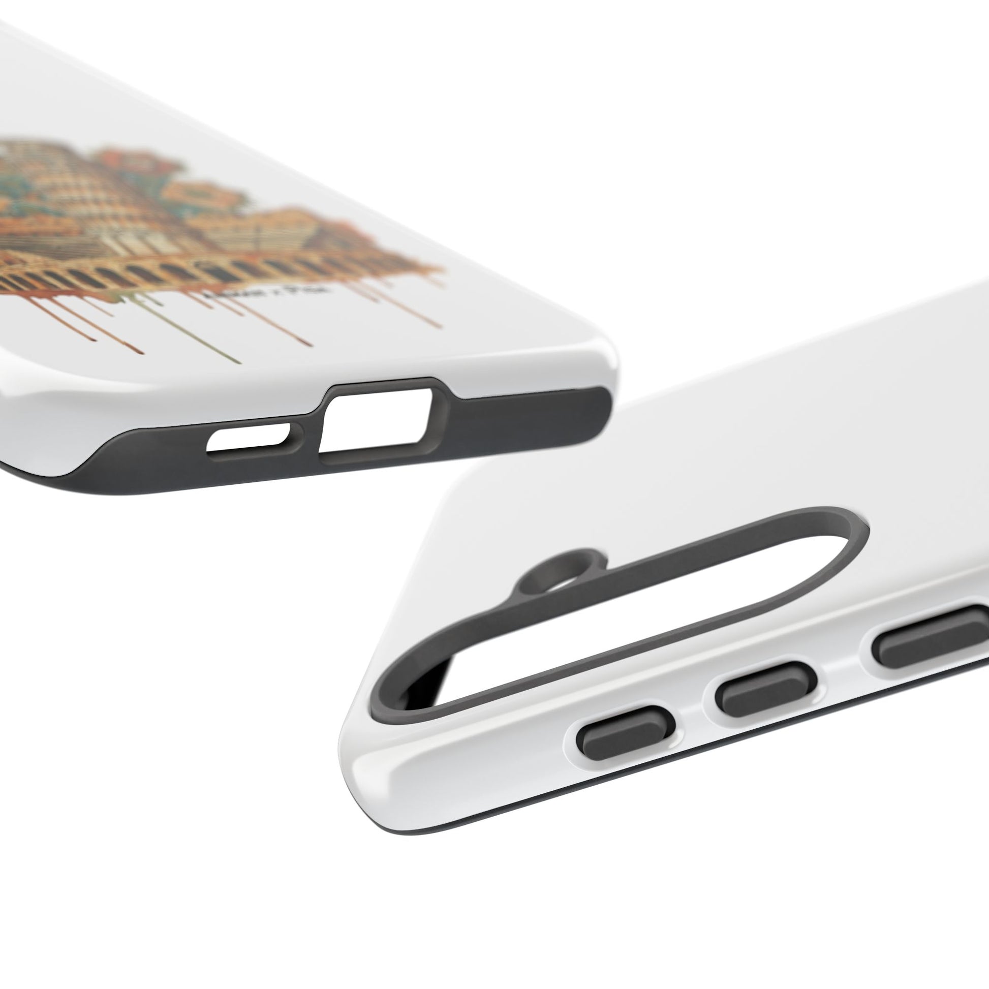 A slim, dual-layer protective phone case that blends reliable defense with artistic flair. The glossy/matte shell features a full 3D wrap transfer of a warm, vintage-style illustration of the Leaning Tower and surrounding piazza, complete with subtle drip details and ornamental tile motifs. The polycarbonate outer shell and TPU silicone liner absorb shocks and resist impacts while keeping ports clear and wireless charging functional. Finished with UV protection and certified materials, this case pairs everyday practicality with a travel-inspired, handcrafted look.