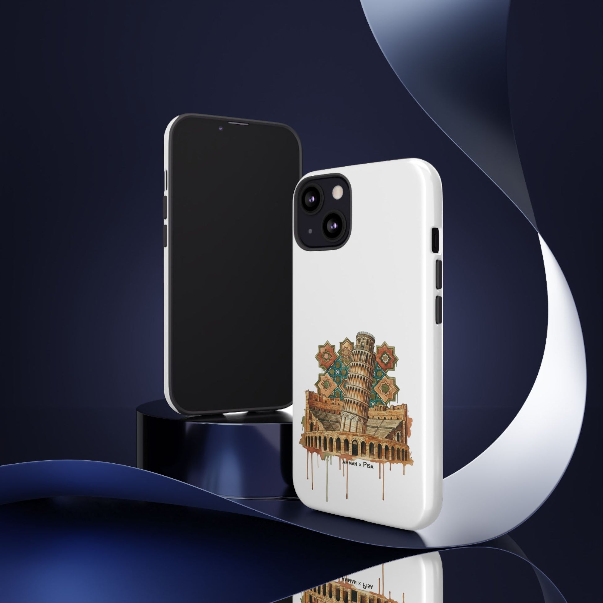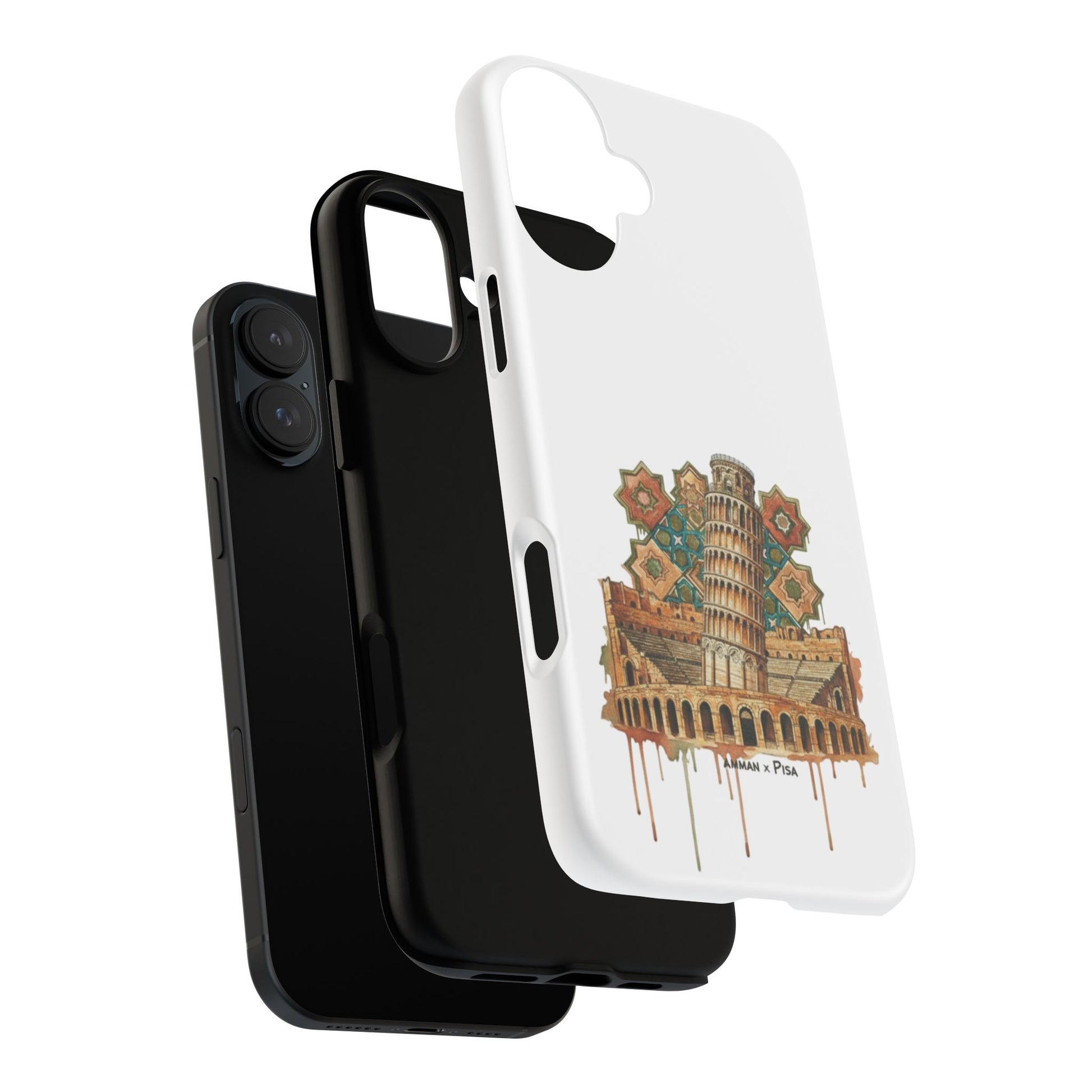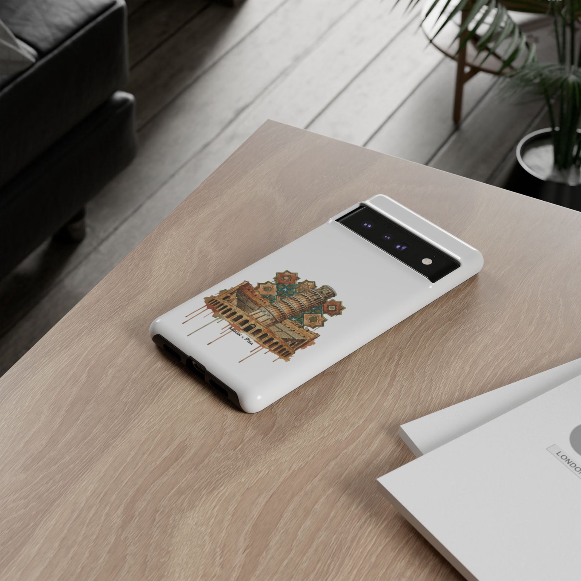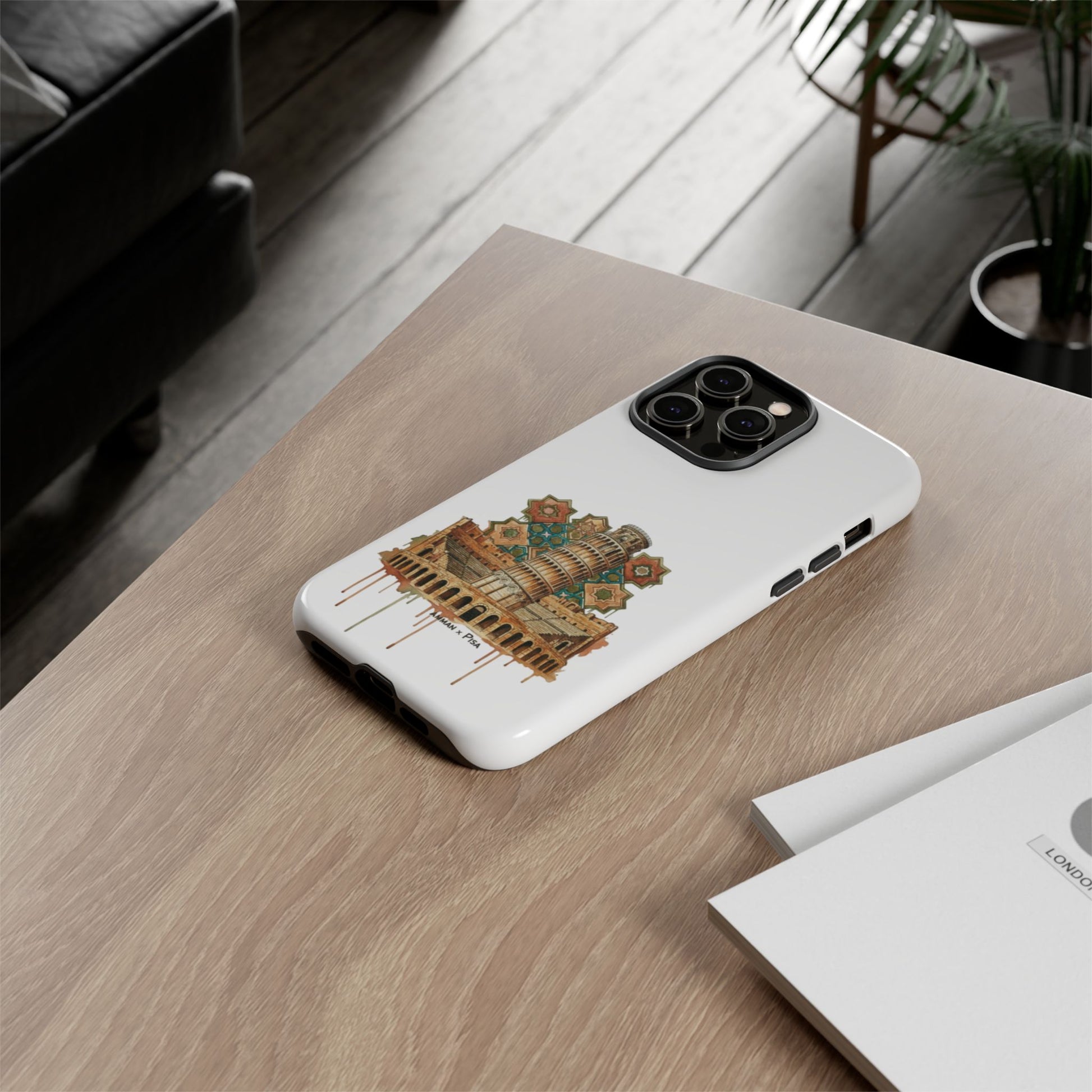 A slim, dual-layer protective phone case that blends reliable defense with artistic flair. The glossy/matte shell features a full 3D wrap transfer of a warm, vintage-style illustration of the Leaning Tower and surrounding piazza, complete with subtle drip details and ornamental tile motifs. The polycarbonate outer shell and TPU silicone liner absorb shocks and resist impacts while keeping ports clear and wireless charging functional. Finished with UV protection and certified materials, this case pairs everyday practicality with a travel-inspired, handcrafted look.