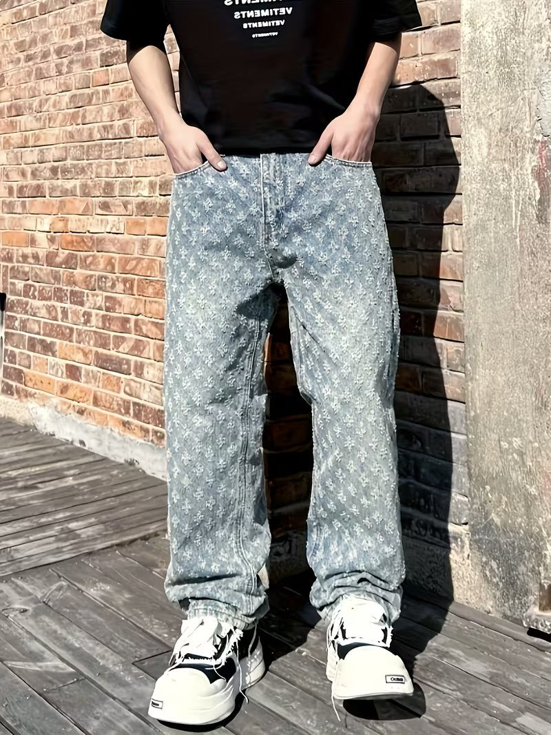 Light Blue Denim Jeans with Washed Detail and Jacquard Pattern