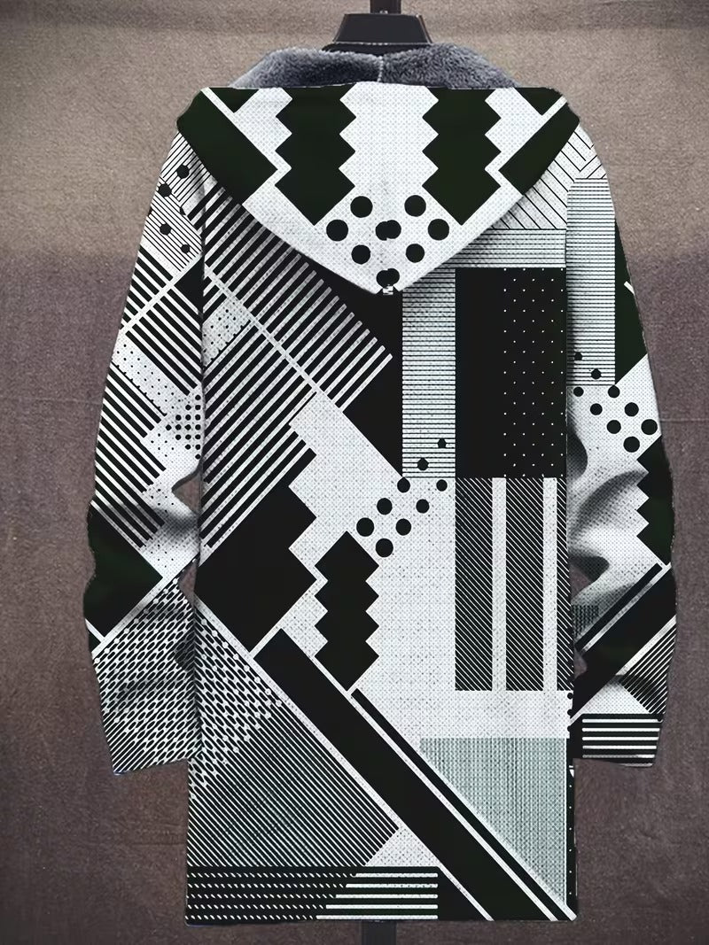 Men's Plush Cardigan Geometric Black And Gradient Art Design Elevate your layering game with this sophisticated men's cardigan, featuring an exclusive geometric and gradient art design rendered in striking black tones. Crafted from premium plush fabric, it delivers exceptional softness and warmth without compromising on style. The modern abstract pattern—inspired by architectural geometry and contemporary aesthetics—makes a bold statement whether worn as a standalone piece or layered over essentials. Perfect for those who appreciate luxury streetwear that bridges cultural sophistication with urban edge. Ideal for transitional seasons or as a refined indoor layer.