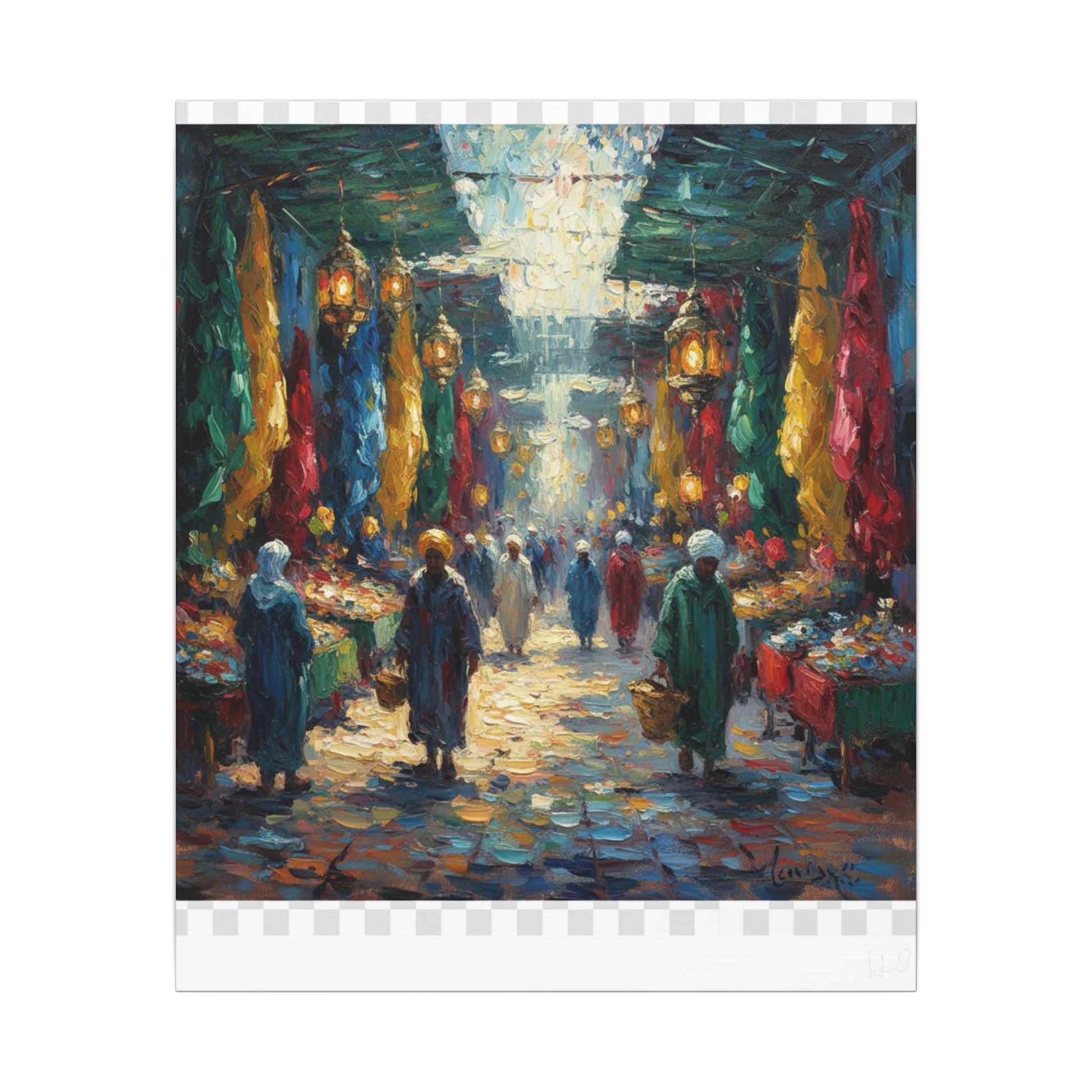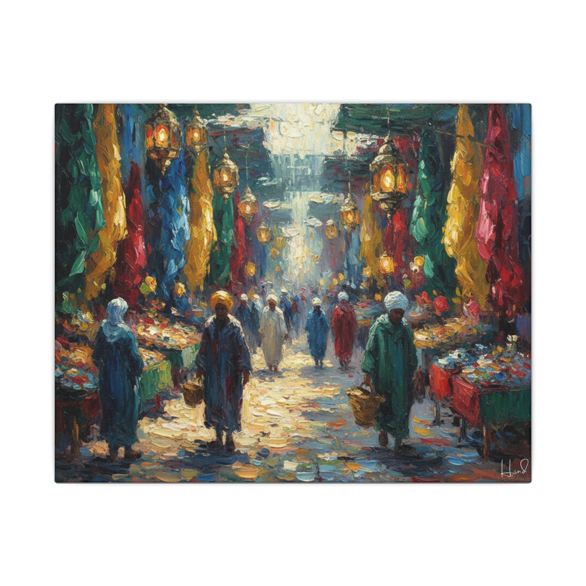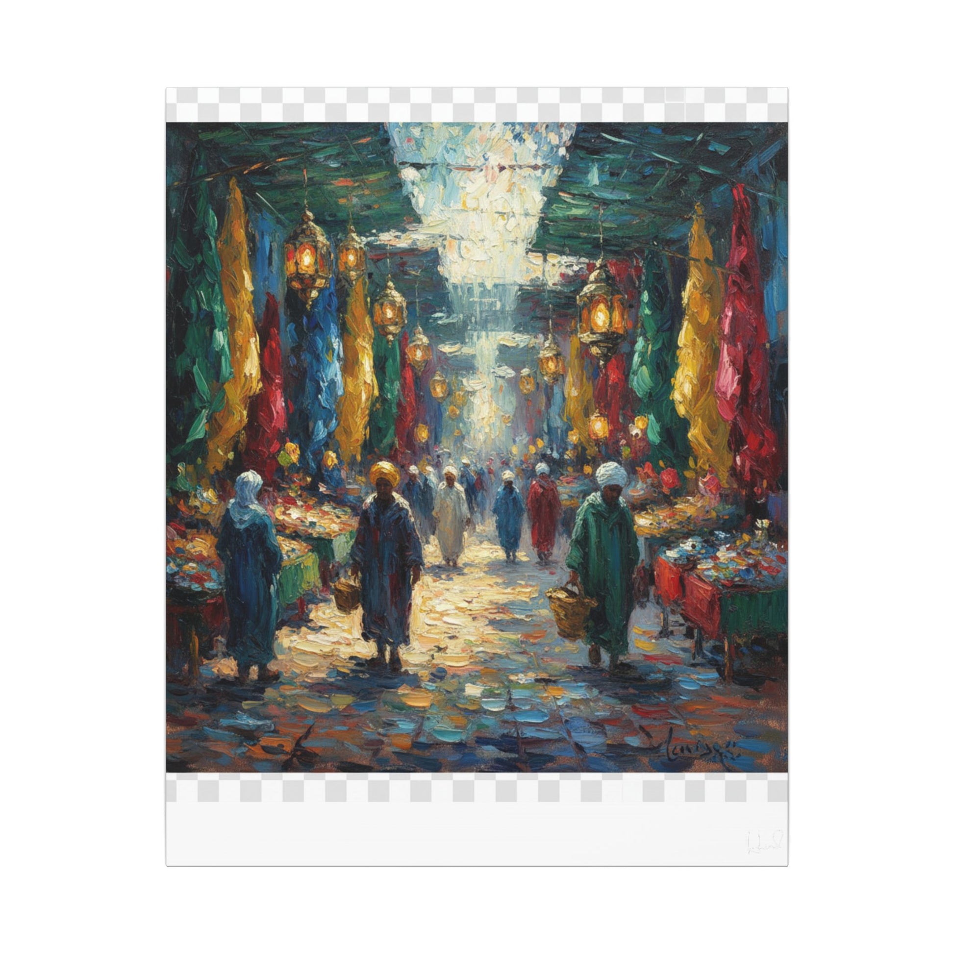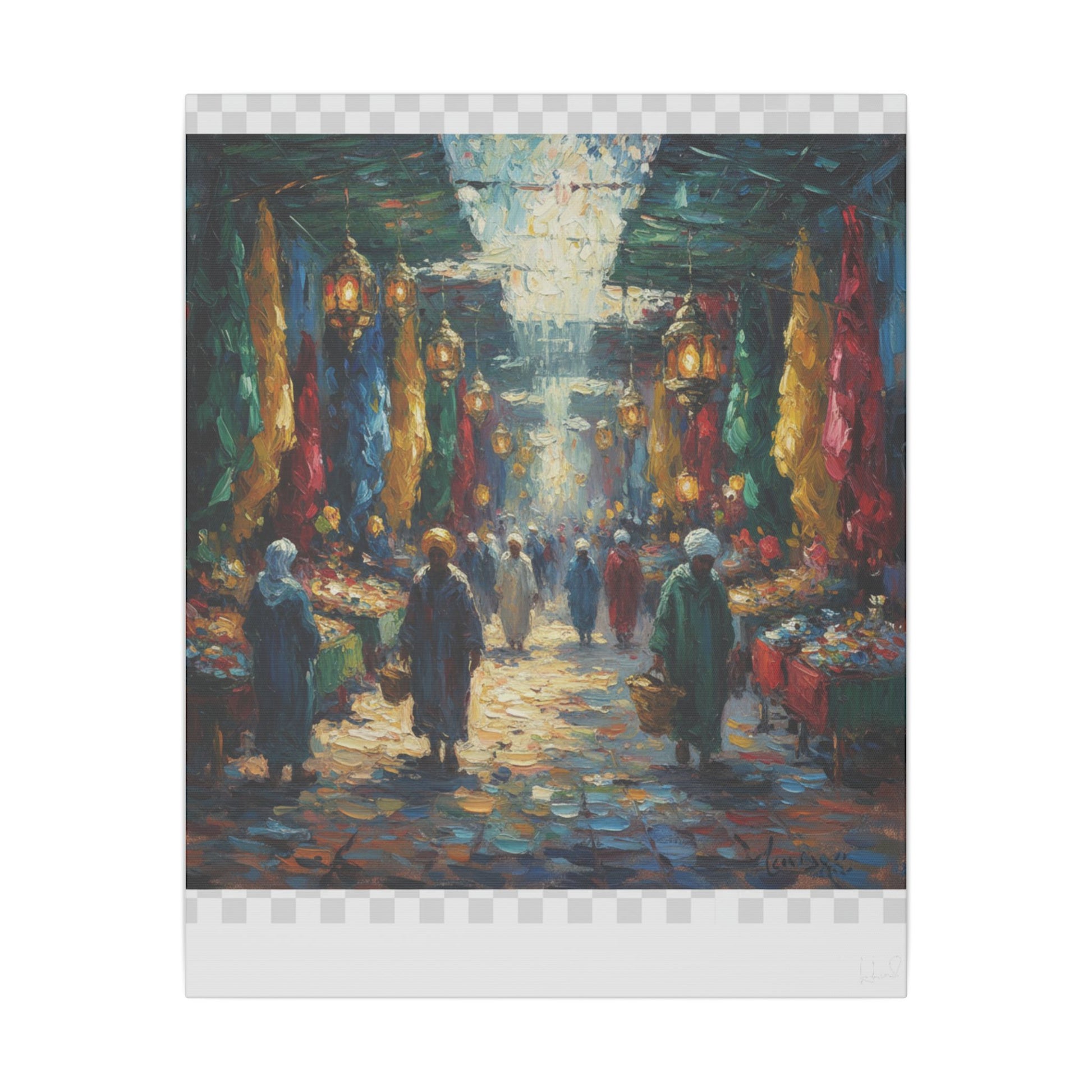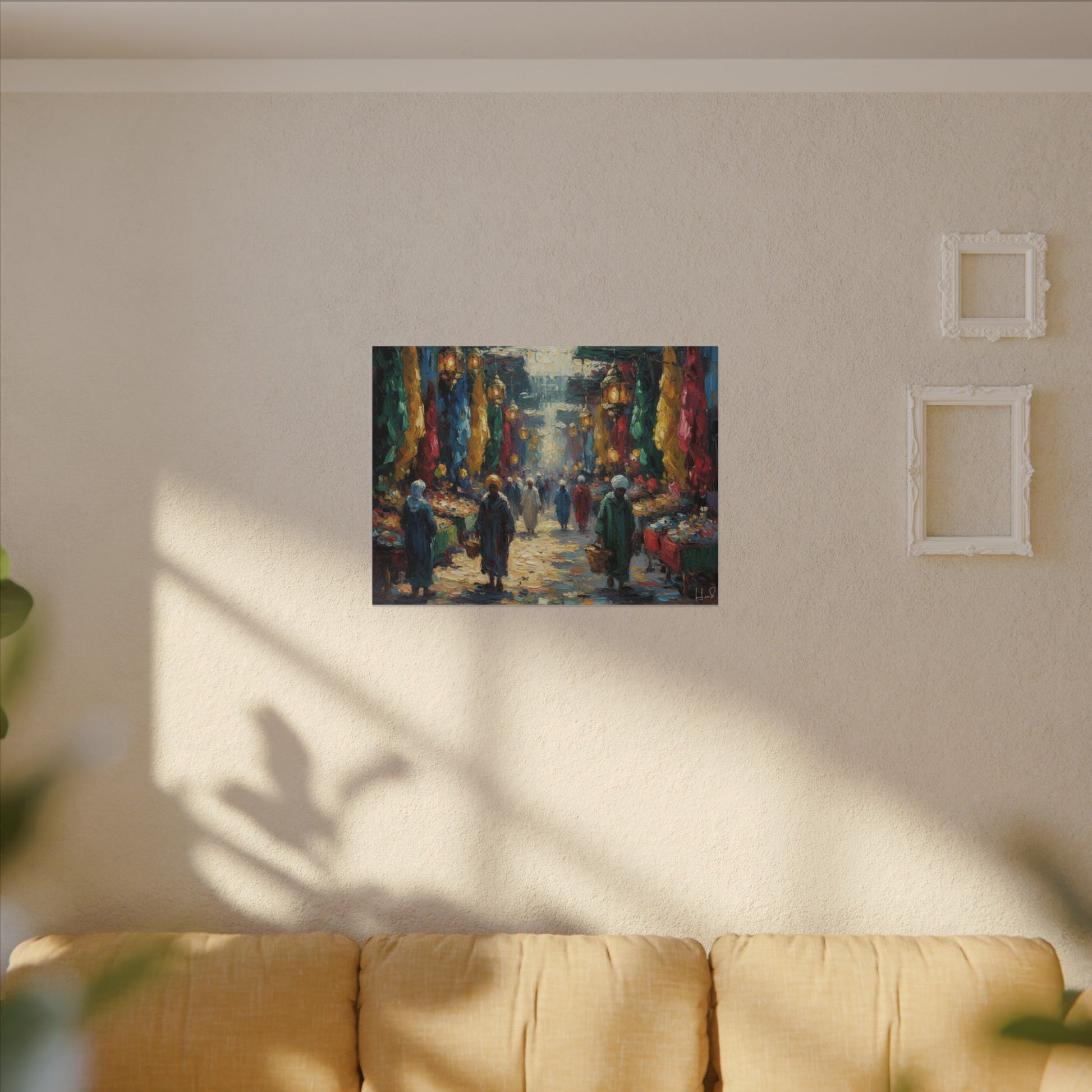A richly textured matte canvas print that brings a bustling market scene to life. Thick, painterly brushstrokes and warm, jewel-toned colors create a sense of movement — lanterns glowing, fabrics billowing, figures drifting through sunlit alleys. Stretched on a 0.75" pine frame with a durable, eco-conscious canvas and archival latex inks, this piece reads like a memory: intimate, vibrant, and quietly traveled. The subtle matte finish keeps reflections low so the mood and texture remain the focus whether hung in a hallway, study, or living room.