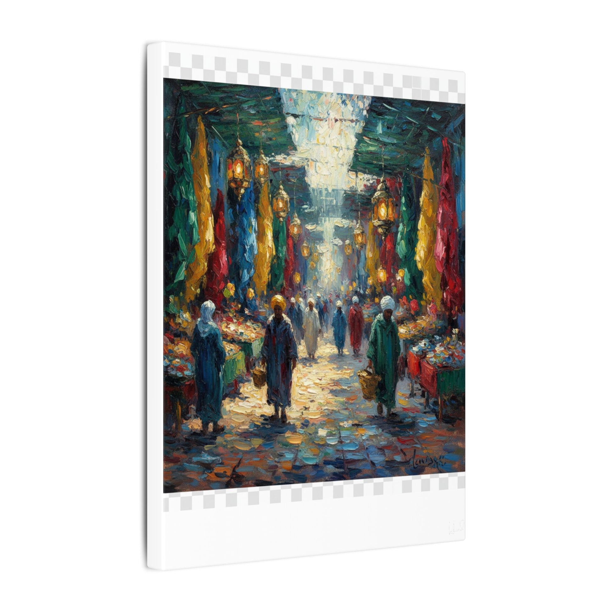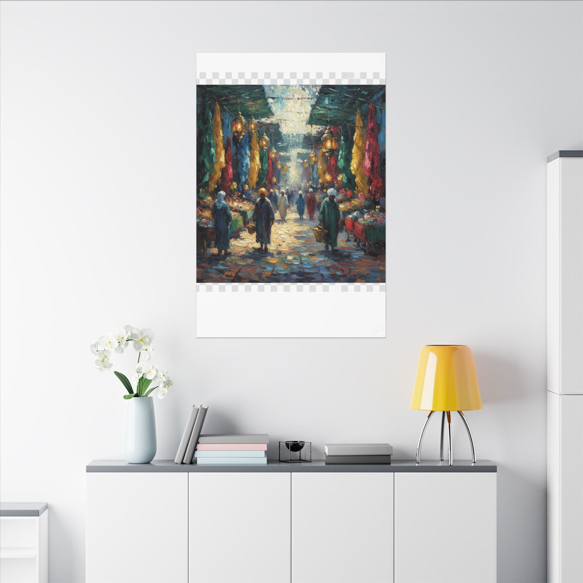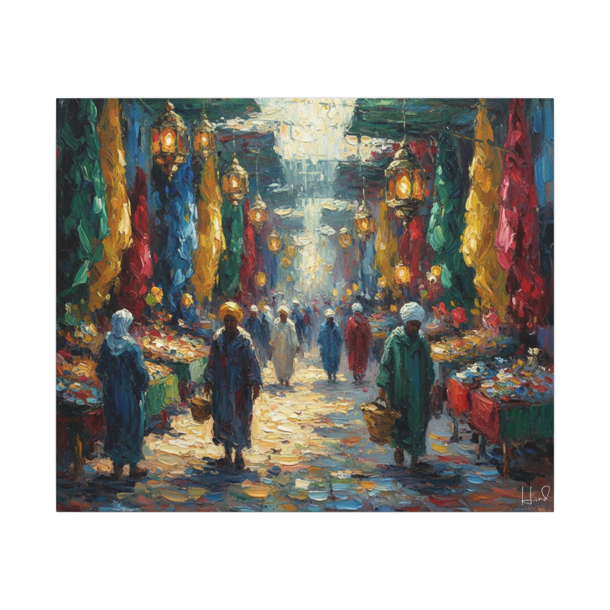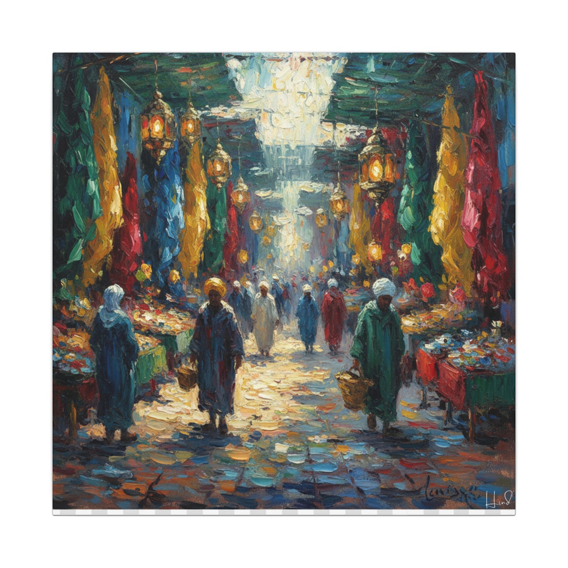 A richly textured matte canvas print that brings a bustling market scene to life. Thick, painterly brushstrokes and warm, jewel-toned colors create a sense of movement — lanterns glowing, fabrics billowing, figures drifting through sunlit alleys. Stretched on a 0.75" pine frame with a durable, eco-conscious canvas and archival latex inks, this piece reads like a memory: intimate, vibrant, and quietly traveled. The subtle matte finish keeps reflections low so the mood and texture remain the focus whether hung in a hallway, study, or living room.