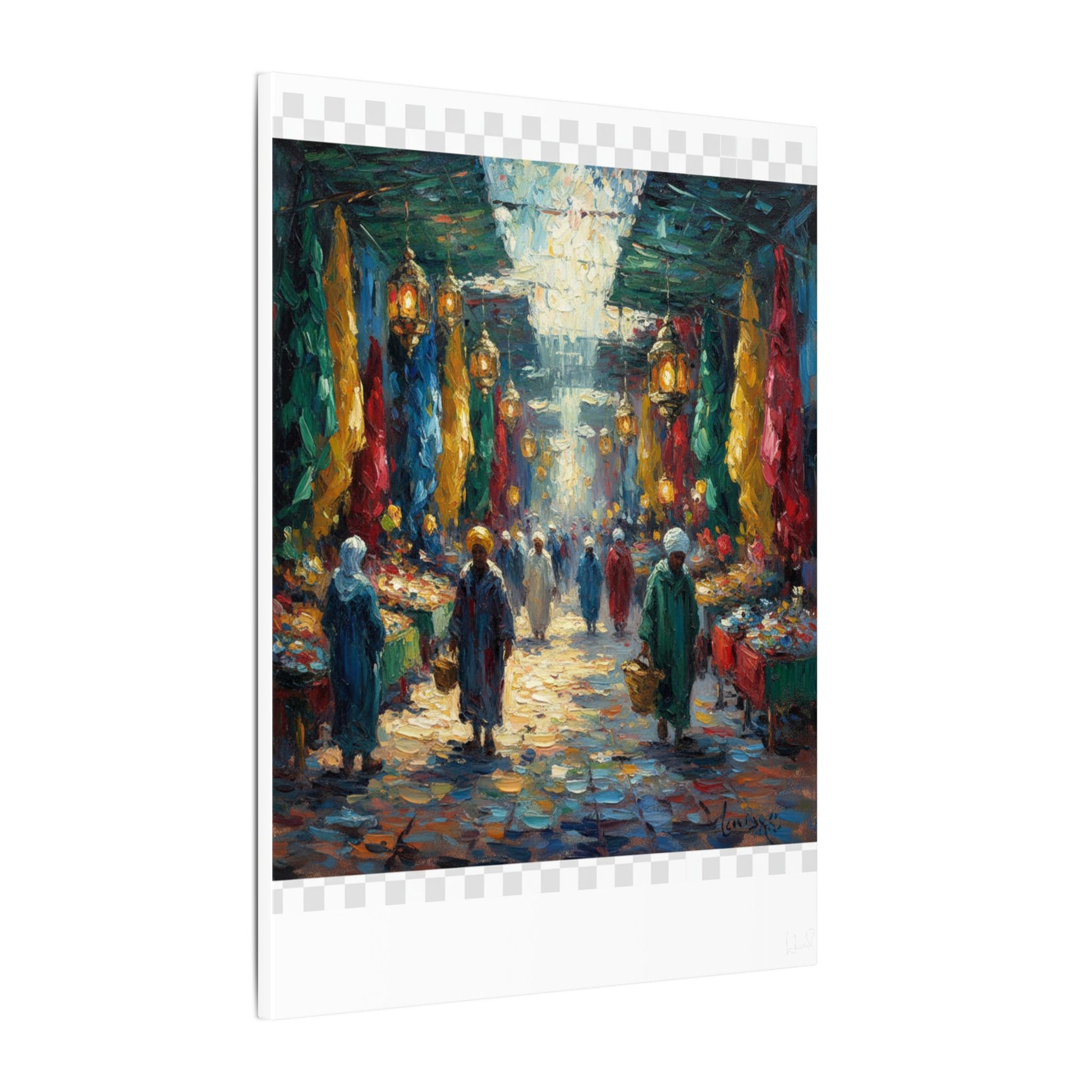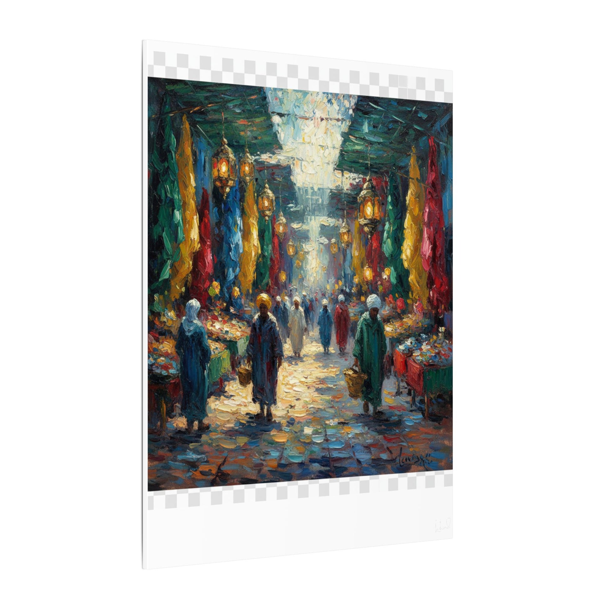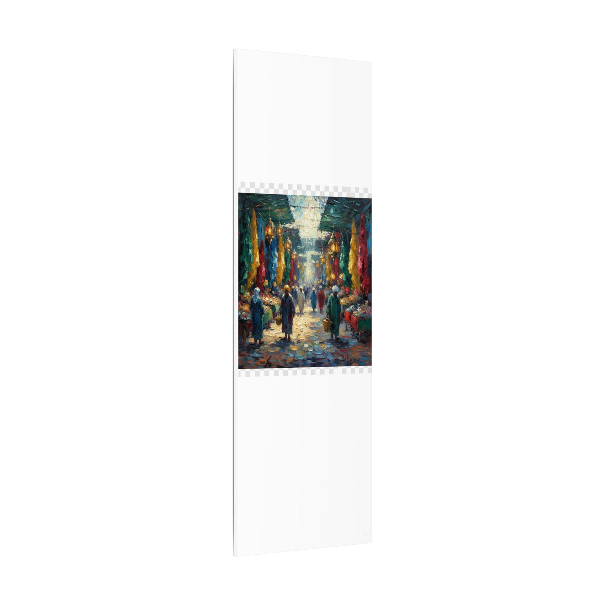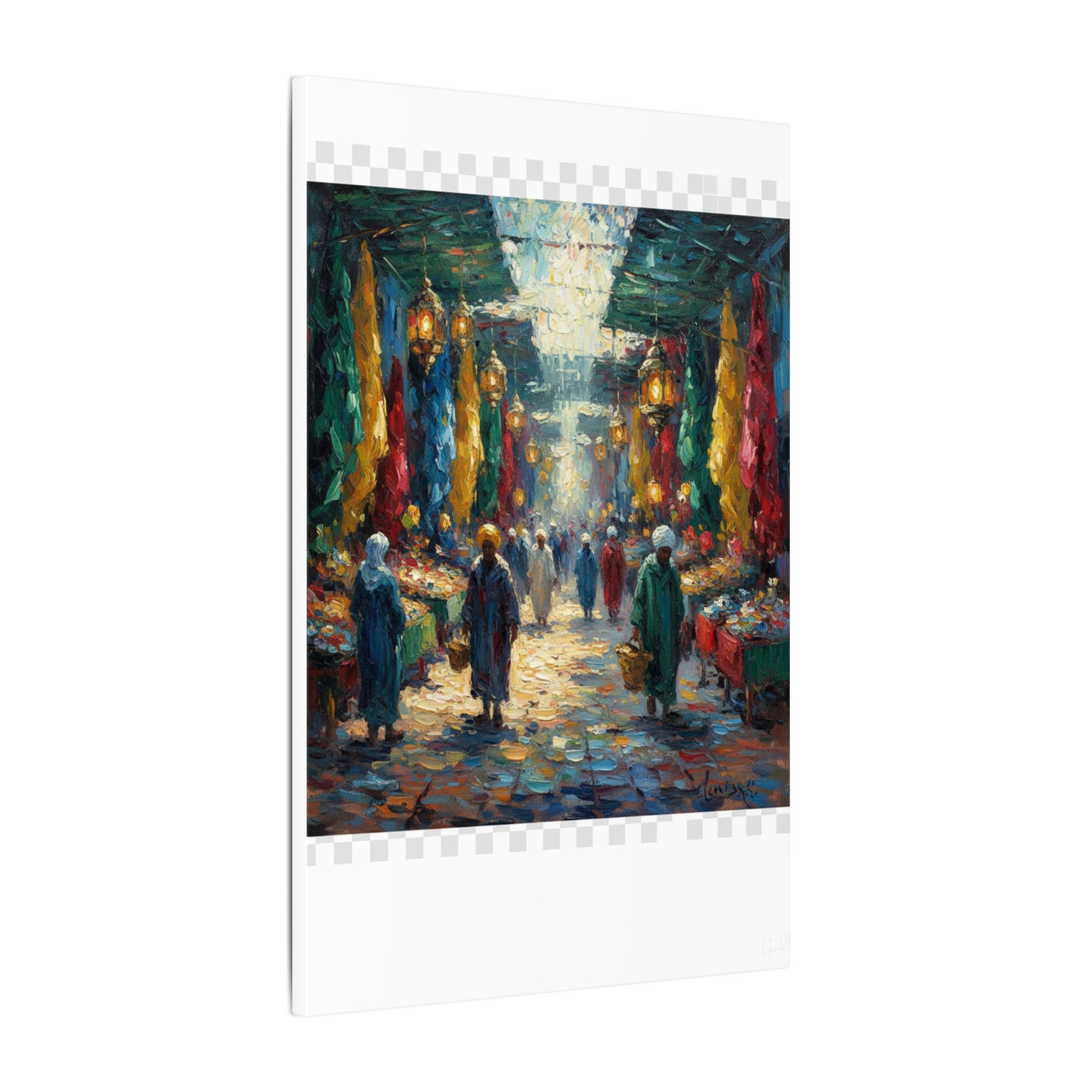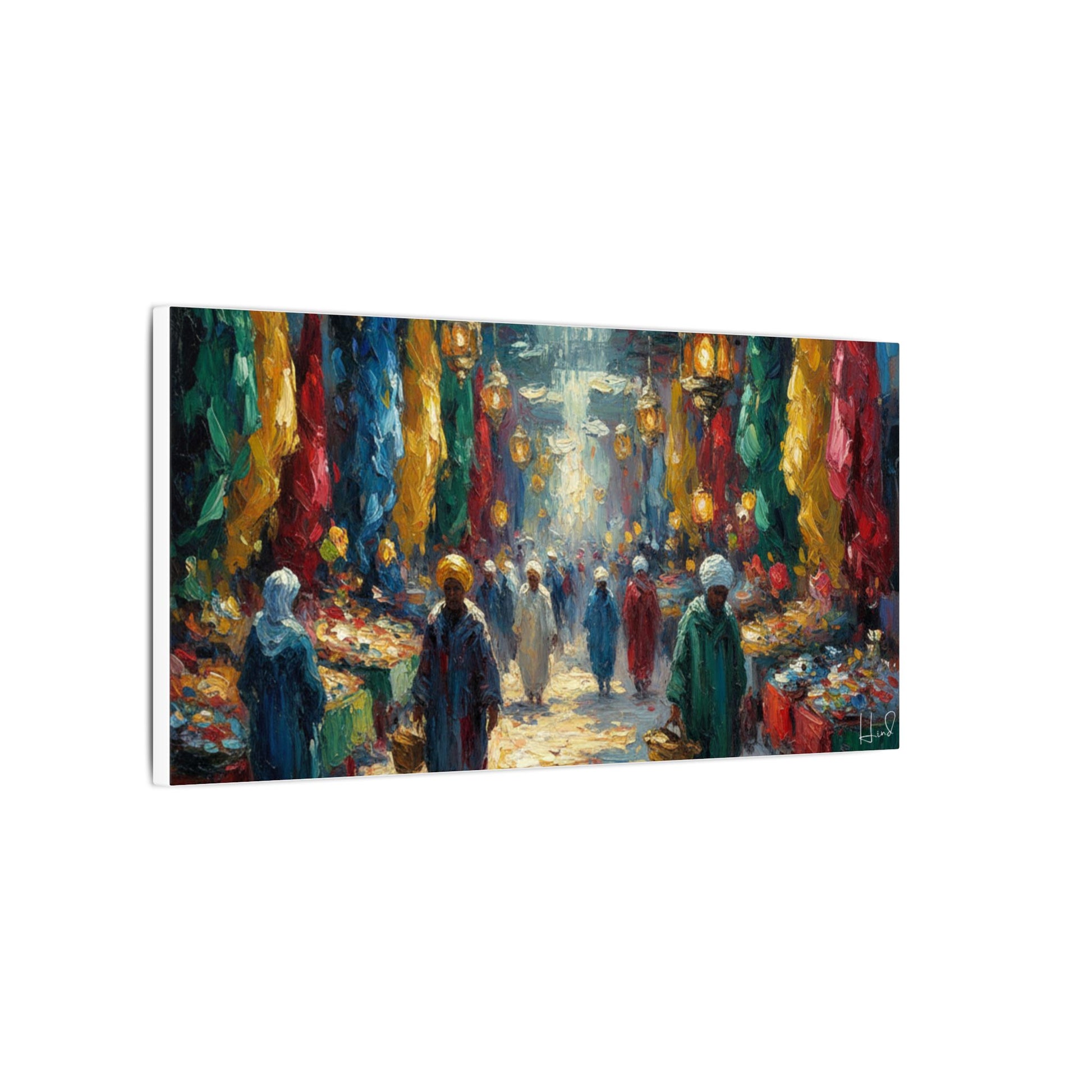 A richly textured matte canvas print that brings a bustling market scene to life. Thick, painterly brushstrokes and warm, jewel-toned colors create a sense of movement — lanterns glowing, fabrics billowing, figures drifting through sunlit alleys. Stretched on a 0.75" pine frame with a durable, eco-conscious canvas and archival latex inks, this piece reads like a memory: intimate, vibrant, and quietly traveled. The subtle matte finish keeps reflections low so the mood and texture remain the focus whether hung in a hallway, study, or living room.