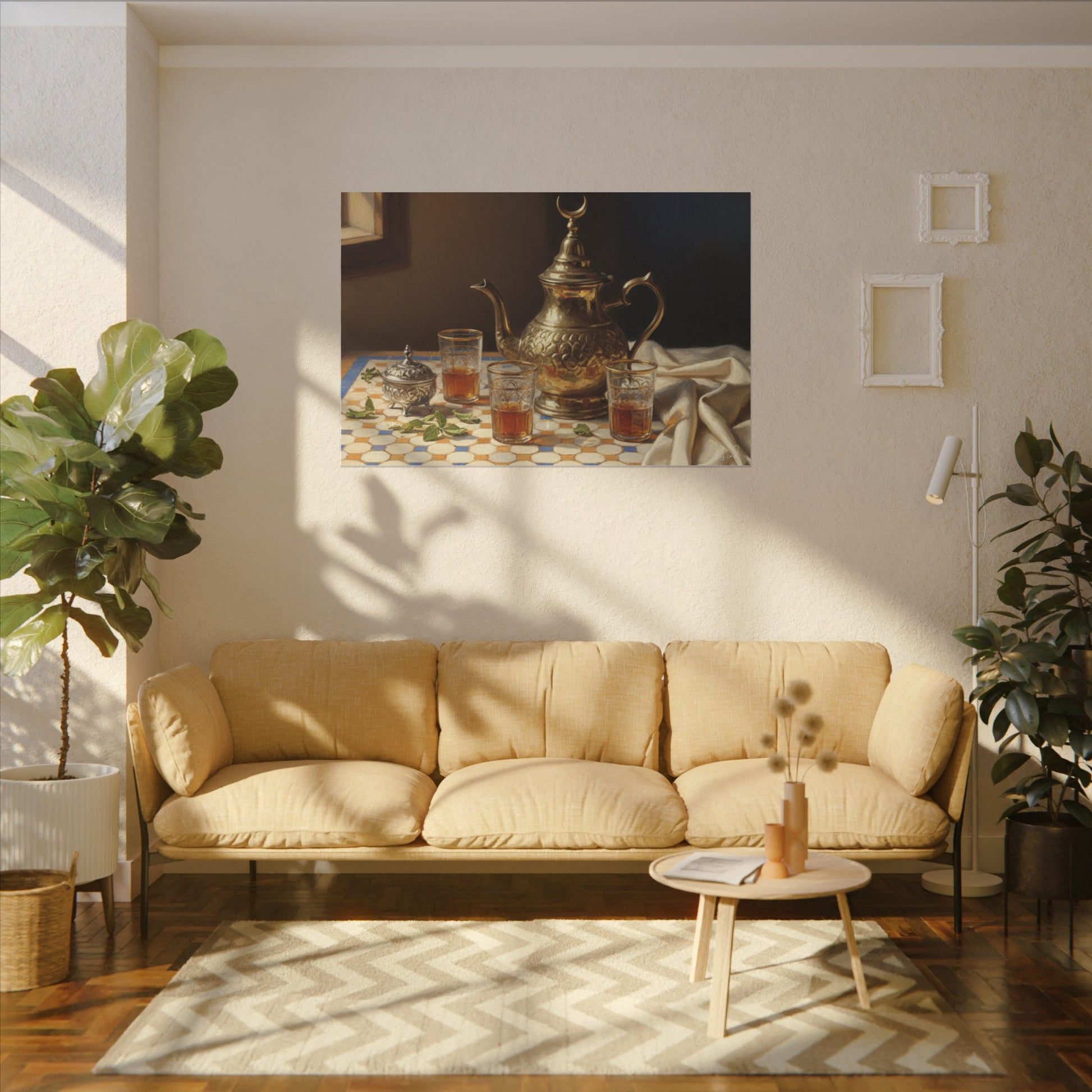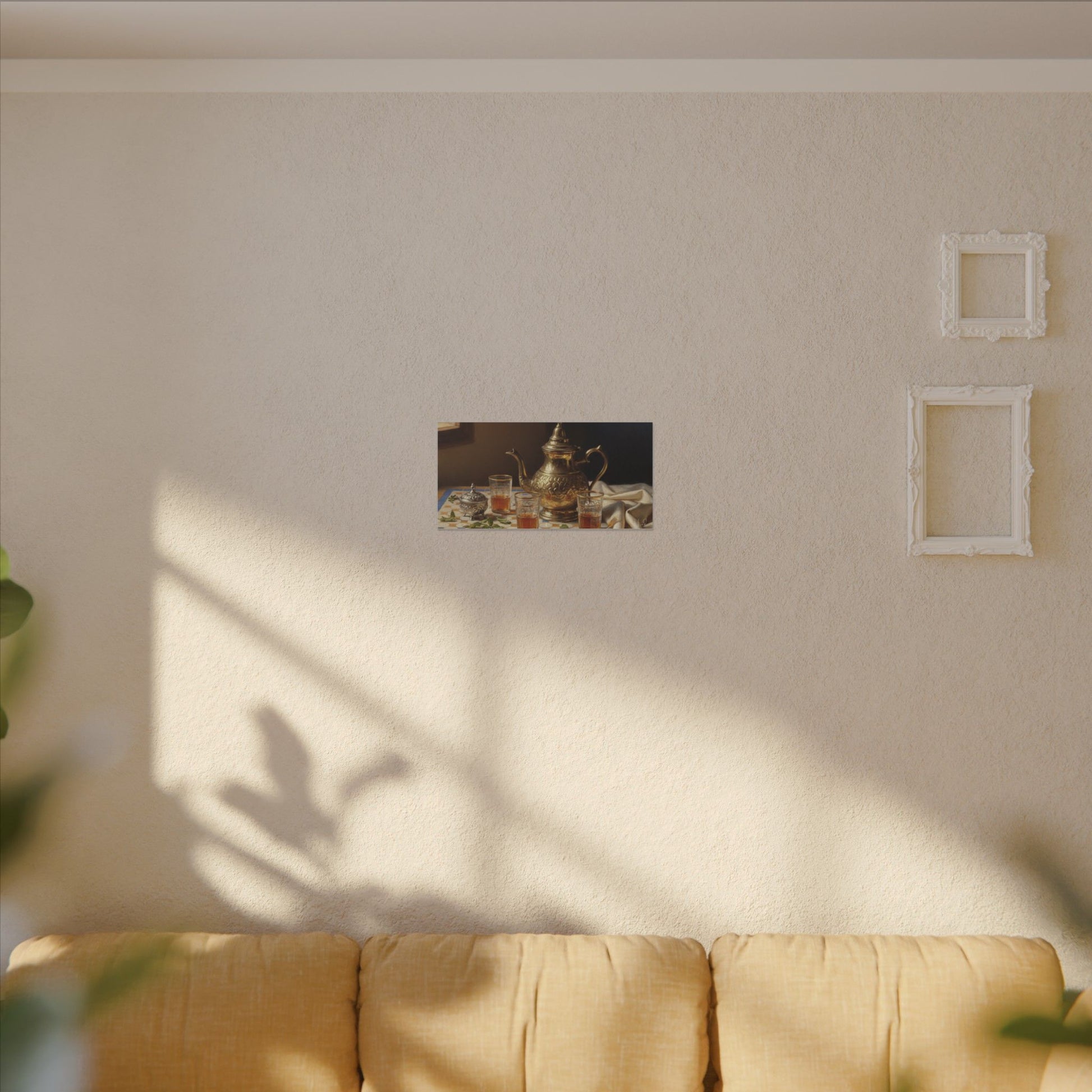 Warm light spills across a tiled tabletop, catching the gleam of an ornate brass teapot and the amber glow of poured tea. This stretched matte canvas brings that quiet moment into your home — a study in texture and stillness where metal, glass and draped fabric meet geometric tile. Hang it above a reading nook, in a cozy kitchen corner, or beside a window where afternoon sun can echo the painting’s glow. The subtle matte finish keeps reflections low and invites a closer look at the brushwork and delicate highlights. It’s for people who collect calm: those who savor slow evenings, ritual tea breaks, and the layered stories a single table can tell.
