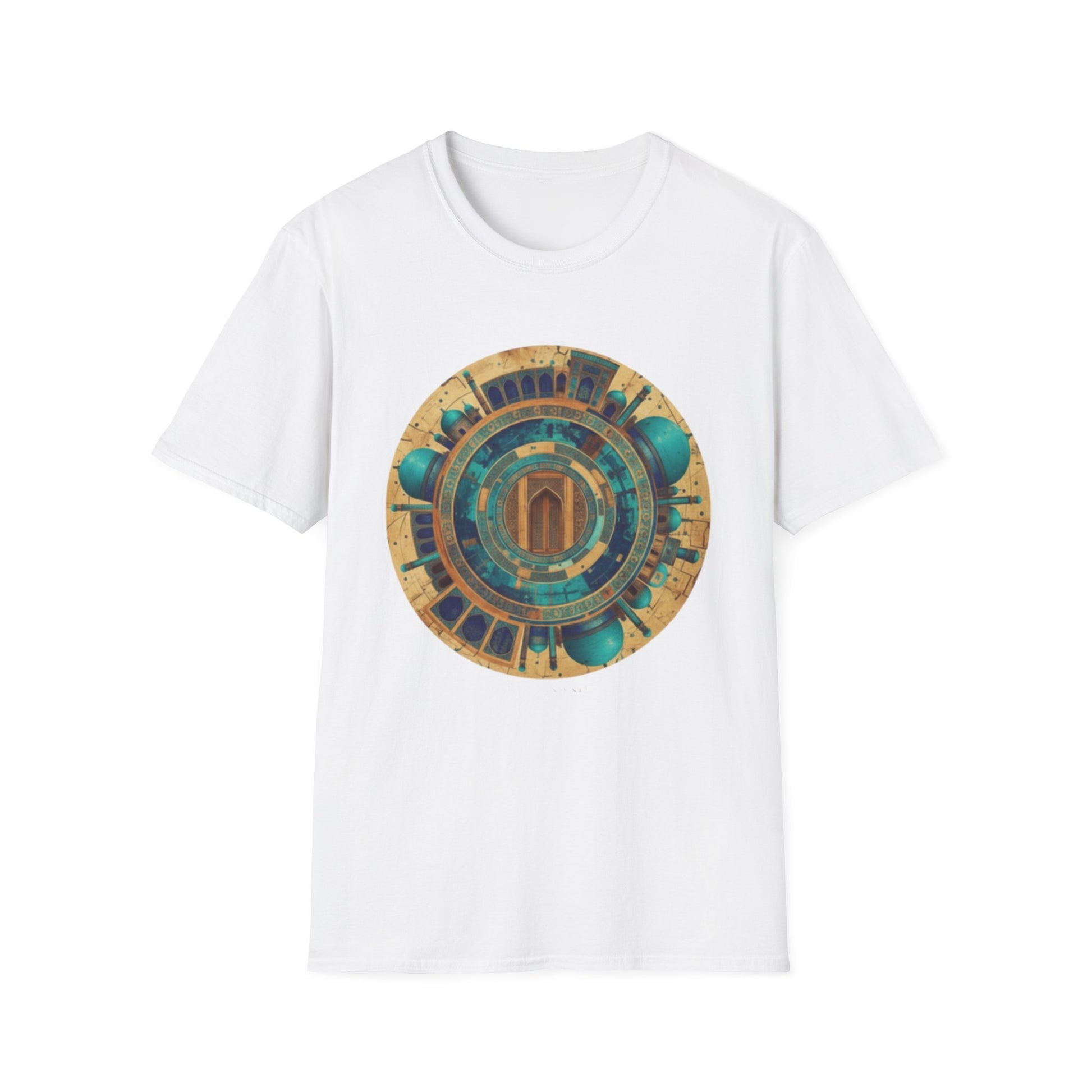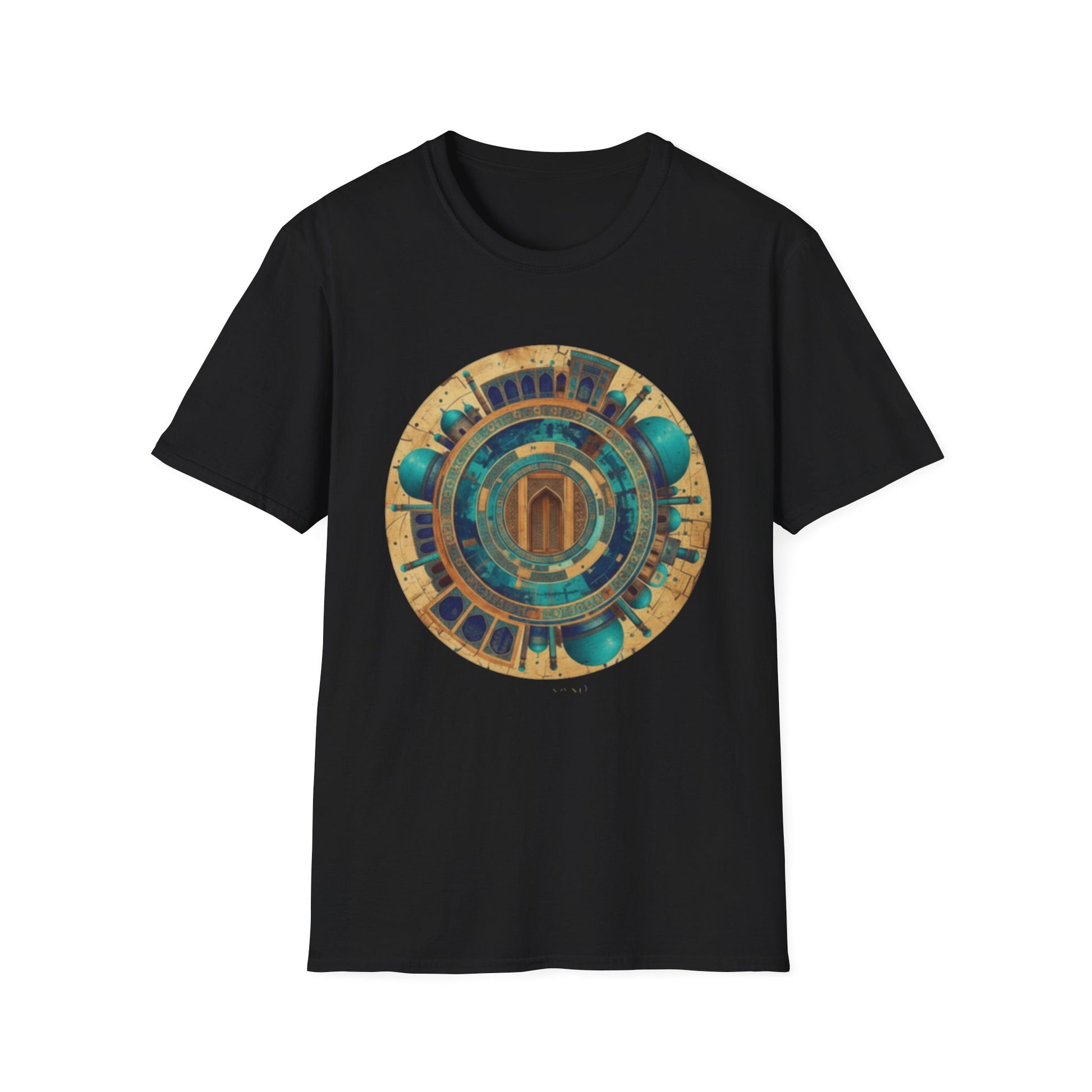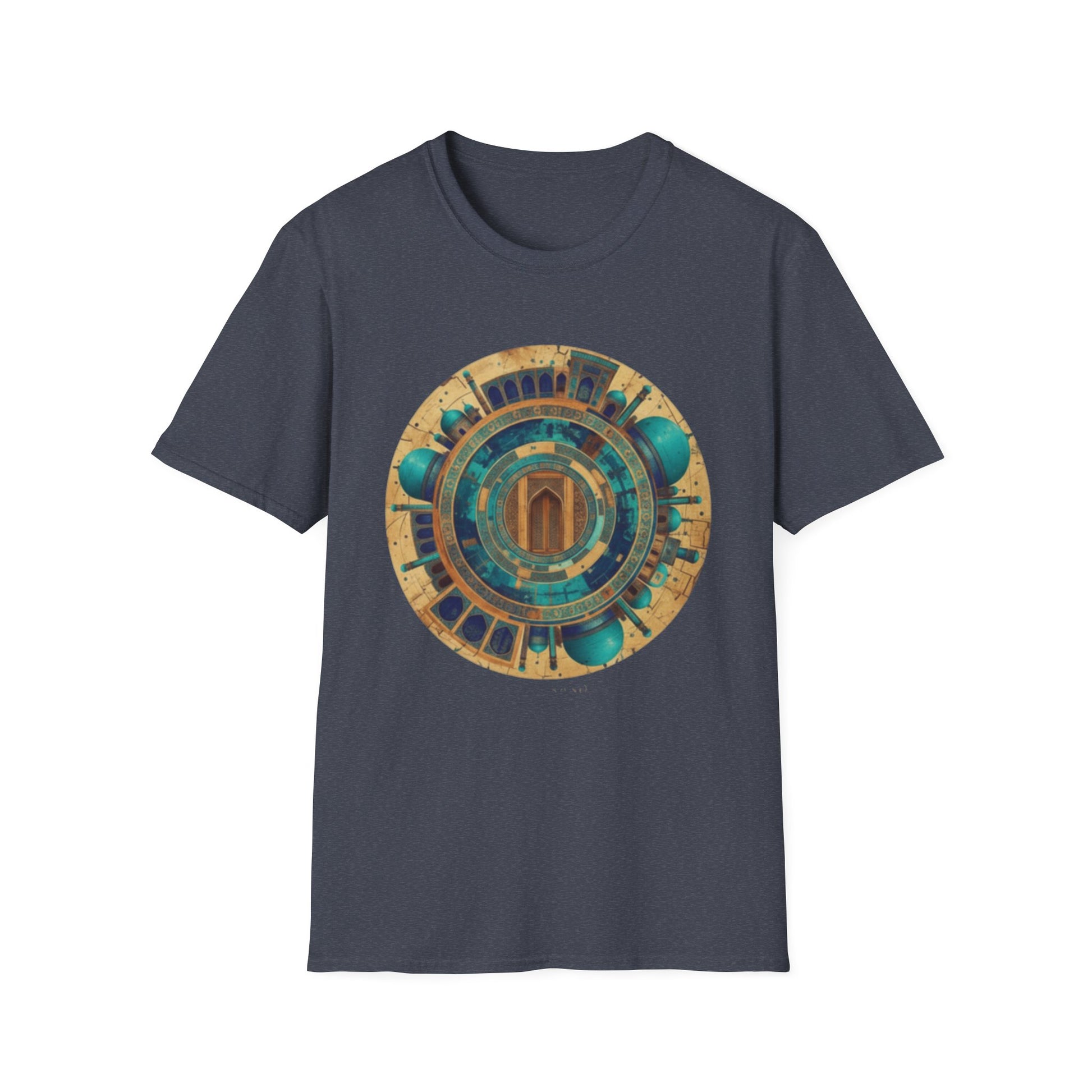 This lightweight cotton tee wears like a quiet story. At its center sits a circular, teal-and-gold mandala—part architectural blueprint, part weathered coin—calling to anyone who loves layered textures and subtle symbolism. The classic crew cut and clean silhouette let the art take the stage while remaining easy to layer under a jacket or wear alone on warm days. It settles like a familiar companion for city wanderers, studio makers, and weekend archivists who collect experiences more than things. The shirt’s soft hand and breathable feel invite long afternoons of sketching, wandering markets, or settling in with a record player and warm tea. Over time the printed motif gains that lived-in charm that feels less like a brand and more like a personal emblem.