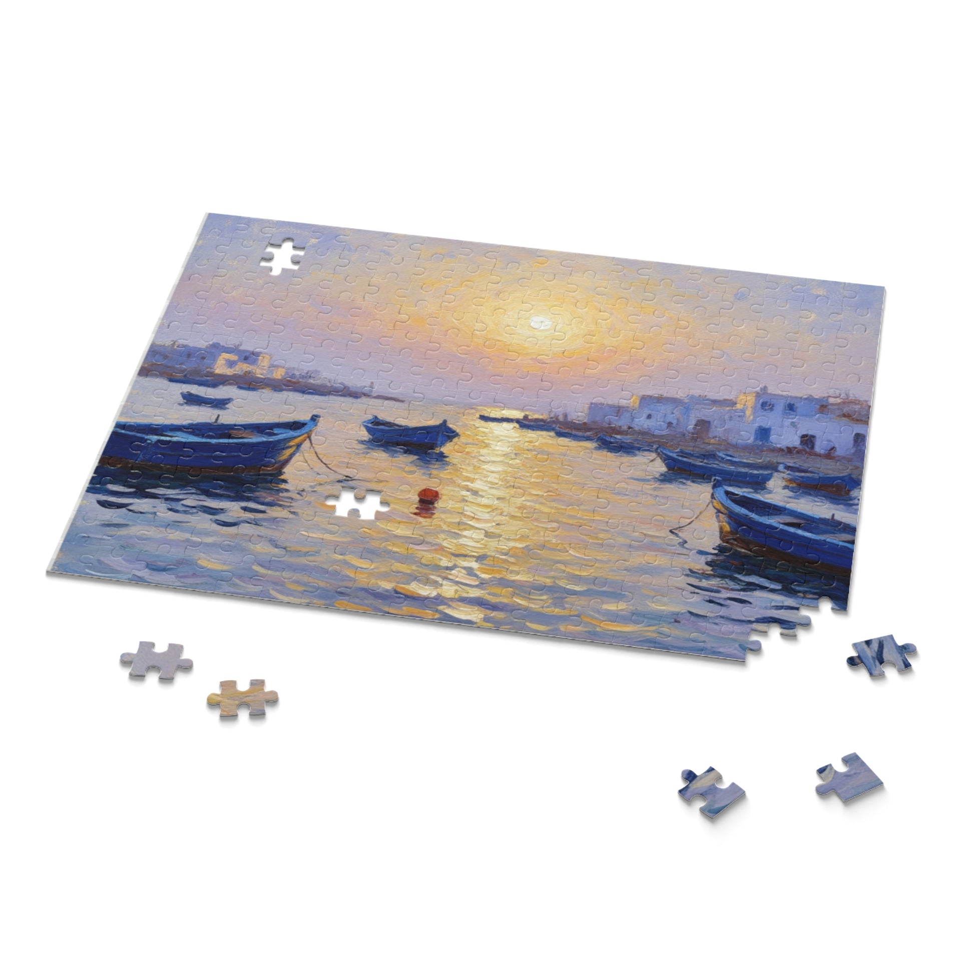 A serene Mediterranean sunset captured as a tactile, screen-worthy puzzle. Soft lavenders and warm golds glide across glossy chipboard pieces, guiding your eye from sleepy fishing boats to the sun’s reflection dancing on the water. As you assemble each section, the scene unfolds like a quiet evening at the harbor — calm waves, salt air, and the slow hush of twilight. This puzzle turns a peaceful moment into a focused, restorative activity you can return to again and again, then keep on display in its gift-ready box.