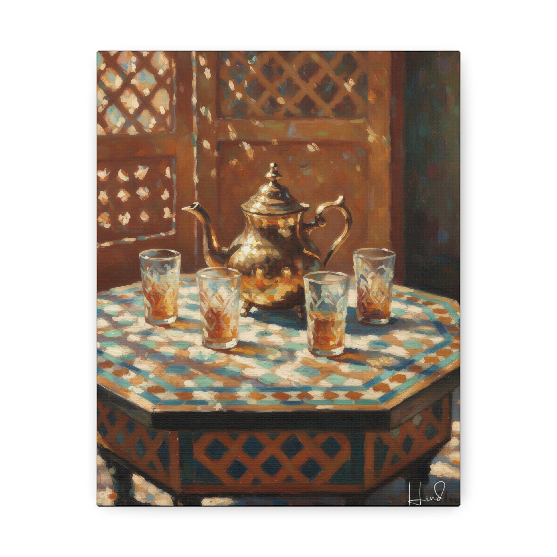 Sunlit tea and mosaic — this stretched canvas brings a quiet moment into your room. Warm amber tones spill across a low mosaic table, catching light through carved screens to illuminate a brass teapot and delicate glasses. The scene feels lived-in and calm: a pause between conversations, slow steam rising, patterned shadows moving with the day. Hang it where morning light or soft lamps can play over the texture — it deepens cozy corners, reading nooks, or a dining alcove and invites anyone who sees it to slow down and stay awhile.