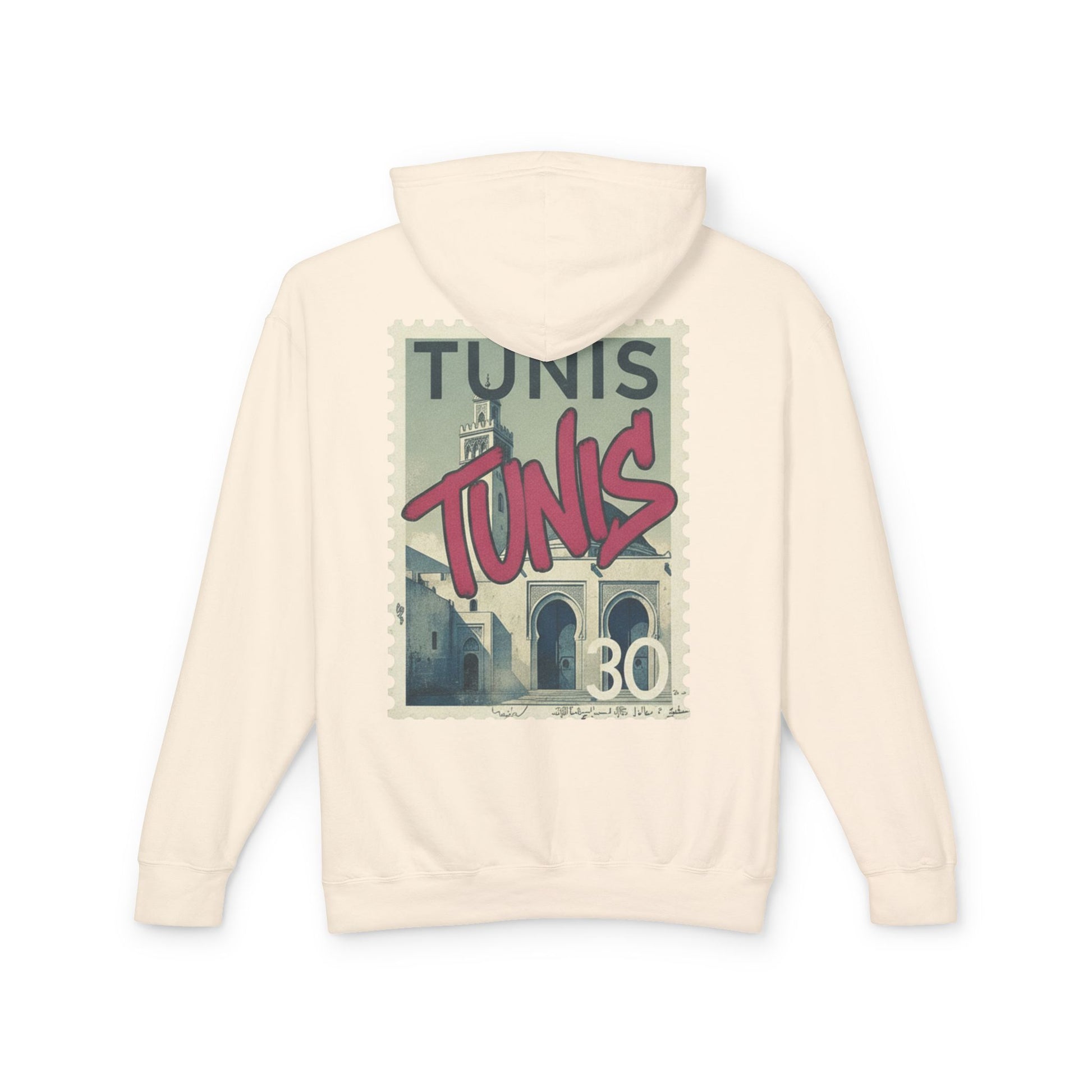 Lightweight, breathable, and quietly stylish — this cotton hooded sweatshirt brings a vintage-travel mood to everyday wear. The soft, ring-spun US cotton feels gentle against the skin while the relaxed cut and rolled-forward shoulders keep movement easy. A jersey-lined hood with a natural flatcord adds a subtle, handcrafted detail. On the back, a retro-stamp illustration of Tunis anchors the piece with wanderlust energy, like the memory of a sunlit courtyard you carry home. Wear it on cool mornings, between flights, or while planning your next escape — it settles in like an old travel journal.