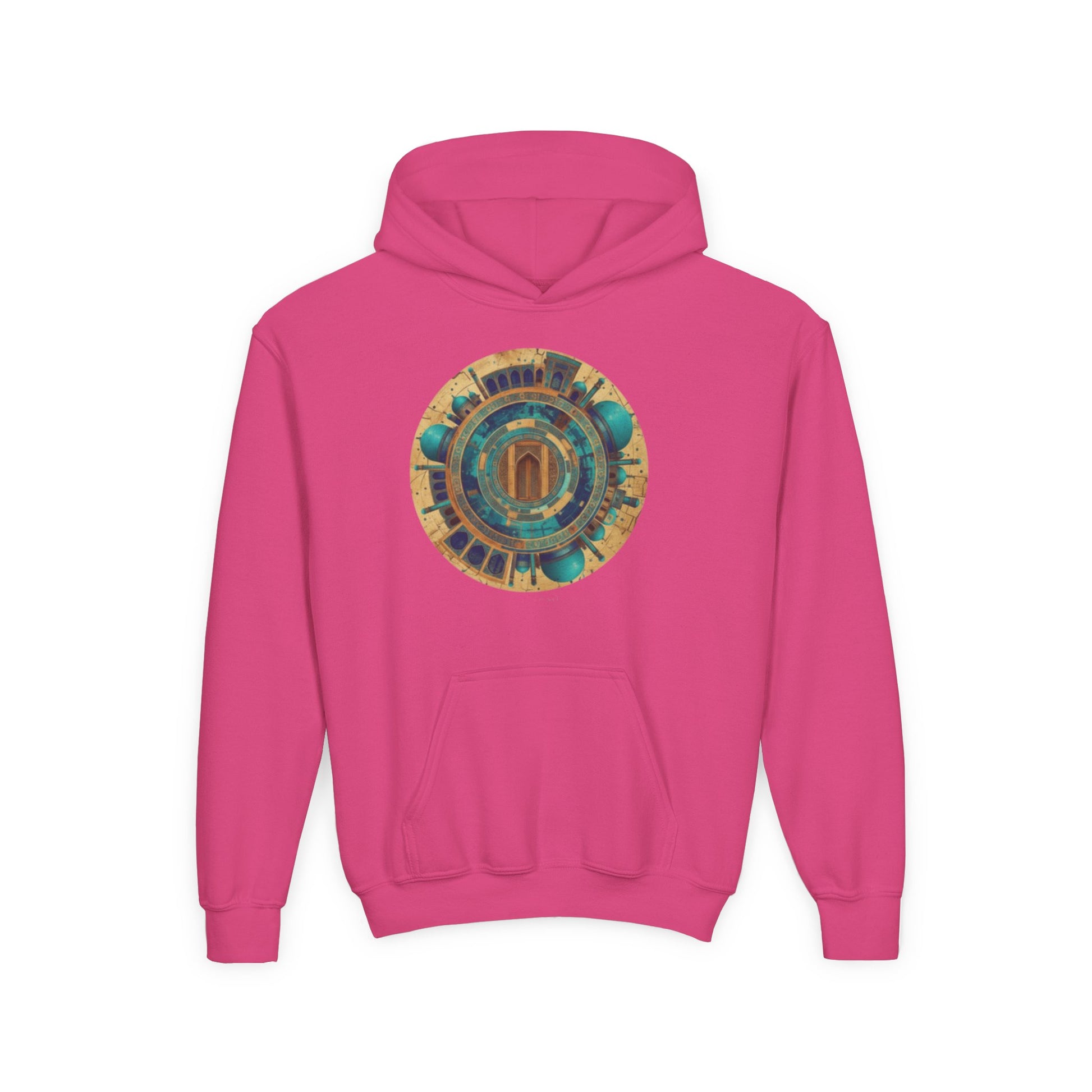 This youth hoodie carries a calm, vintage-tech energy: a circular, teal-and-gold geometric emblem sits over the chest like a small talisman. Soft midweight fabric drapes in a regular fit, giving kids the freedom to move without feeling swallowed. The kangaroo pocket keeps hands warm and holds small treasures from the day. Thoughtful construction—twill necktape, sewn-in label, and durable 50/50 cotton-poly blend—means this hoodie will survive playground adventures and repeated washes while keeping that printed artwork crisp. Subtle wrist prints and optional chest embroidery add quiet character for kids who like things that feel curated rather than loud. Made to meet strict safety standards and sized for children, it’s a wearable piece that blends cozy comfort with a touch of artisan style.